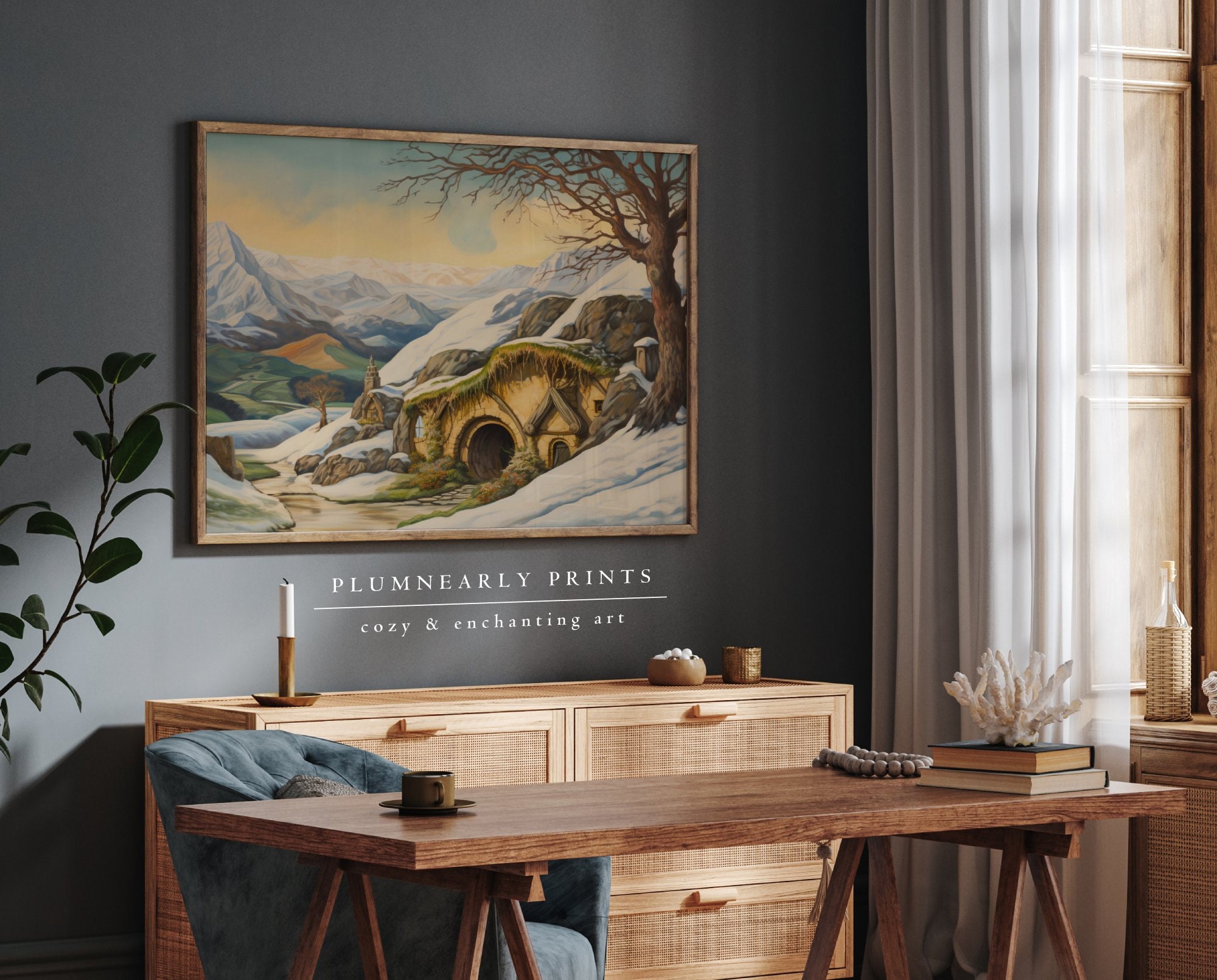 Hobbit House Painting Art Print Poster, The Shire Rustic Mountain Village Canvas Print, Countryside Landscape Wall Art, Cozy Cottage Decor