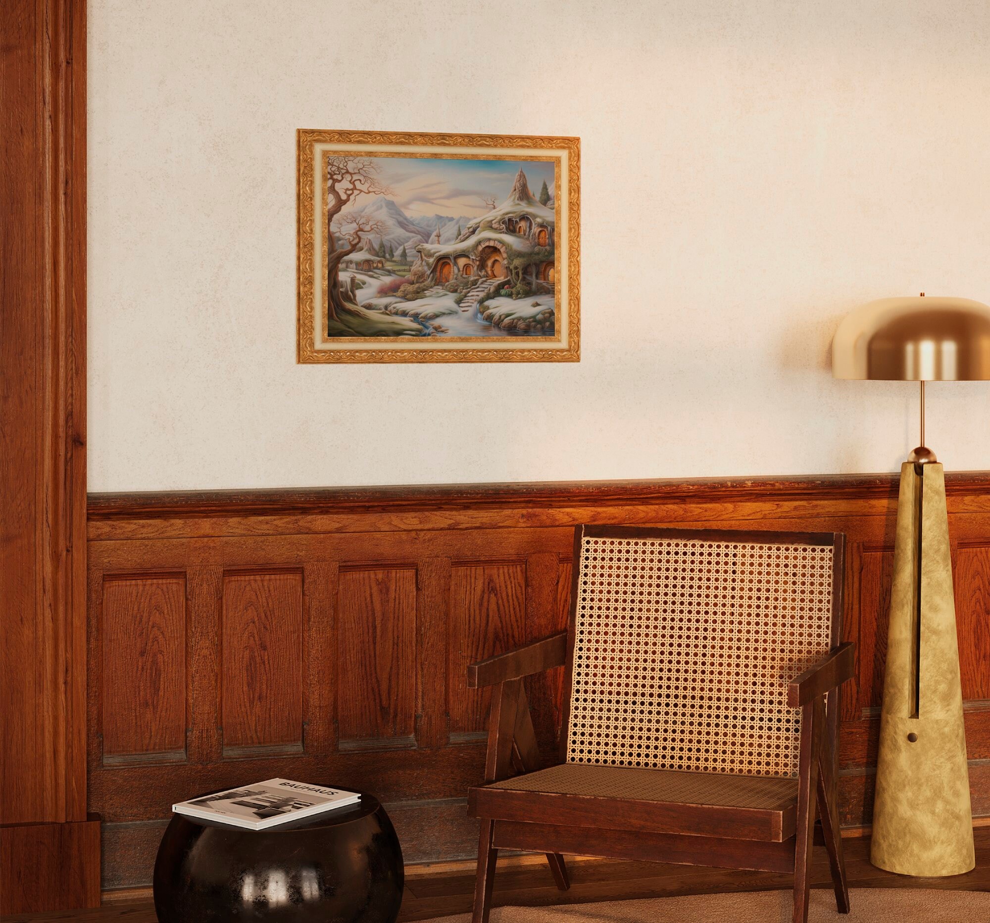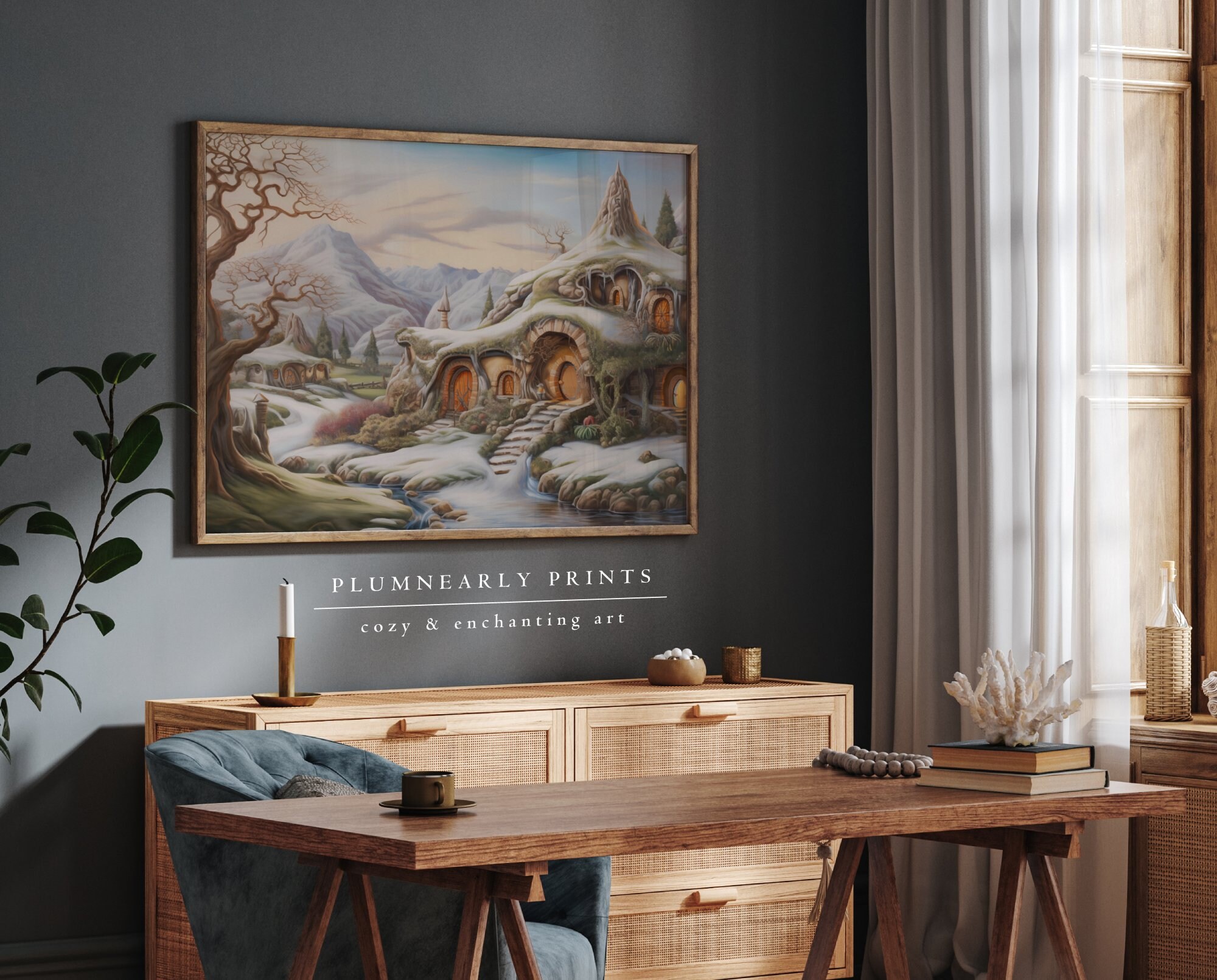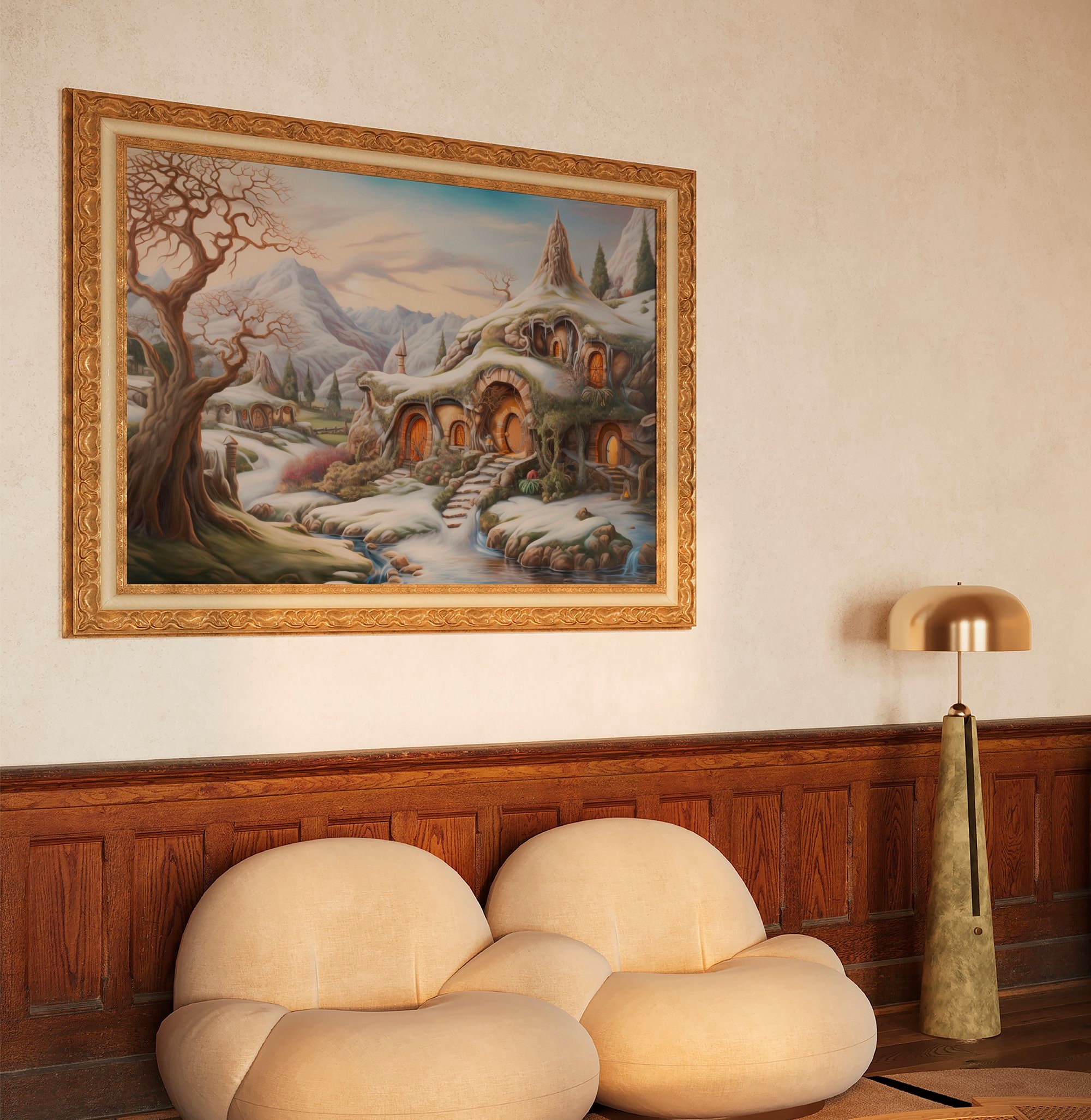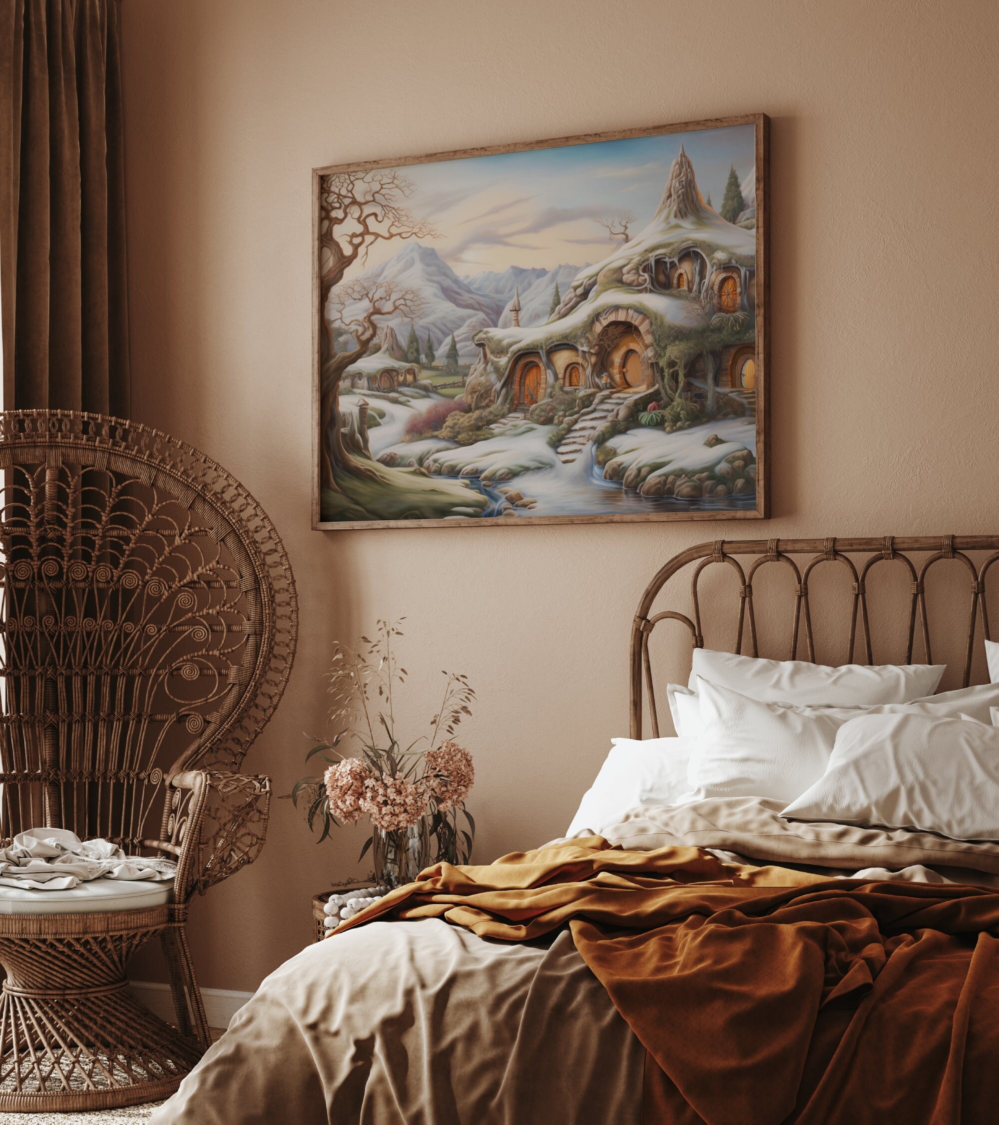 Transform your space into a magical retreat with this enchanting fantasy landscape wall art. This stunning canvas print features a whimsical fairytale scene complete with mystical dwellings, a serene river, and a captivating mountainous backdrop. The warm, inviting colors and intricate details are sure to spark the imagination and bring a touch of fantasy to any room. Perfect for fans of mythical stories, this high-quality wall decor will create a mesmerizing focal point in your living room, bedroom, or office.