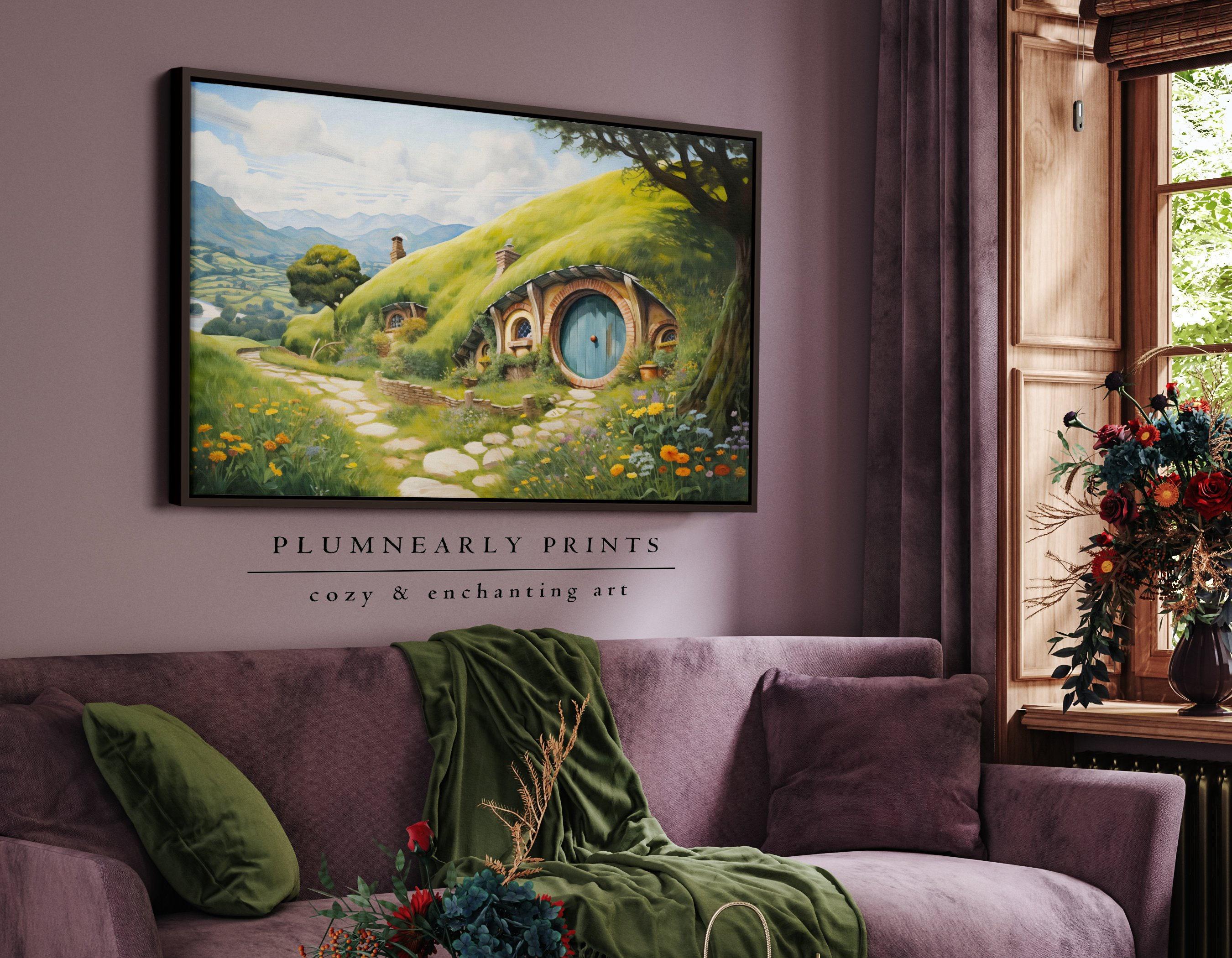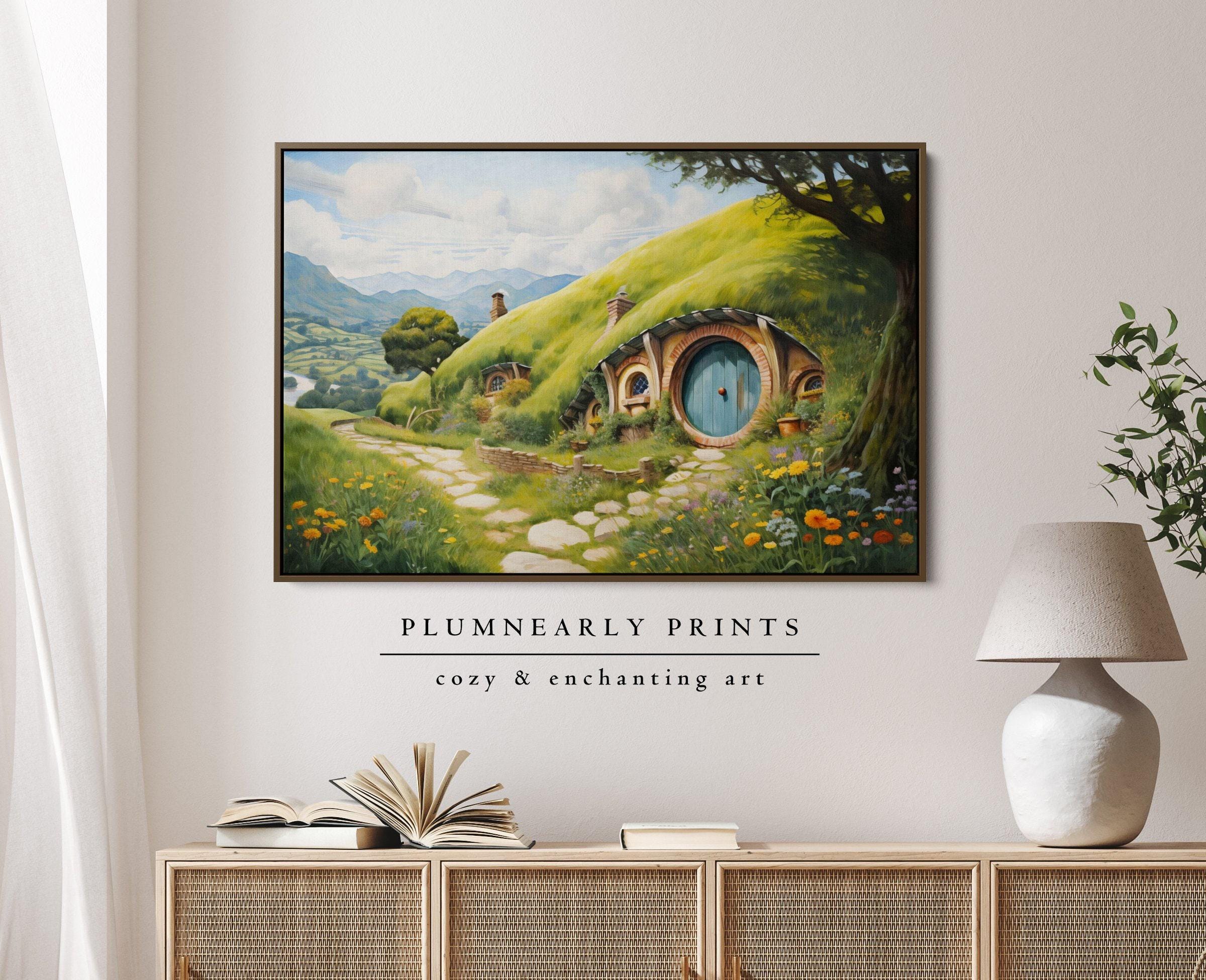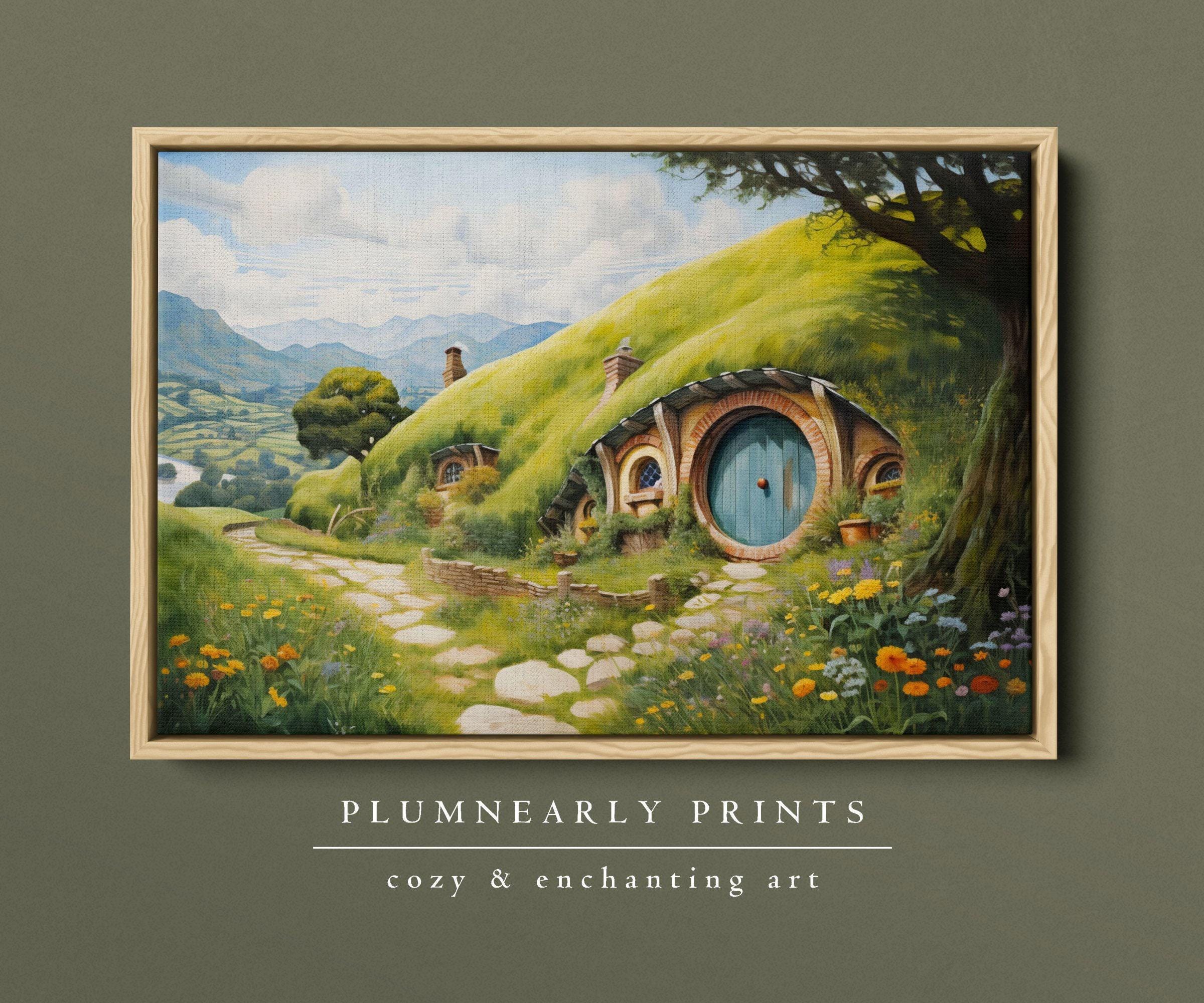 The Shire Oil Painting Framed Canvas. Hobbitcore Decor. Hobbit Hole Landscape Art. Halfling House Wall Art. Cozy Earth Home Canvas Art Print