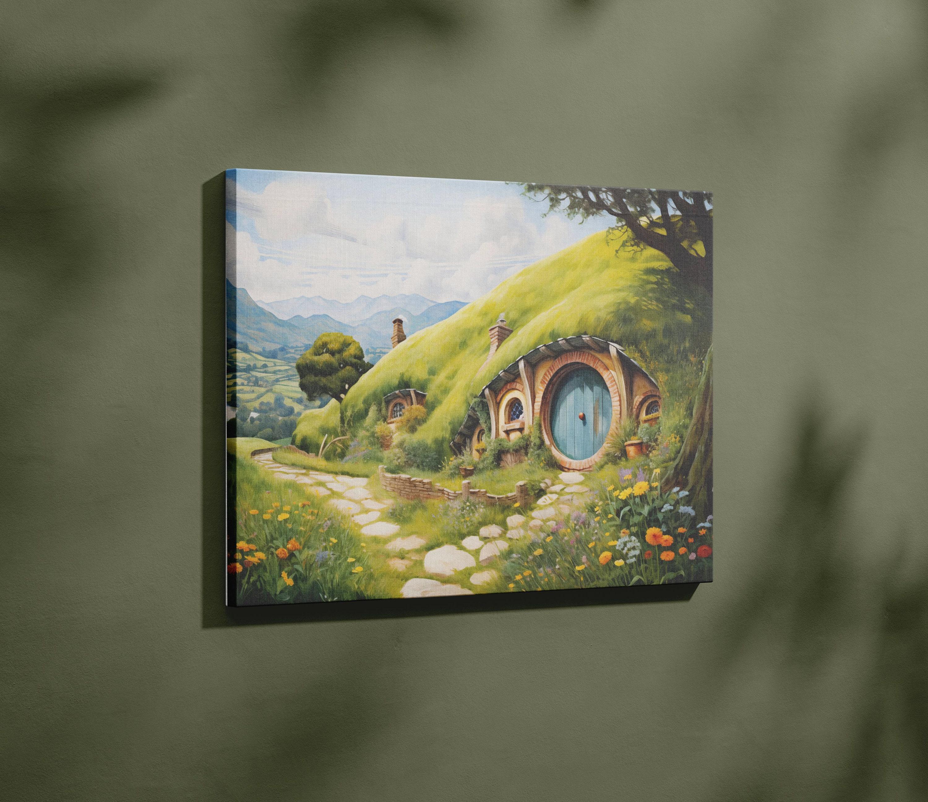 Bring a touch of magic and rustic charm to your home with this beautiful wall art canvas print featuring a cozy hobbit house nestled in a serene mountain landscape. The painting’s warm tones and intricate details create a sense of coziness and wonder, making it a perfect addition to any office, living room, or bedroom decor. Its unique story-telling style creates a sense of cozy comfort and nostalgia for a time gone by. Featuring a hobbit hole with an iconic round hobbit door and half-moon windows, nestled within a lush greenery of trees and grass and rolling hills, this painting will give your home an extra dimension of beauty and charm.