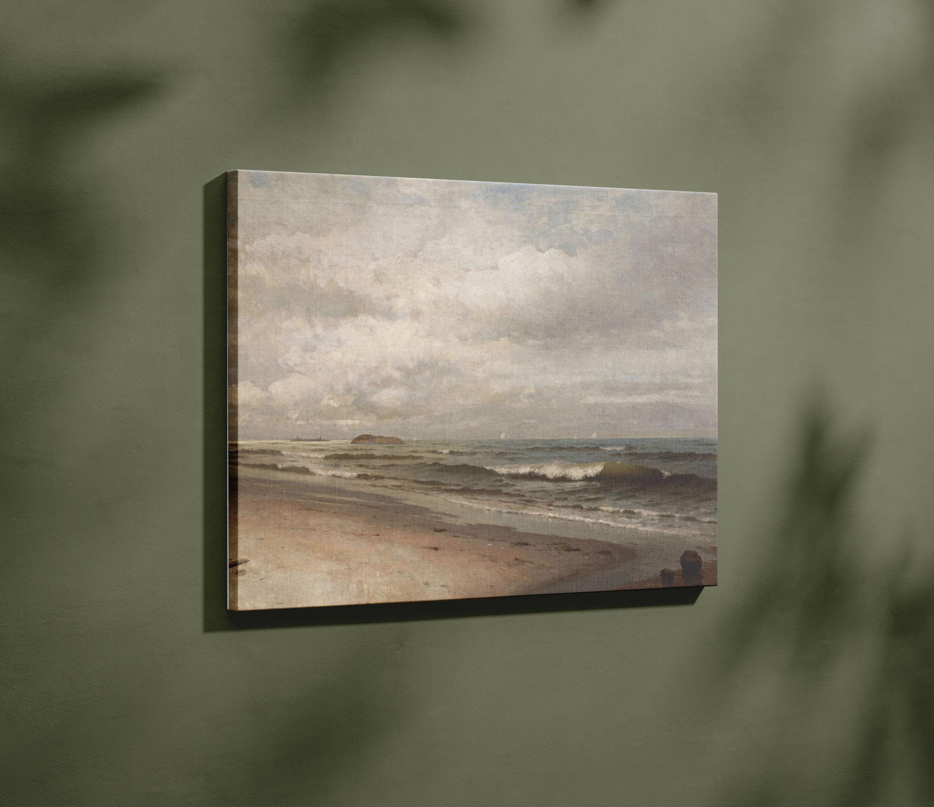 Bring the timeless beauty of the ocean to your home with this exquisite vintage seascape painting print. The classic coastal scene depicts gentle waves lapping onto a deserted beach, with clouds gathering above and ships in the distance, evoking a sense of peace and serenity. This wall art is a perfect addition to any room with a nautical theme or for anyone who loves the sea.