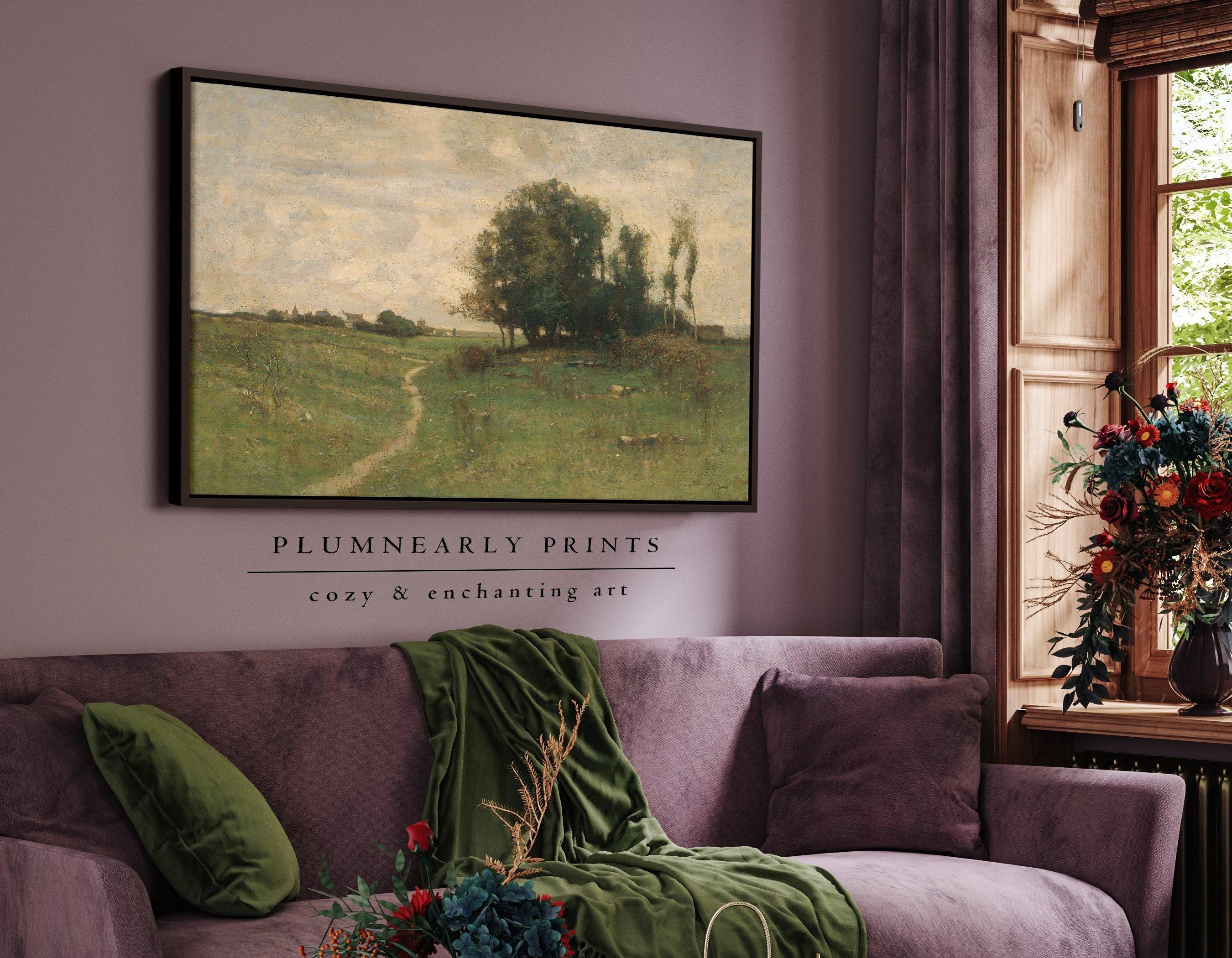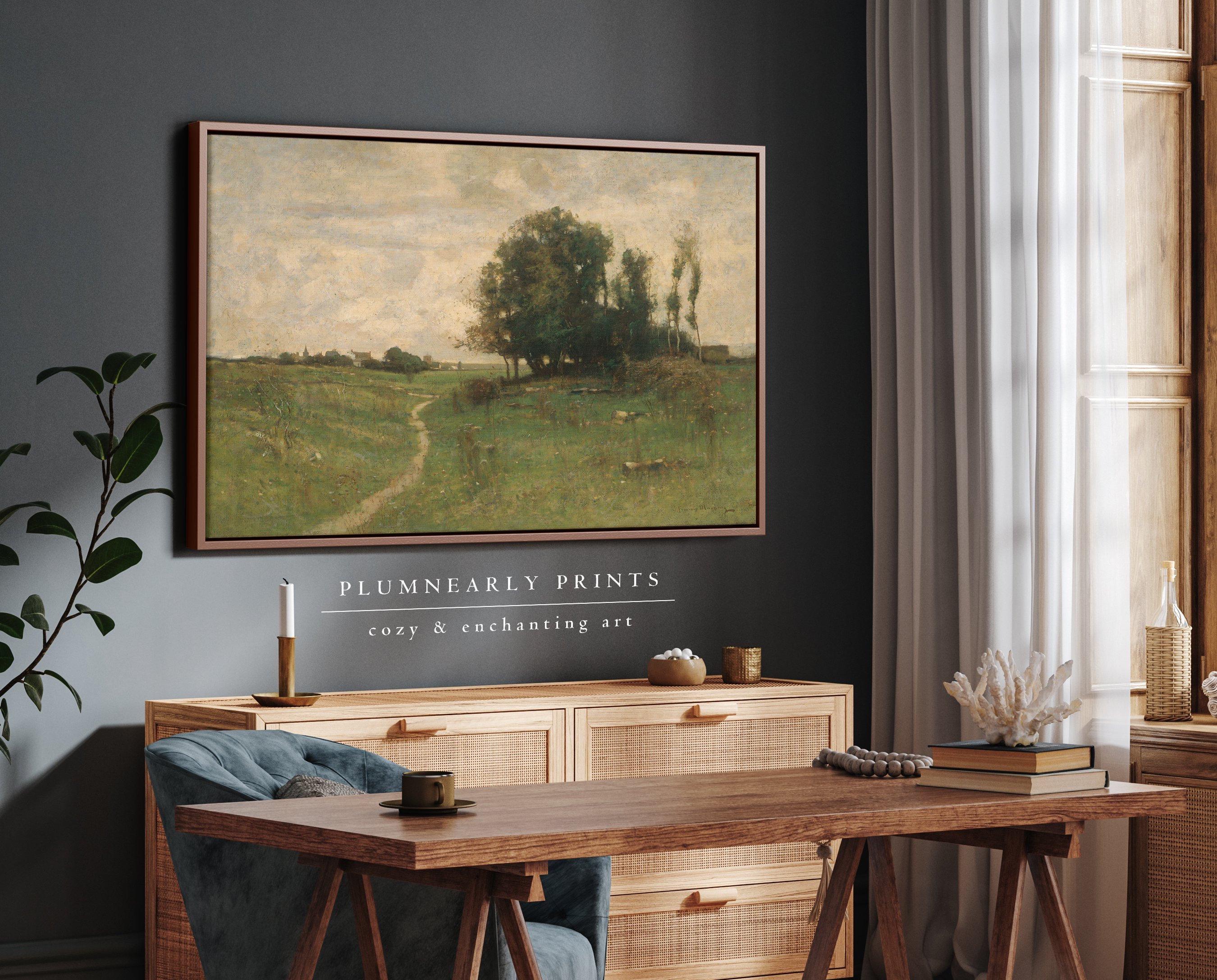 English Country Landscape Oil Painting Framed Canvas, Vintage French Countryside Wall Art, Antique Cottagecore Green Field Home Decor