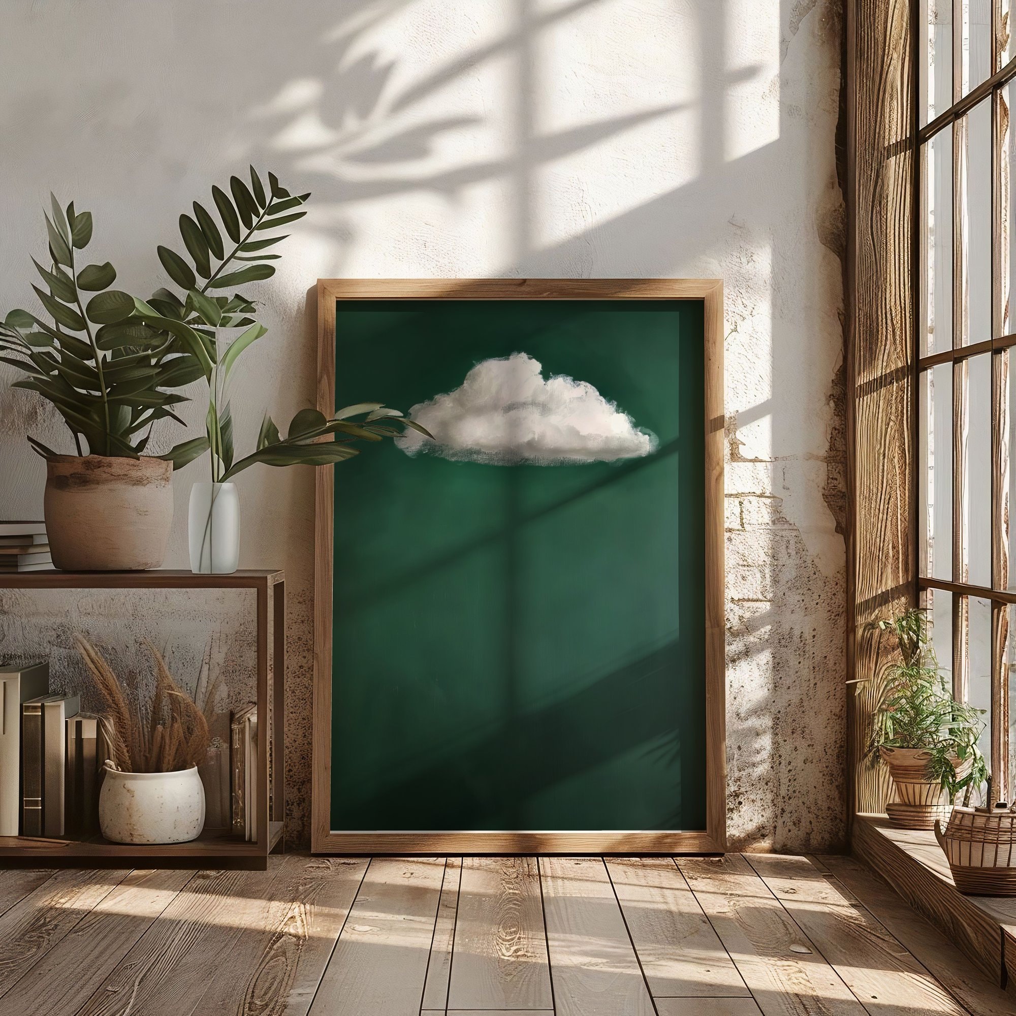 Elevate your home decor with this stunning abstract painting of a solitary cloud floating on a rich emerald green backdrop. This piece combines the tranquility of minimalism with a vibrant color palette, making it perfect for contemporary interiors. Create a focal point in any room with this unique and captivating wall art that blends imagination and modernity.