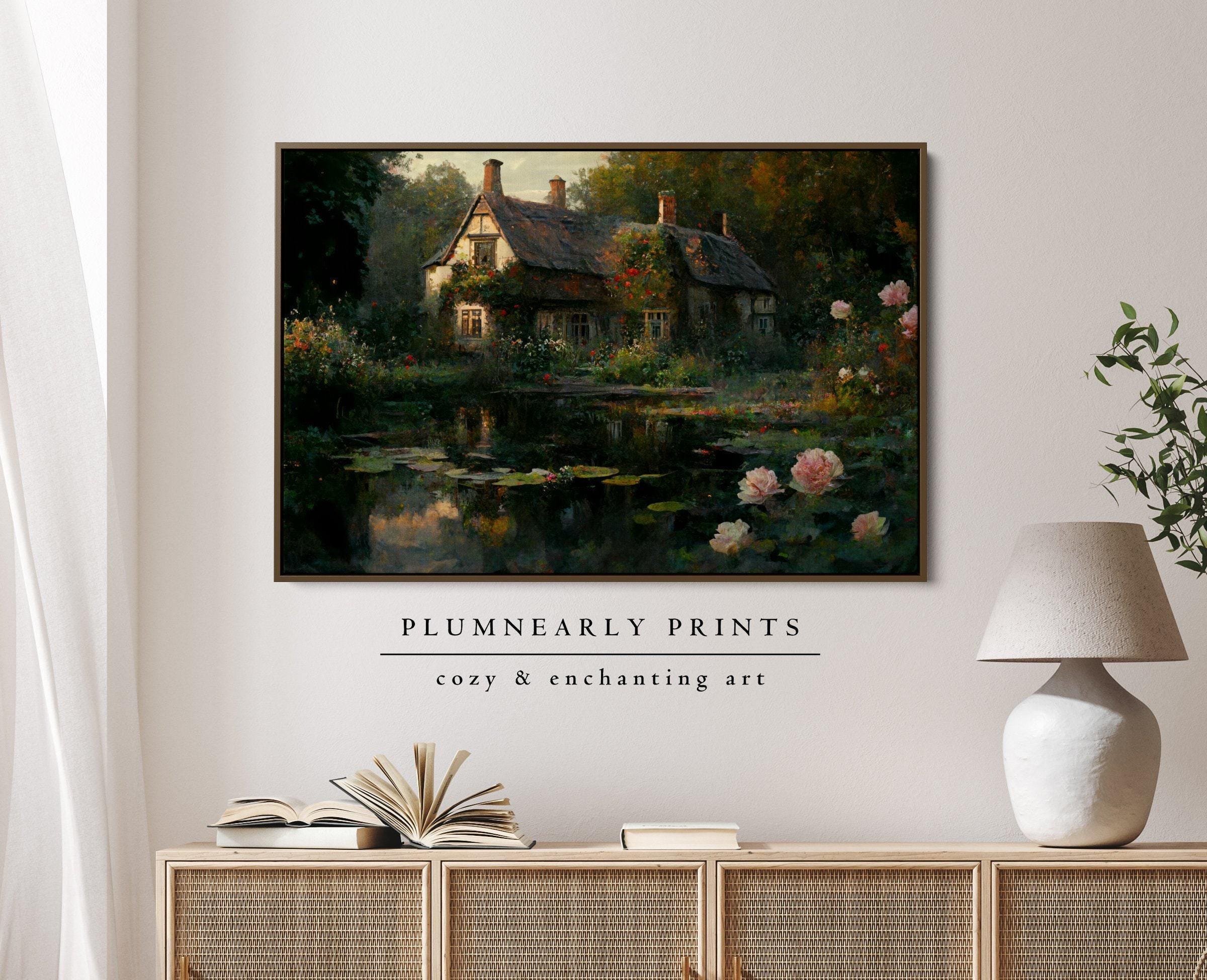 English Cottage Oil Painting Framed Canvas Art. Rose Garden Wall Art. Spring Cottagecore Art. Vintage Warm Cozy Cottage Print