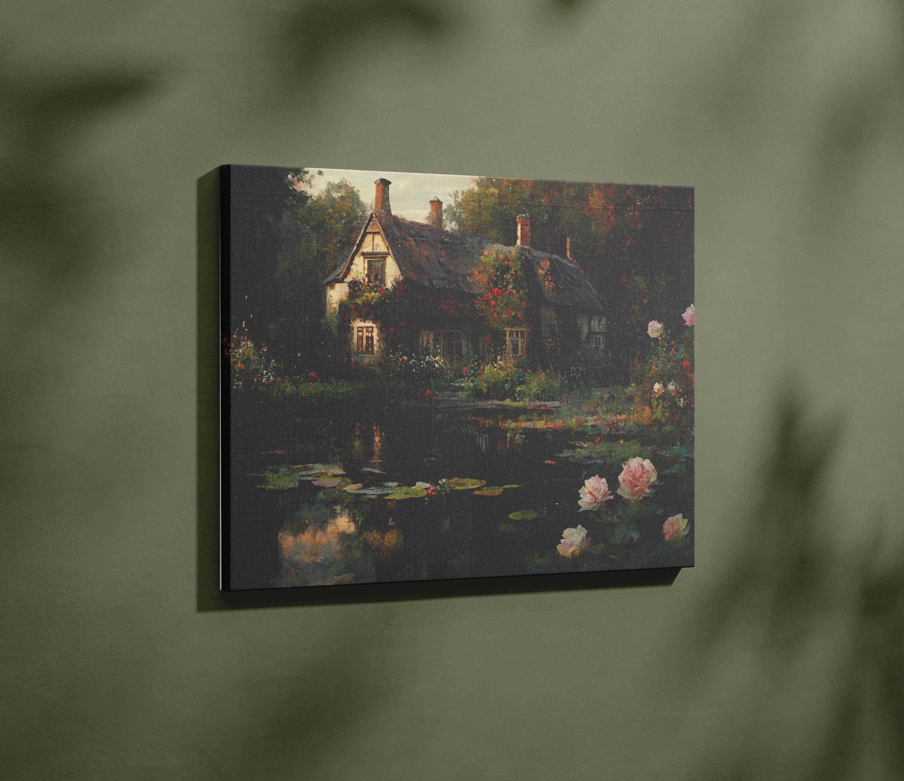 Add a touch of warmth and coziness to your home with this charming English cottage art print. This vintage-style oil painting features a picturesque English-style cottage, complete with a cream facade, a dusty brown thatched roof, and four chimneys. The cottage is nestled among lush green trees, beautiful rose bushes with pink and red roses, and a pond with lily pads. The scene has a serene and peaceful ambiance that will transport you to a tranquil countryside escape.