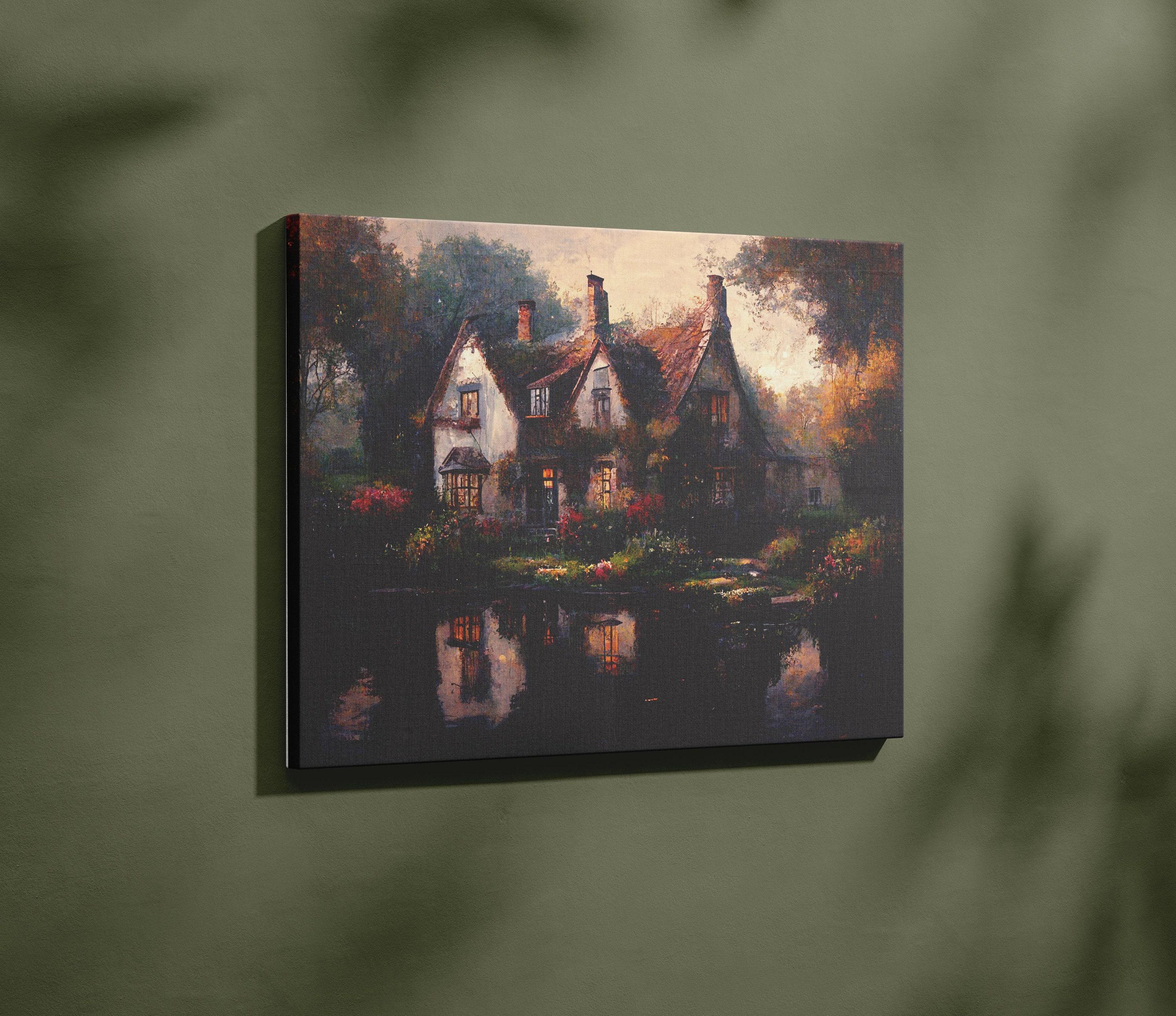 Add a touch of warmth and coziness to your home with this charming English cottage art print. This vintage-style oil painting features a picturesque English-style cottage, complete with a white facade, a dusty brown thatched roof, and warm glowing windows. The cottage is nestled among lush greenery and autumn foliage, beautiful rose bushes with pink and red roses, and a pond with glistening reflections. The sky peaks out with a pastel golden sunset, creating a serene and peaceful ambiance that will transport you to a tranquil countryside escape.