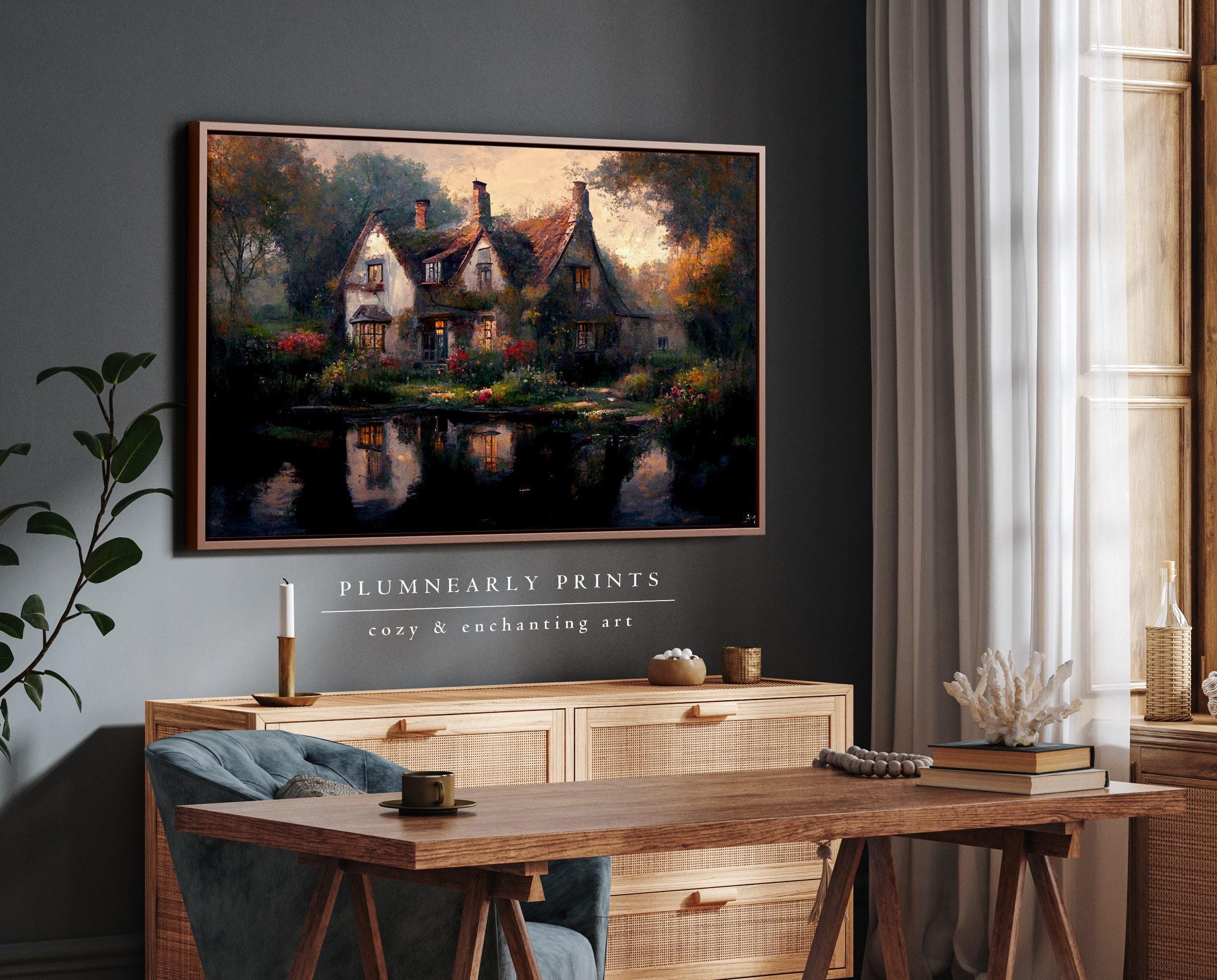 English Cottage Oil Painting Framed Canvas Art, Rose Garden Wall Art, Autumn Fall Cottagecore Art, Vintage Warm Cozy Cottage Print