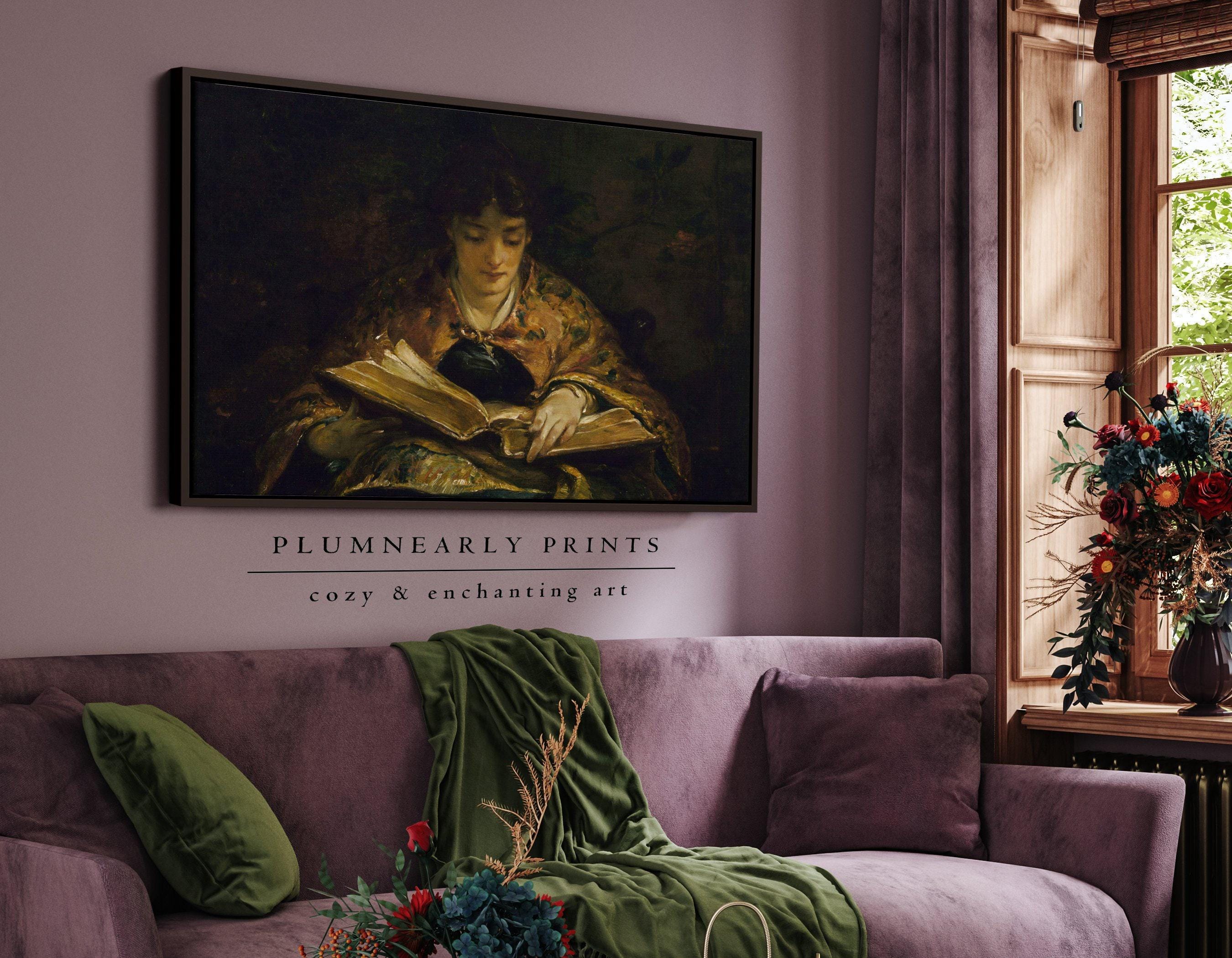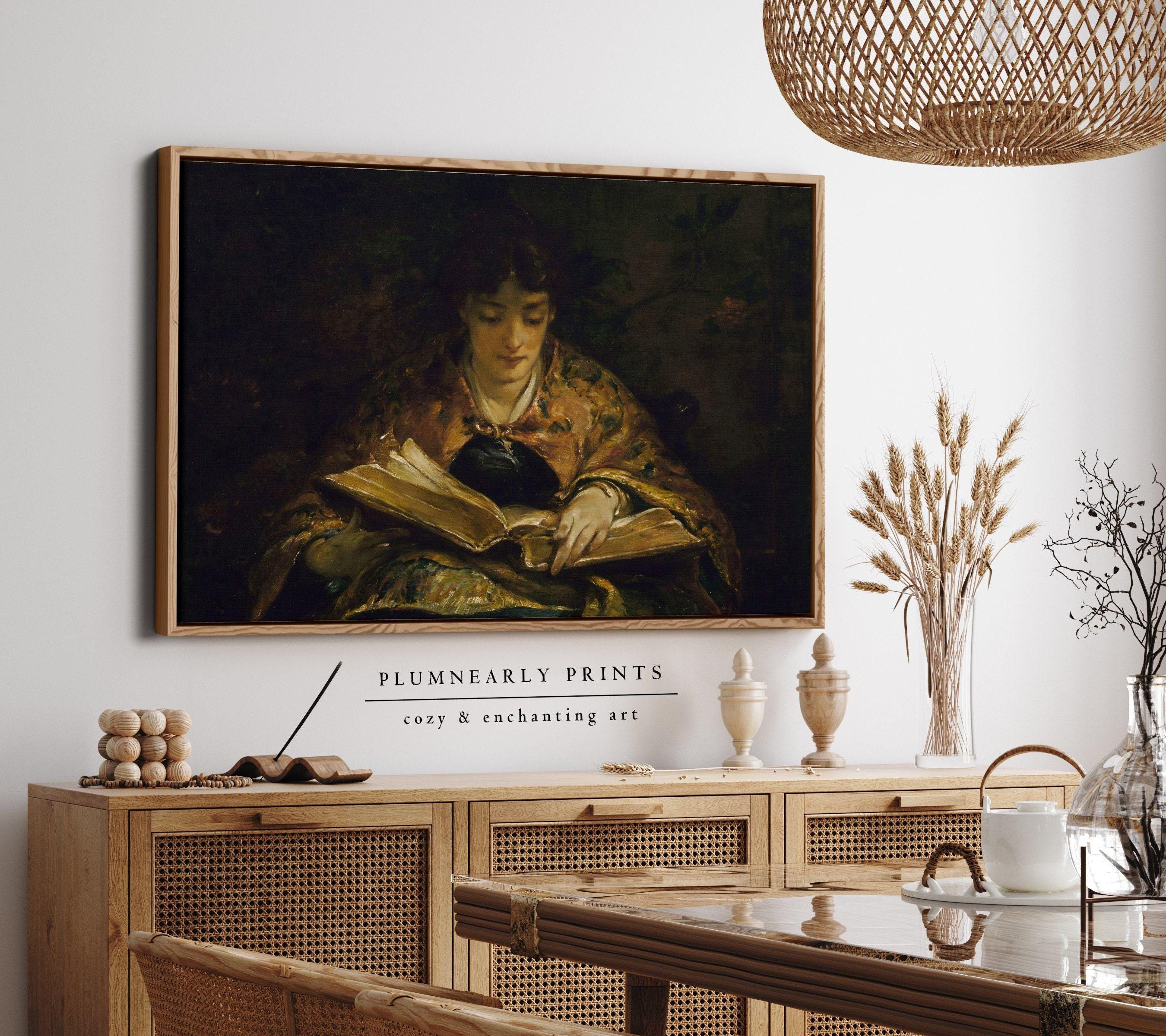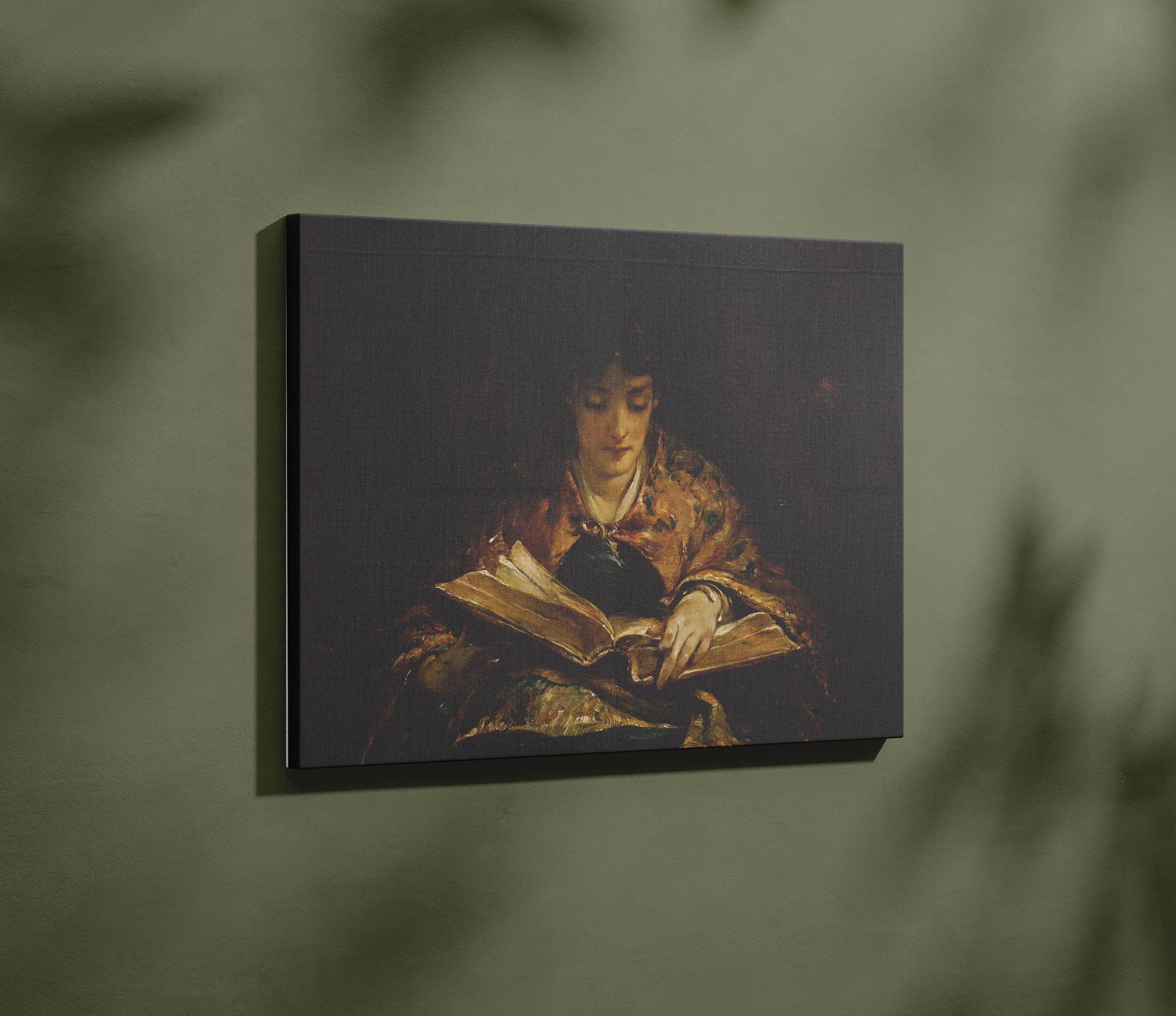 Woman Reading Antique Portrait Oil Painting Framed Canvas Art, Vintage Library Book Lover Gift, Cozy Dark Academia Girl Reading Nook Decor