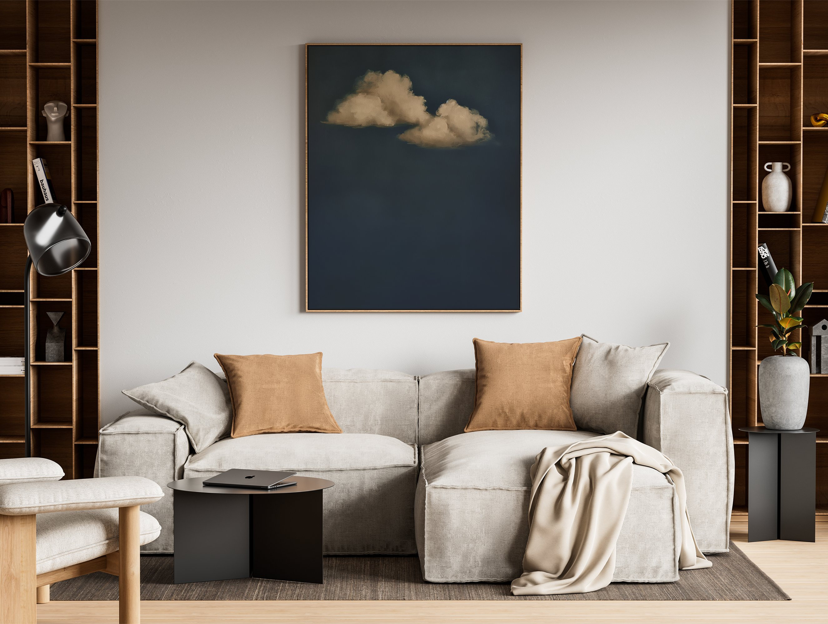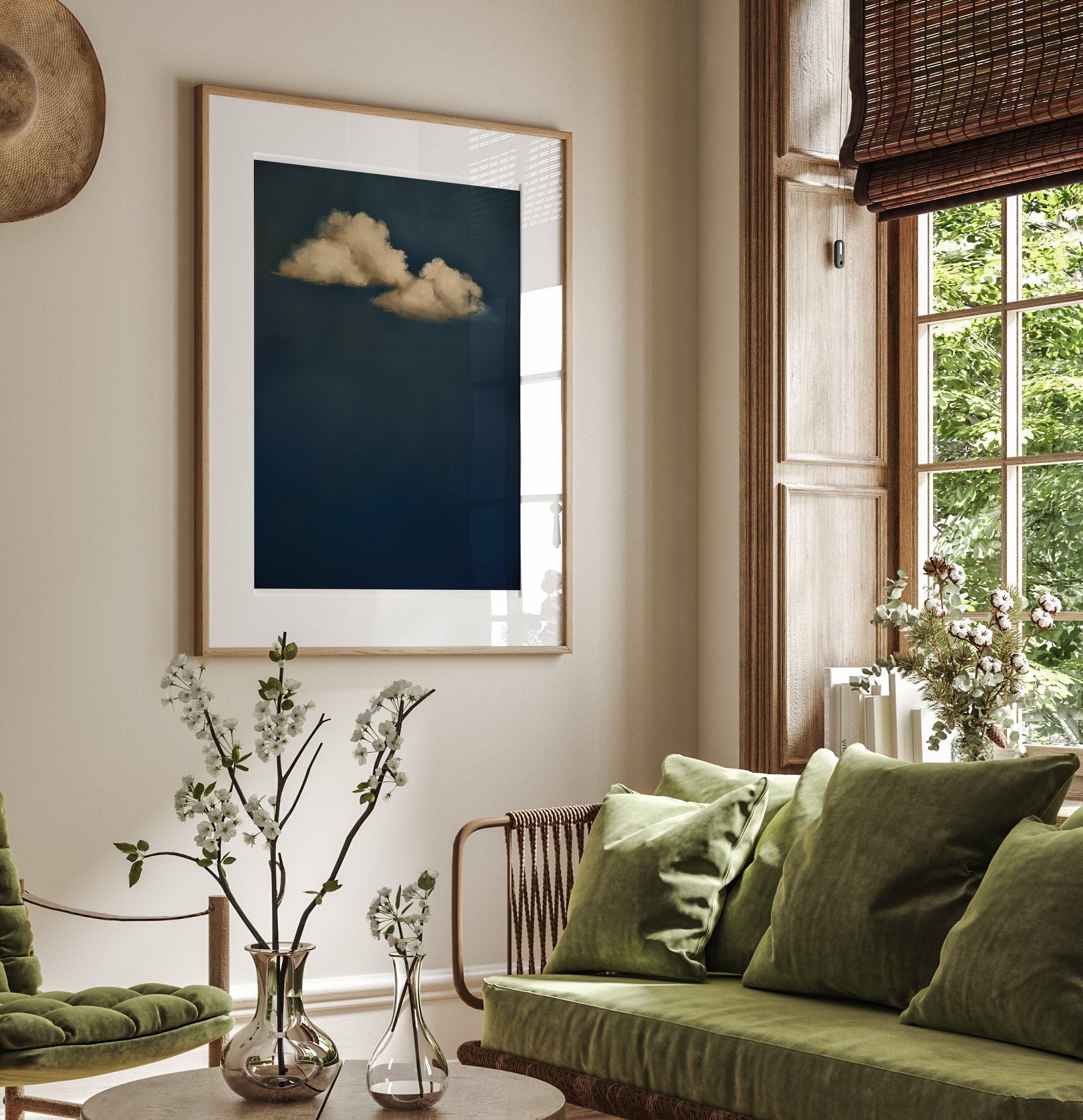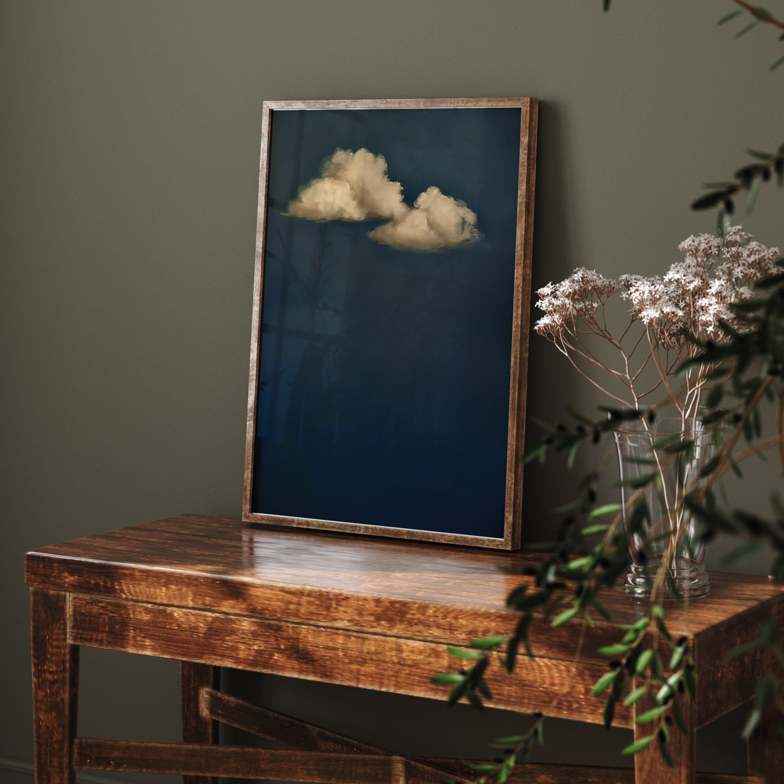 This captivating piece of abstract cloud wall art brings a touch of serene elegance to any room. The painting features a minimalist cloud illustration set against a deep blue background, creating a striking contrast. Perfect for modern and contemporary spaces, this artwork is a subtle yet impactful way to enhance your home's aesthetic. Whether you're looking to add some tranquility to your bedroom, living room, or office, this unique piece is sure to make a statement.