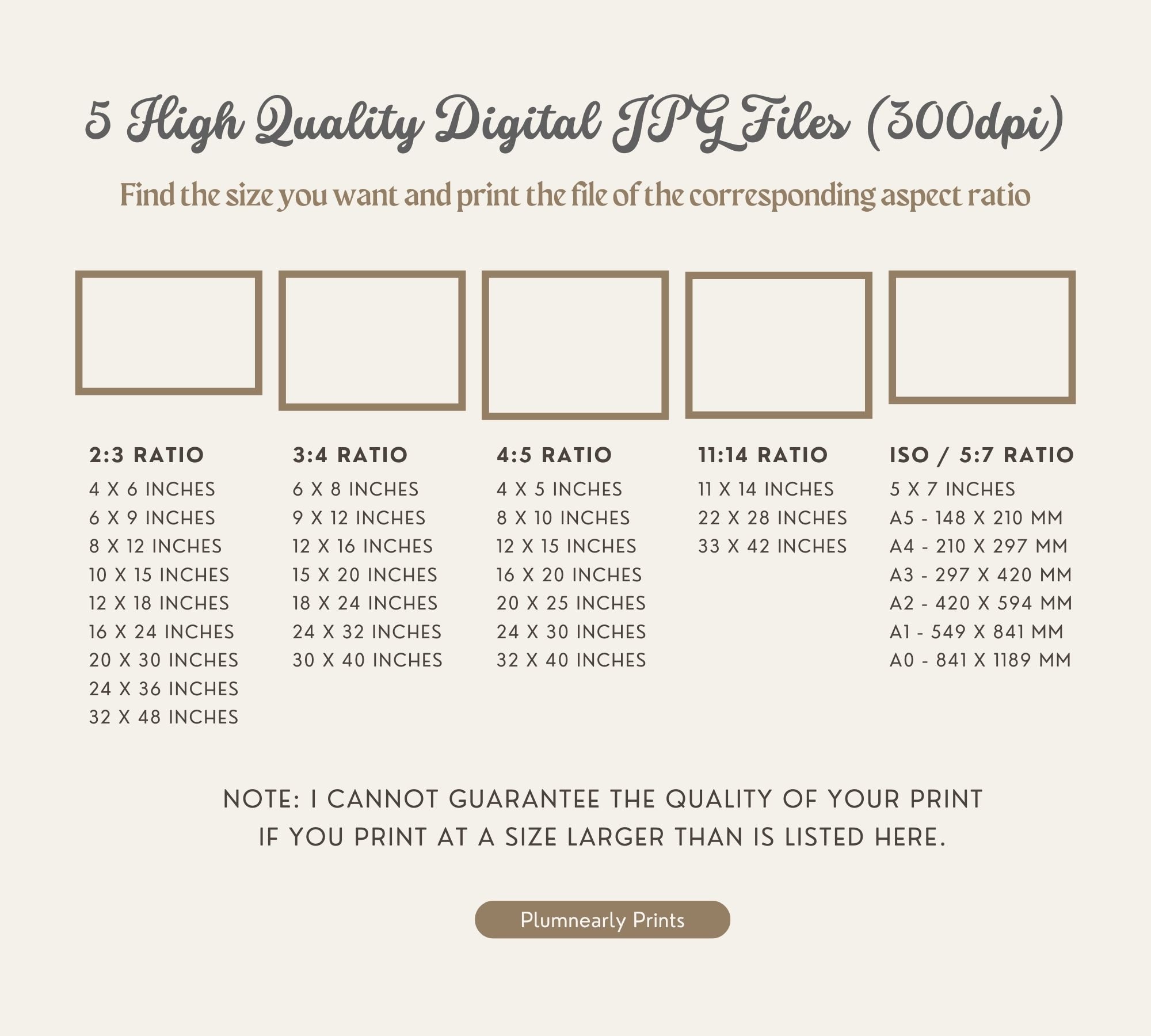 After purchasing artwork from my shop you will immediately receive 5 files in different size ratios that will fit in over 20 standard frame sizes. Choose a printing service (online or local) and use these files to order prints in any size of your choosing! You can also print directly at home, though the quality may not be as high as with a professional printing service. The final print quality will depend on the printer and paper used.