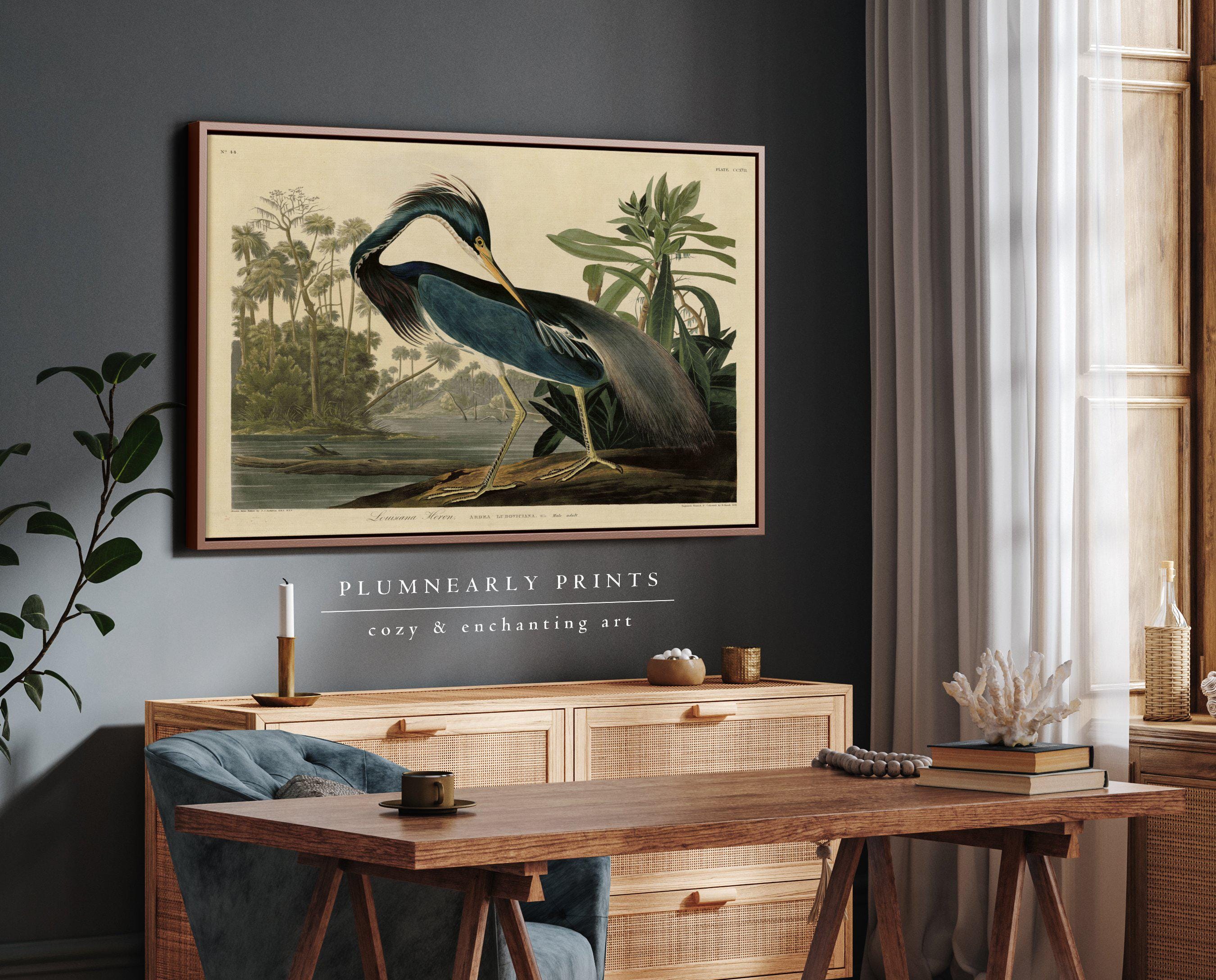 Louisiana Heron Audubon Illustration Framed Canvas, Vintage Bird Classic Wildlife Poster, Neutral Blue Coastal Beach Lake House Decor