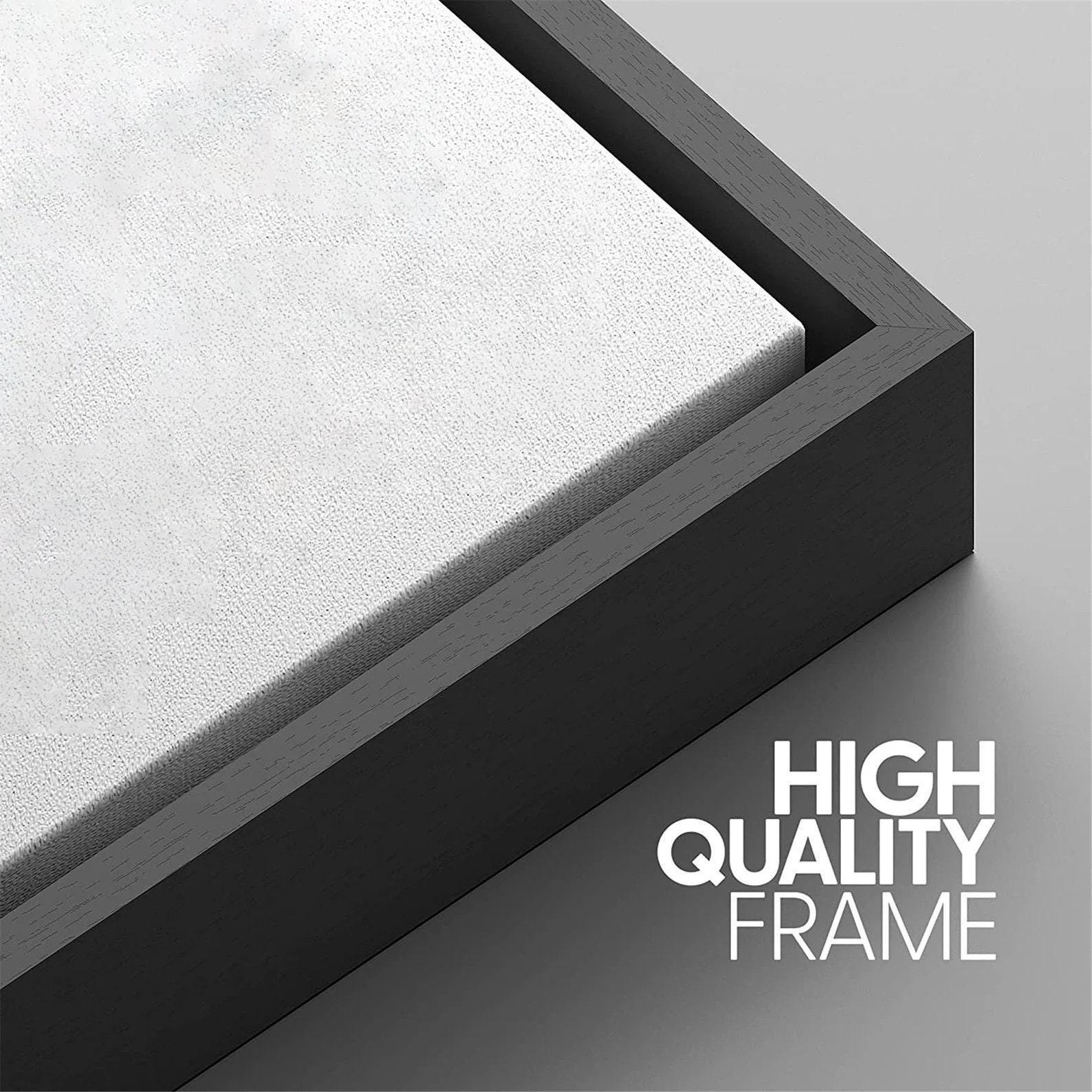 Canvas stretched on wooden stretcher bars with a premium solid wood floating frame. Beautifully finished and ready to hang.