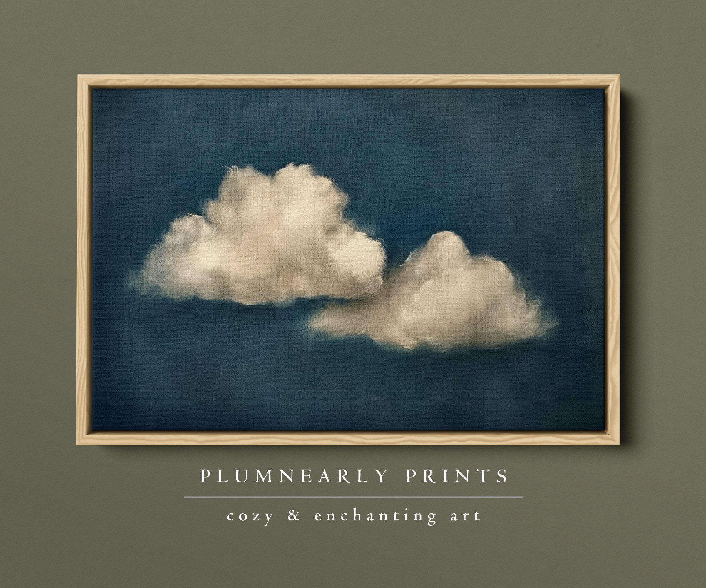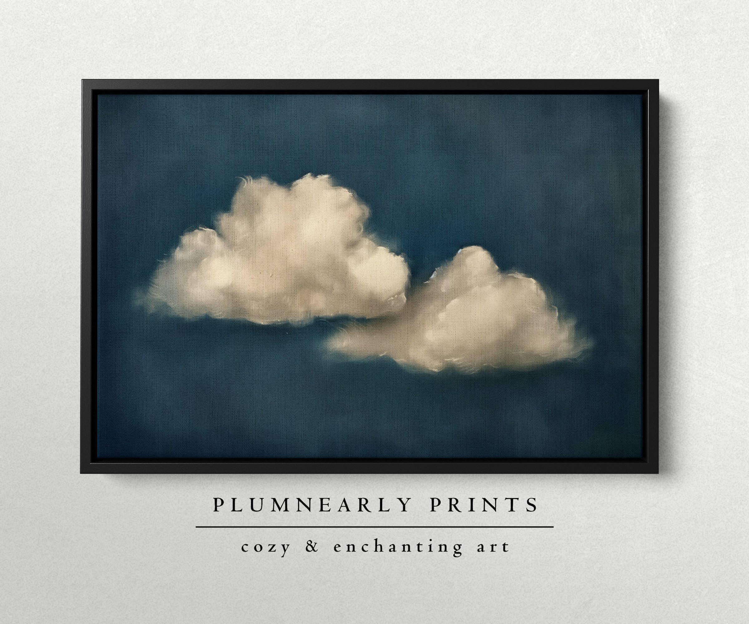 Indigo Blue Cloud Oil Painting Framed Canvas, Minimal White Cloudscape, Large Modern Night Sky Wall Art, Abstract Navy Blue Home Decor