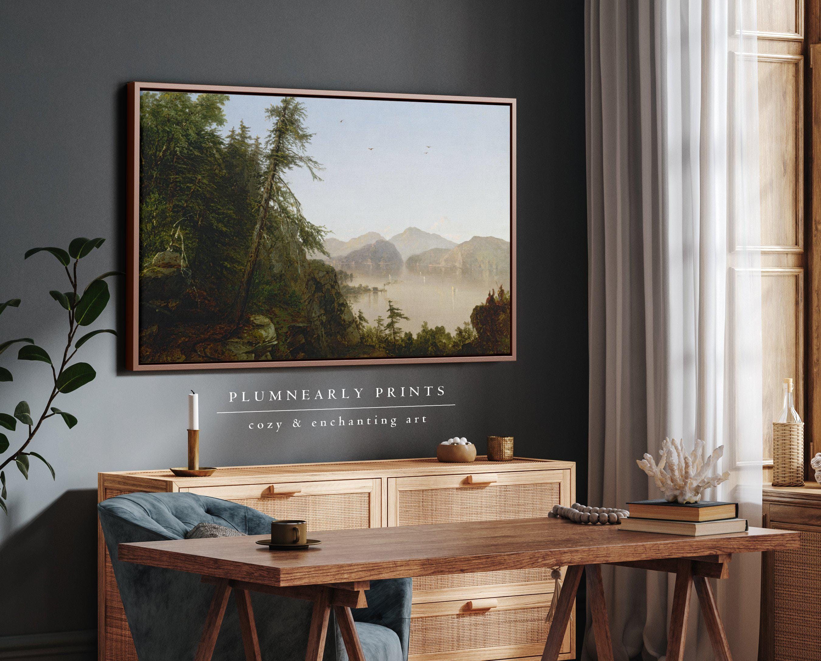 Forest Mountain Landscape Oil Painting Framed Canvas, Classic Trees Along the Hudson Kensett, Elegant Neutral Green Vintage Home Decor