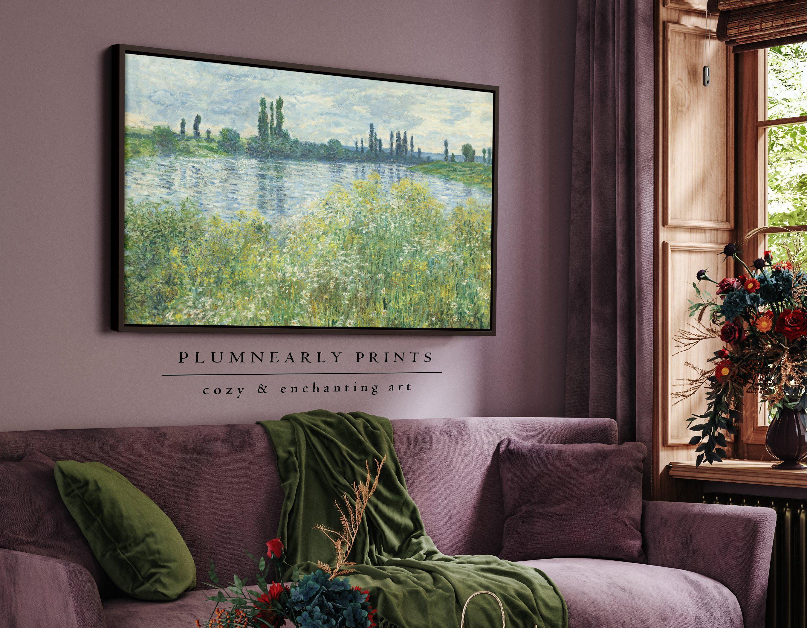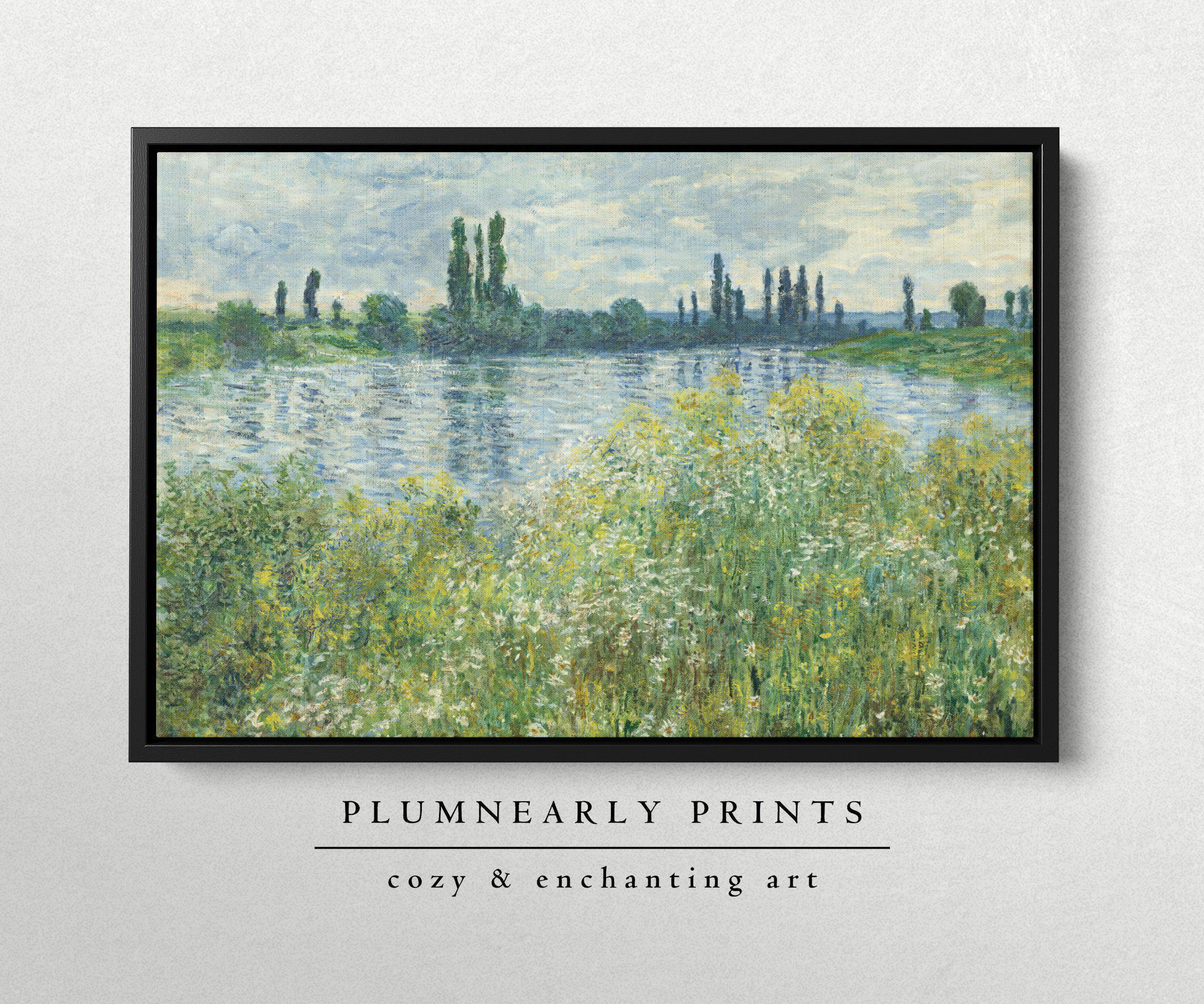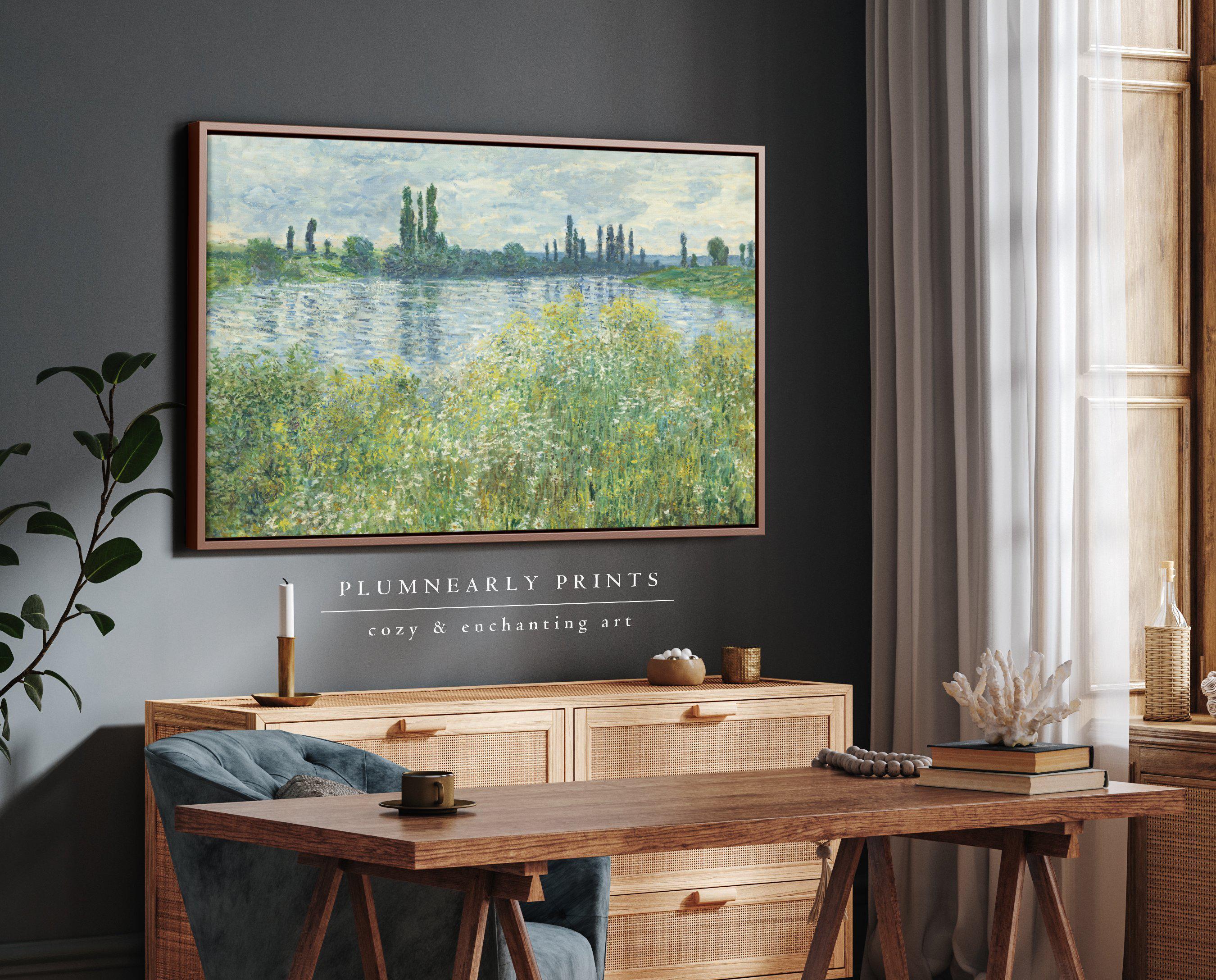 Monet River Landscape Oil Painting Framed Canvas, Banks of the Seine River, Impressionist French Country Muted Wildflowers Wall Decor