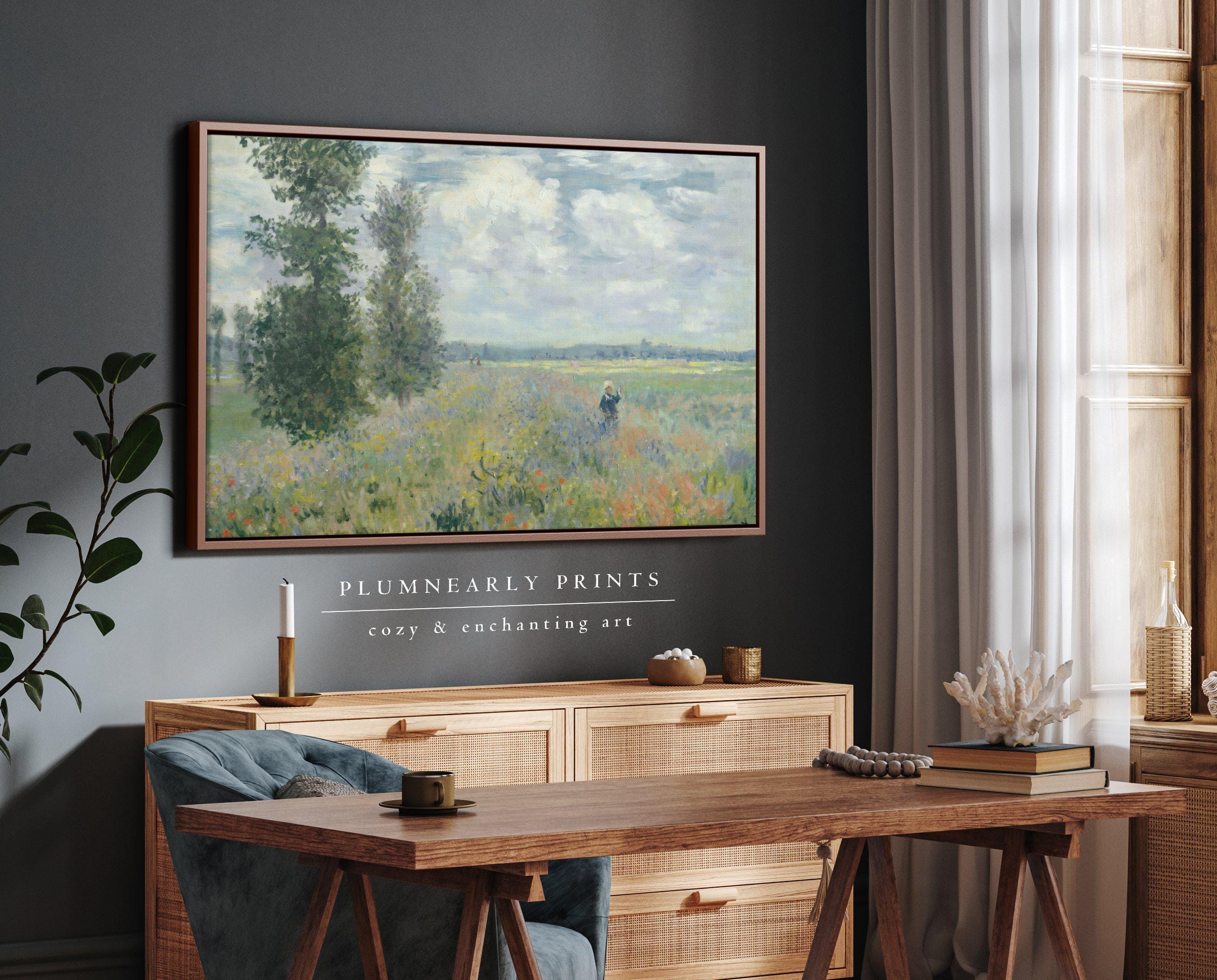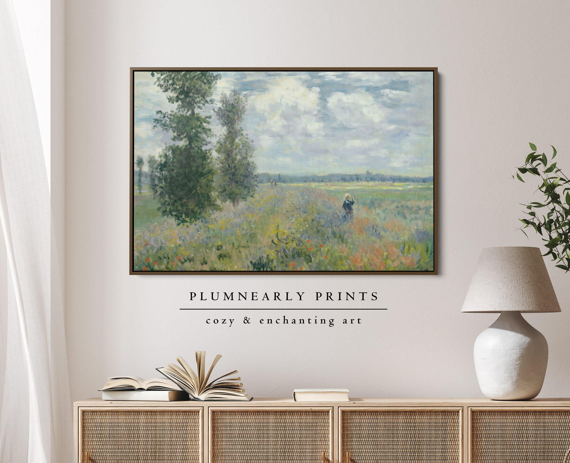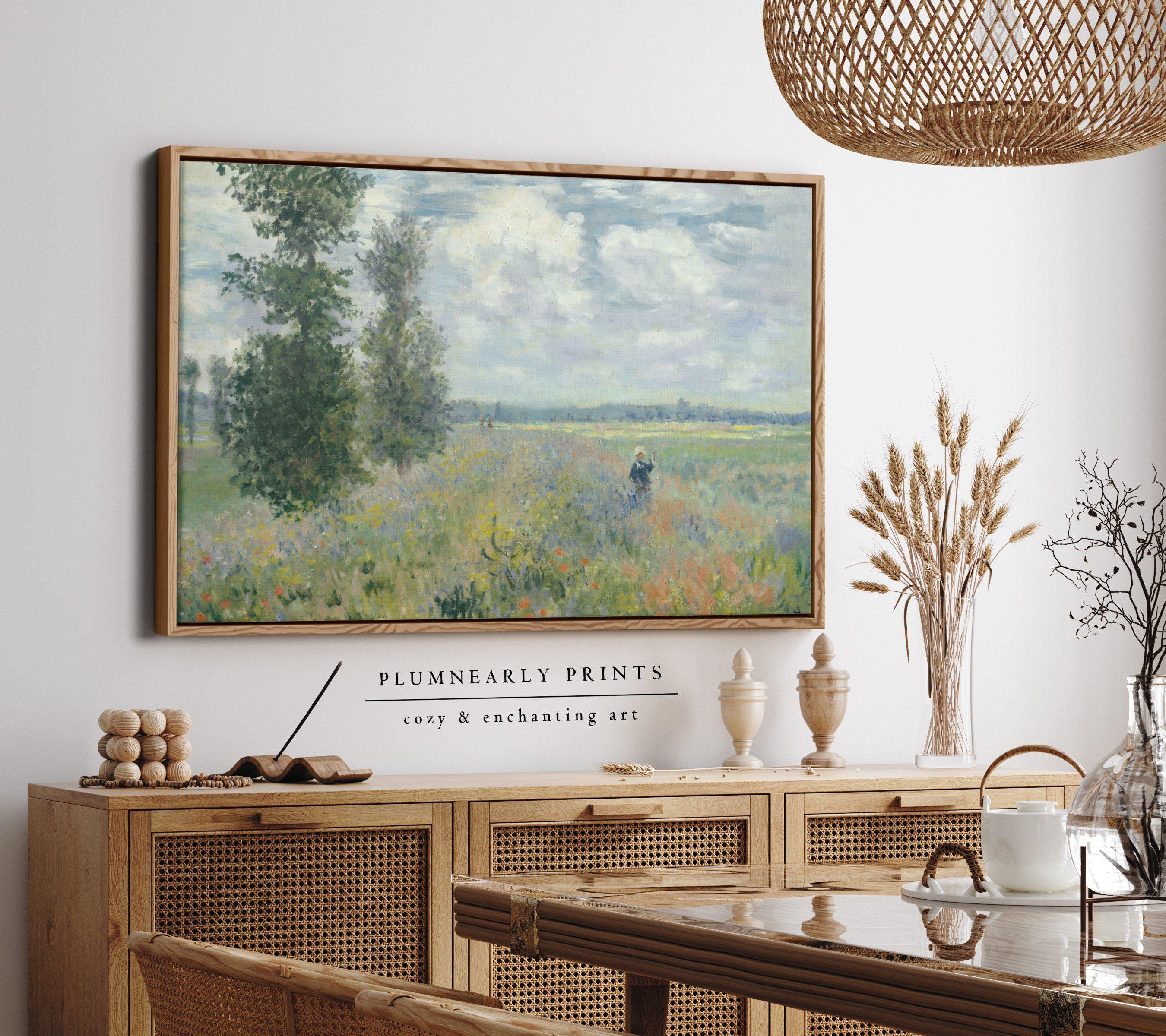Monet Poppy Fields Landscape Oil Painting Framed Canvas, Neutral Impressionist Summer Wildflower Field, Pastel Spring Floral Wall Decor