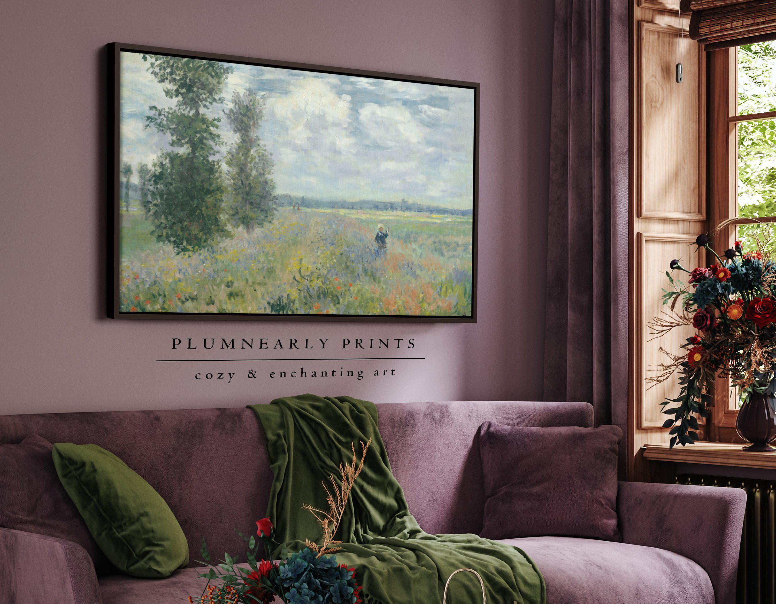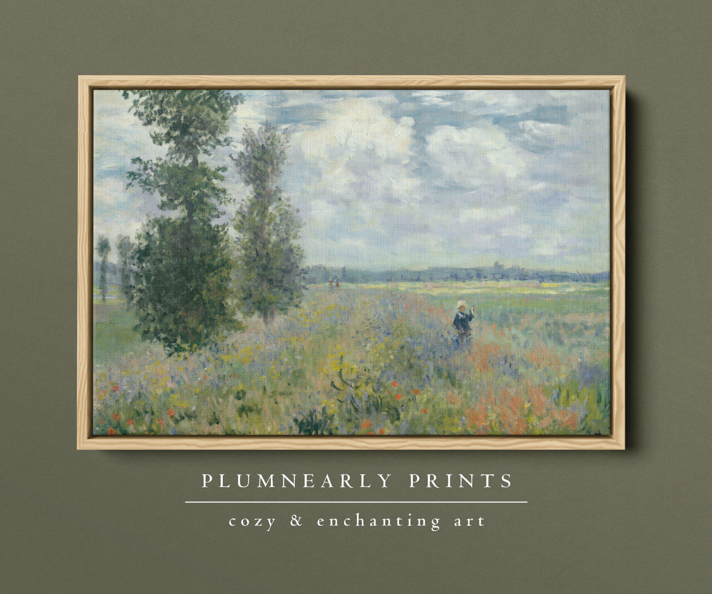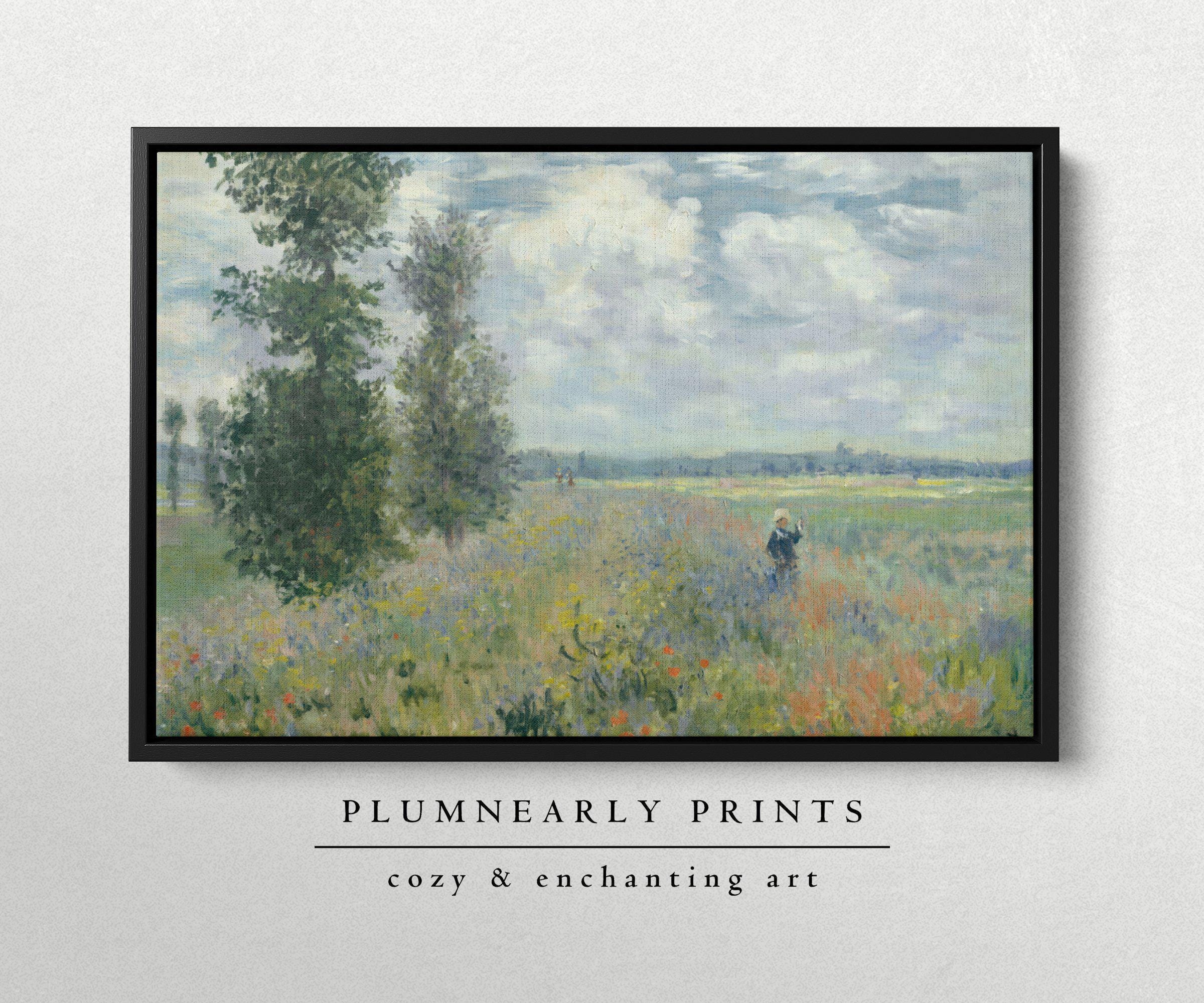 Monet Poppy Fields Landscape Oil Painting Framed Canvas, Neutral Impressionist Summer Wildflower Field, Pastel Spring Floral Wall Decor