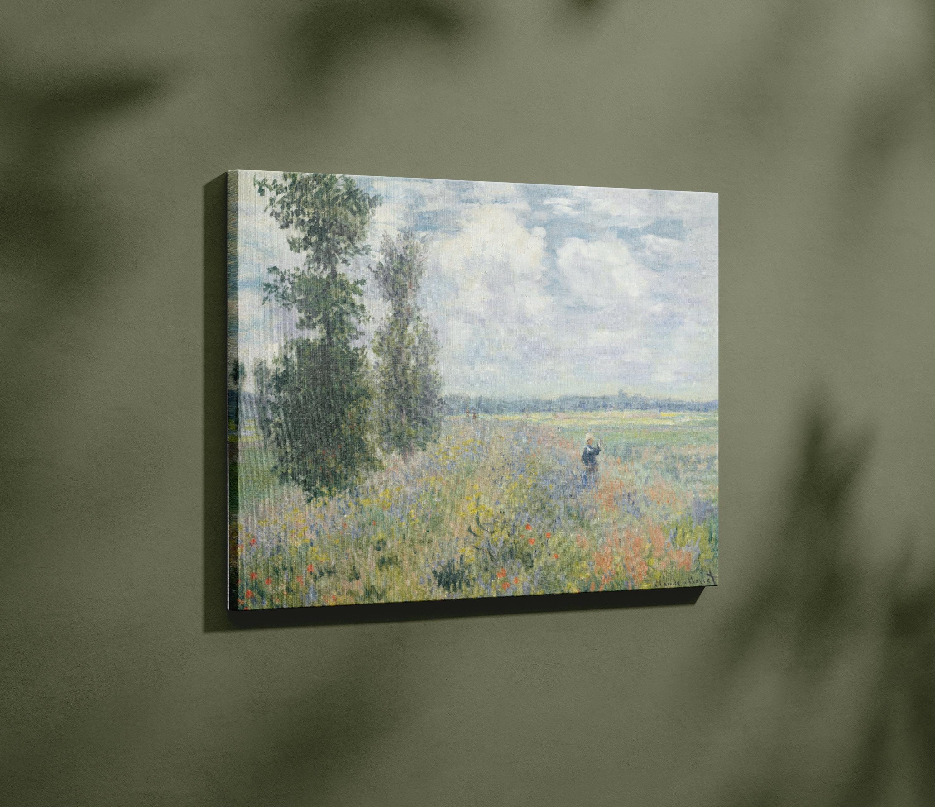 Bring the tranquil beauty of Impressionism into your home with this exquisite print of Claude Monet's landscape painting: Poppy Fields near Argenteuil, 1875. Featuring a pastoral field dotted with wildflowers and a lone figure amidst vast skies, this wall art captures the essence of serene nature and the sublime charm of early 20th-century French art. Perfect for decorating your living room, bedroom, or office, it's an elegant addition to any art lover's collection.