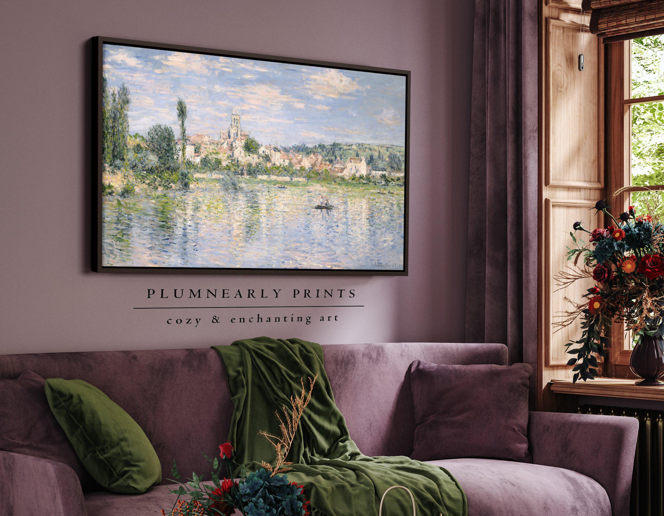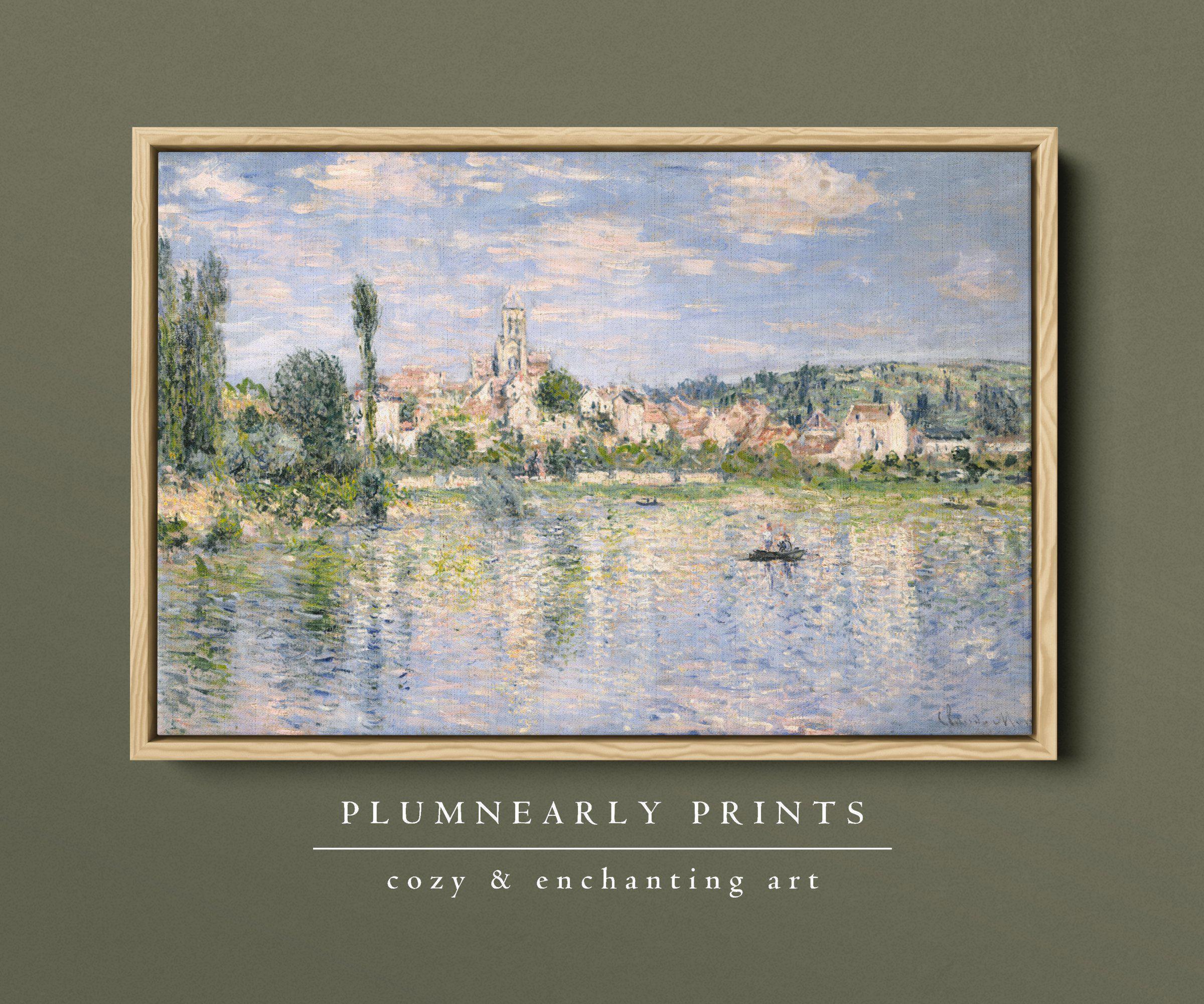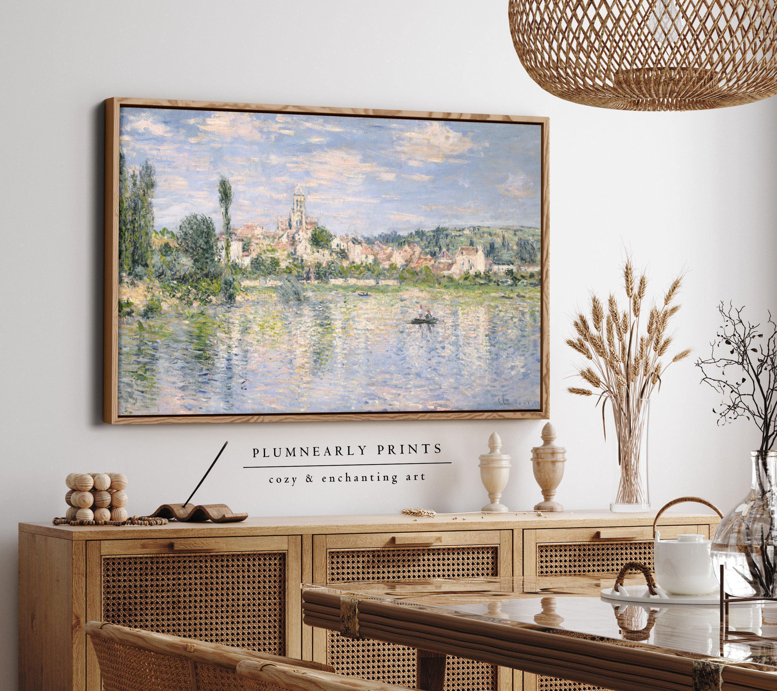 Bring a touch of French elegance to your home with this stunning print featuring a vibrant Impressionist river landscape by Claude Monet: Vétheuil in Summer, 1880. Ideal for adding color and serenity to any room, this artwork captures a quaint village and a serene river, beautifully reflecting the sky's changing colors. A perfect choice for art lovers and those wishing to enhance their living space with historical charm and tranquility.