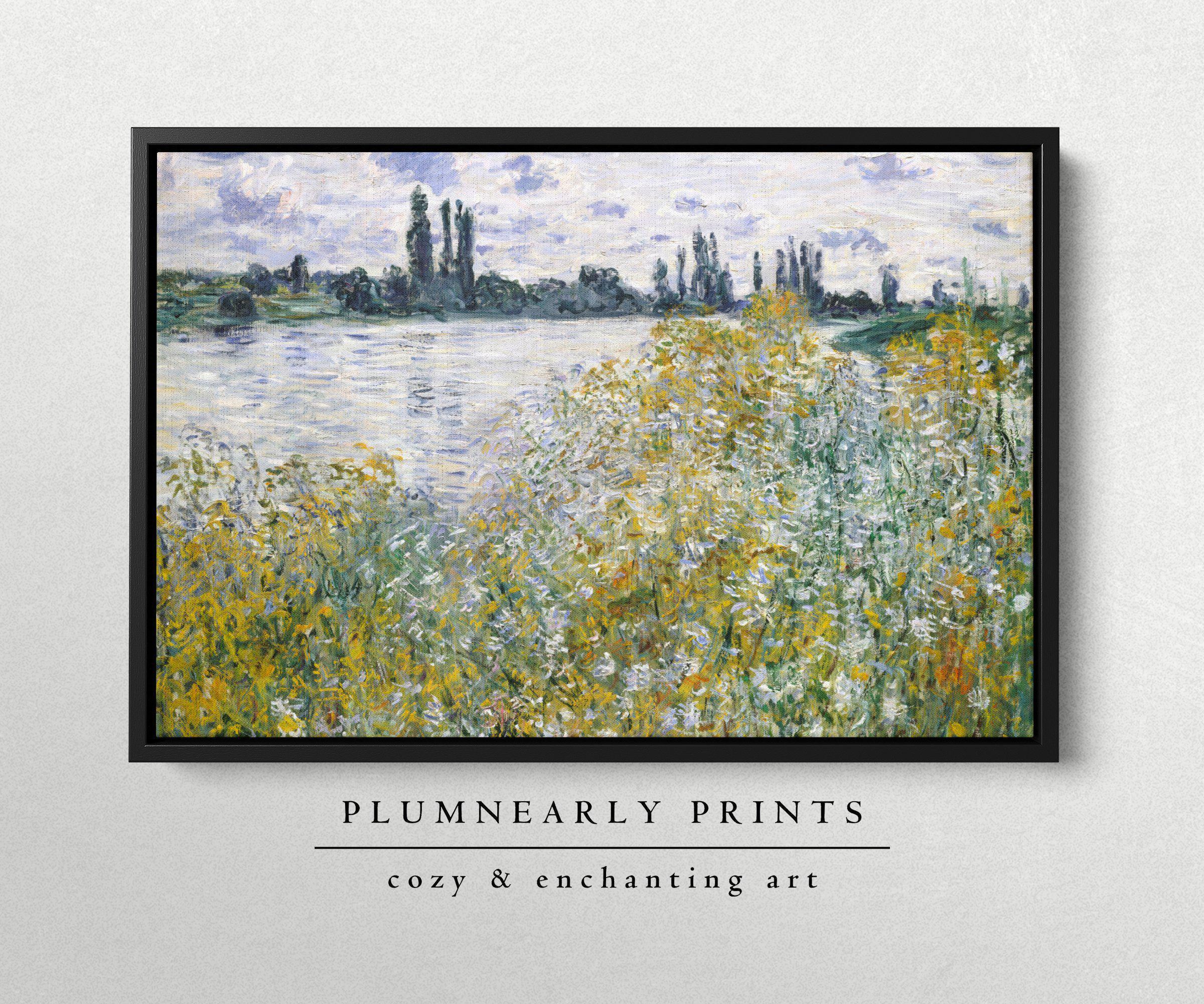 Monet Water Landscape Oil Painting Framed Canvas, Neutral Impressionist River Wildflower Field Scene, Muted French Country Home Decor