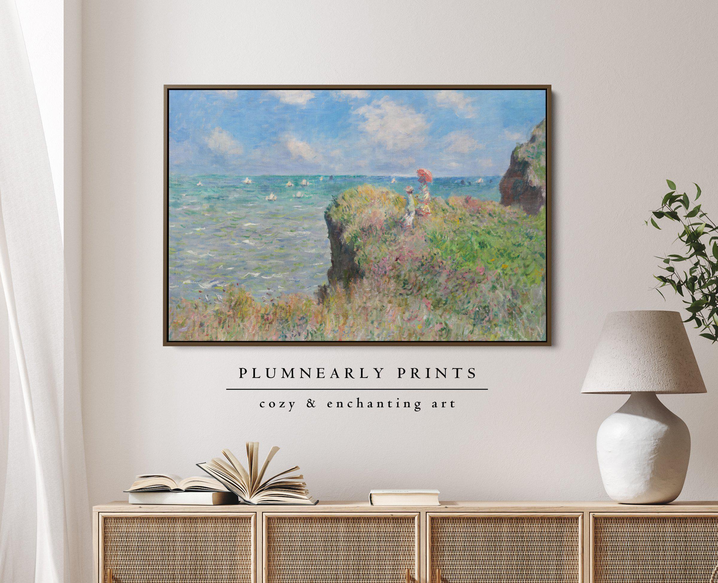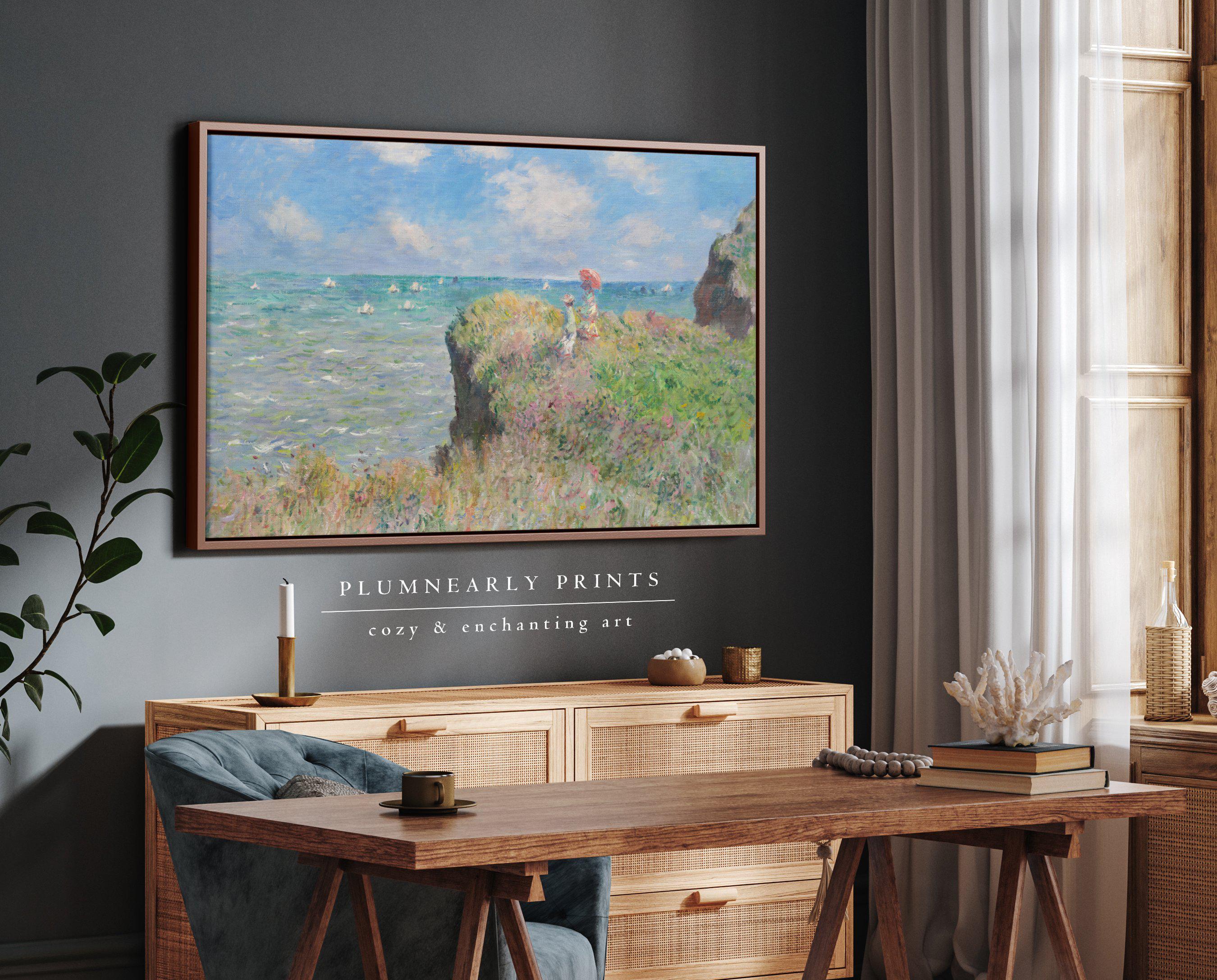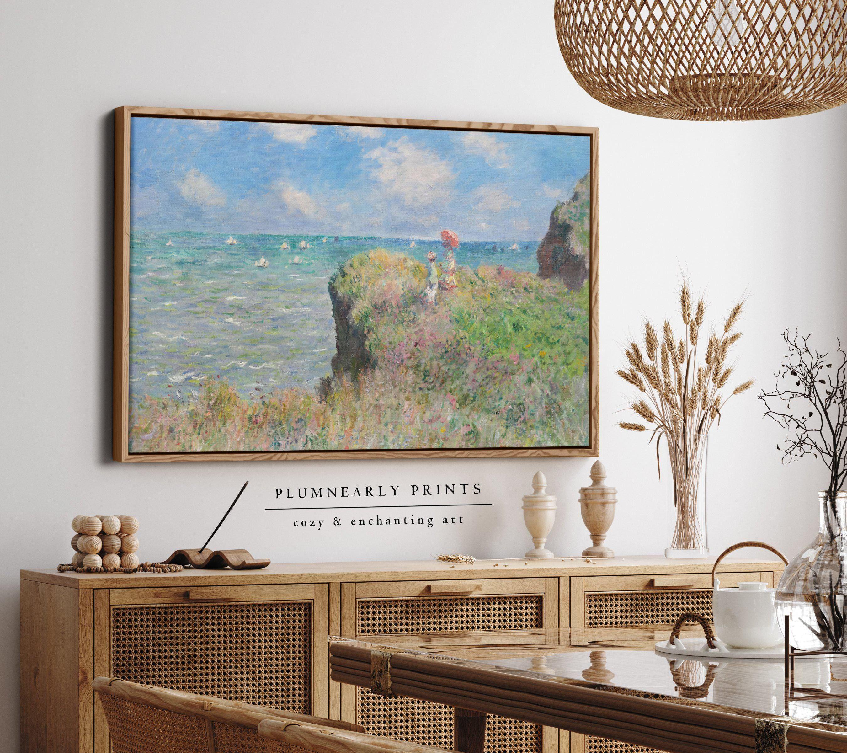 Monet Cliff Walk Landscape Oil Painting Framed Canvas, Colorful Impressionist Summer Coastal Wall Decor, Vibrant Pastel Blue Green Sea
