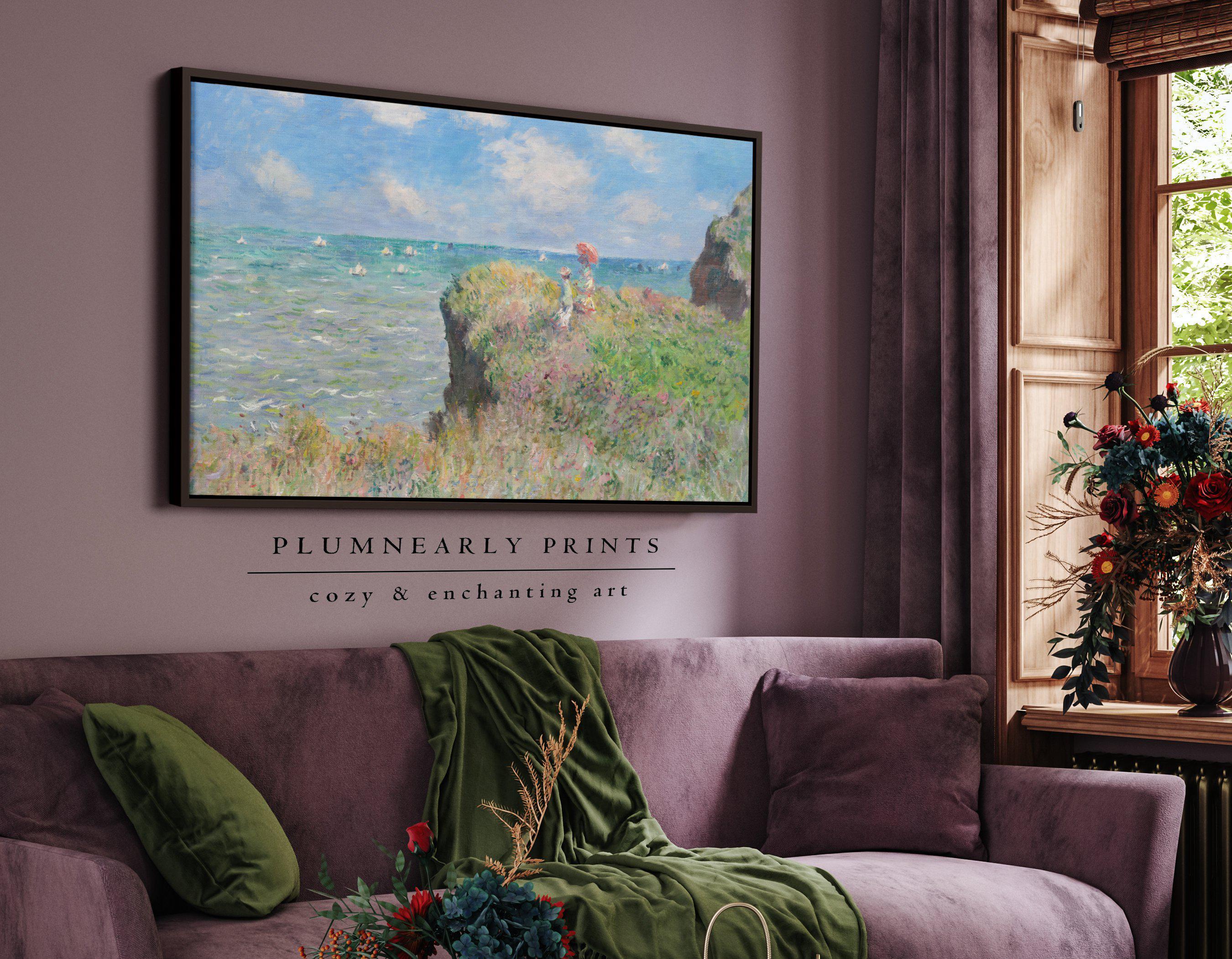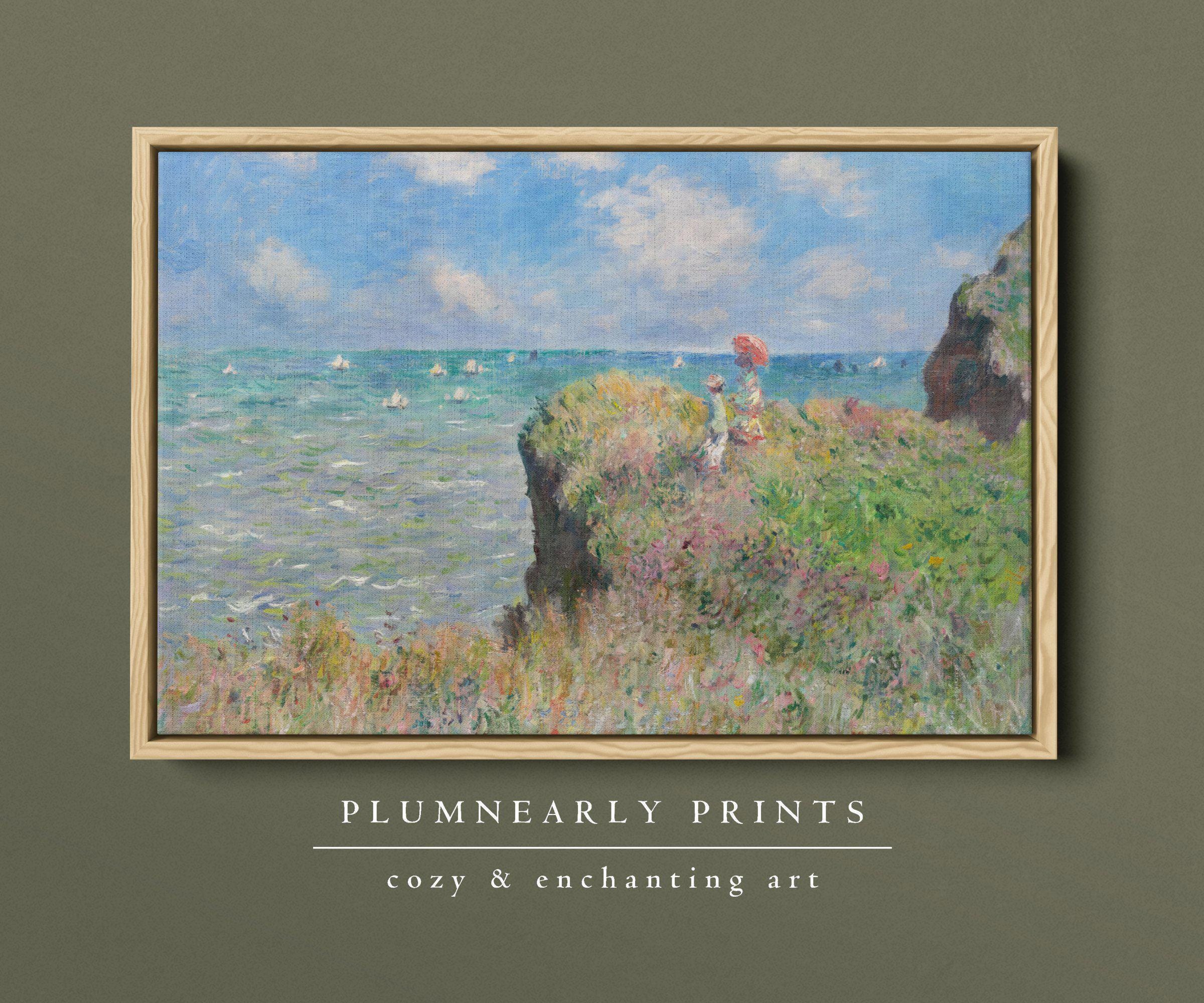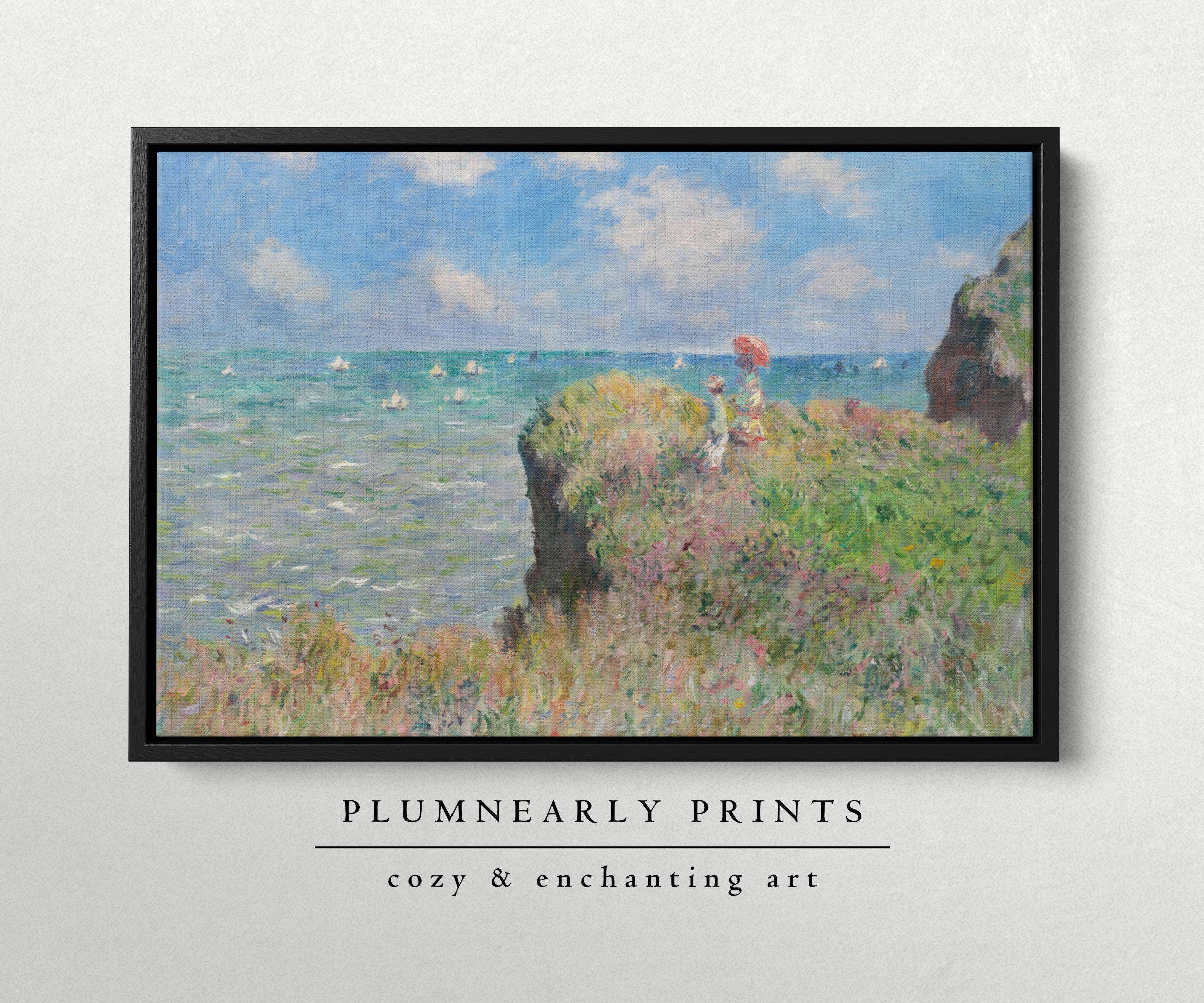 Monet Cliff Walk Landscape Oil Painting Framed Canvas, Colorful Impressionist Summer Coastal Wall Decor, Vibrant Pastel Blue Green Sea
