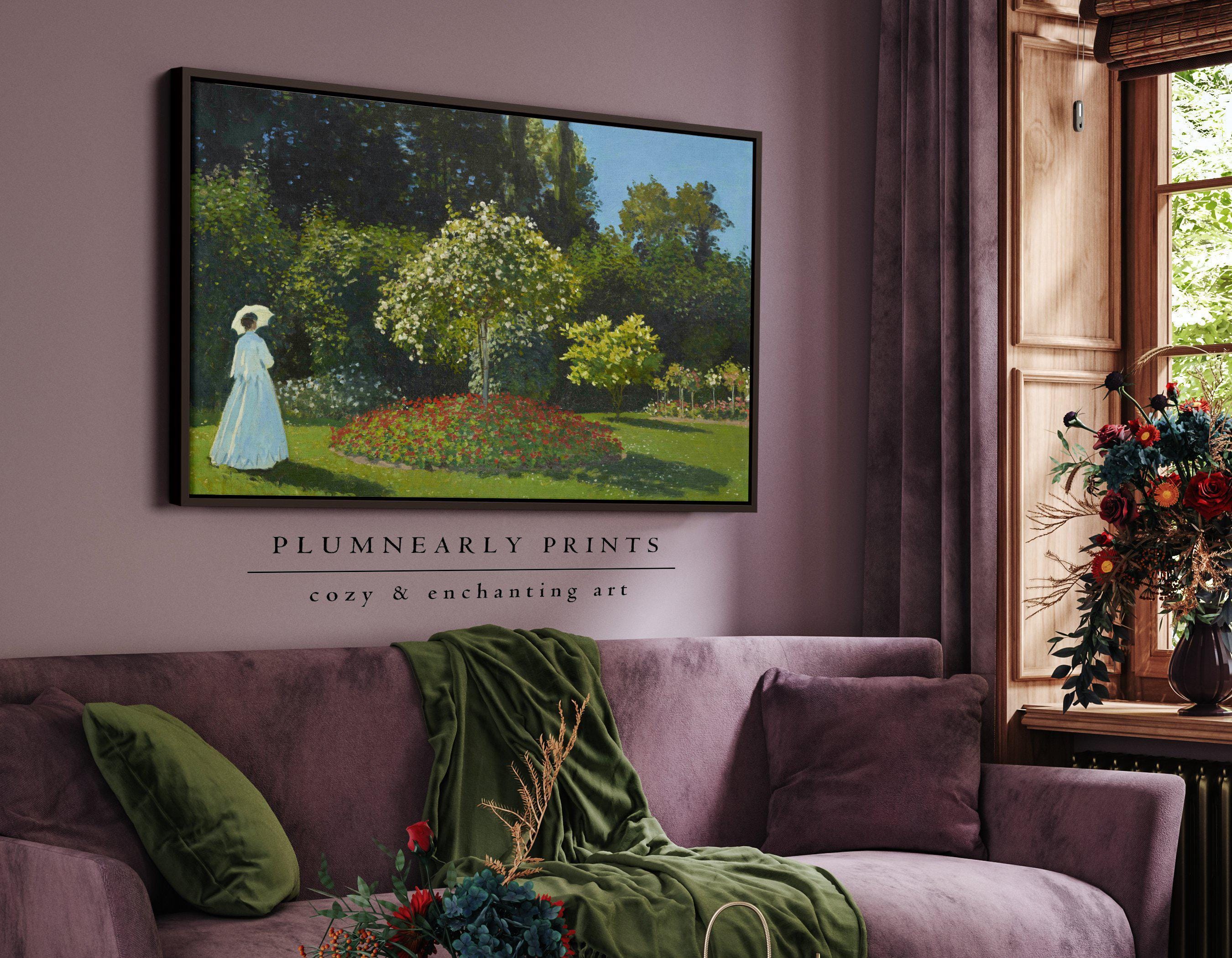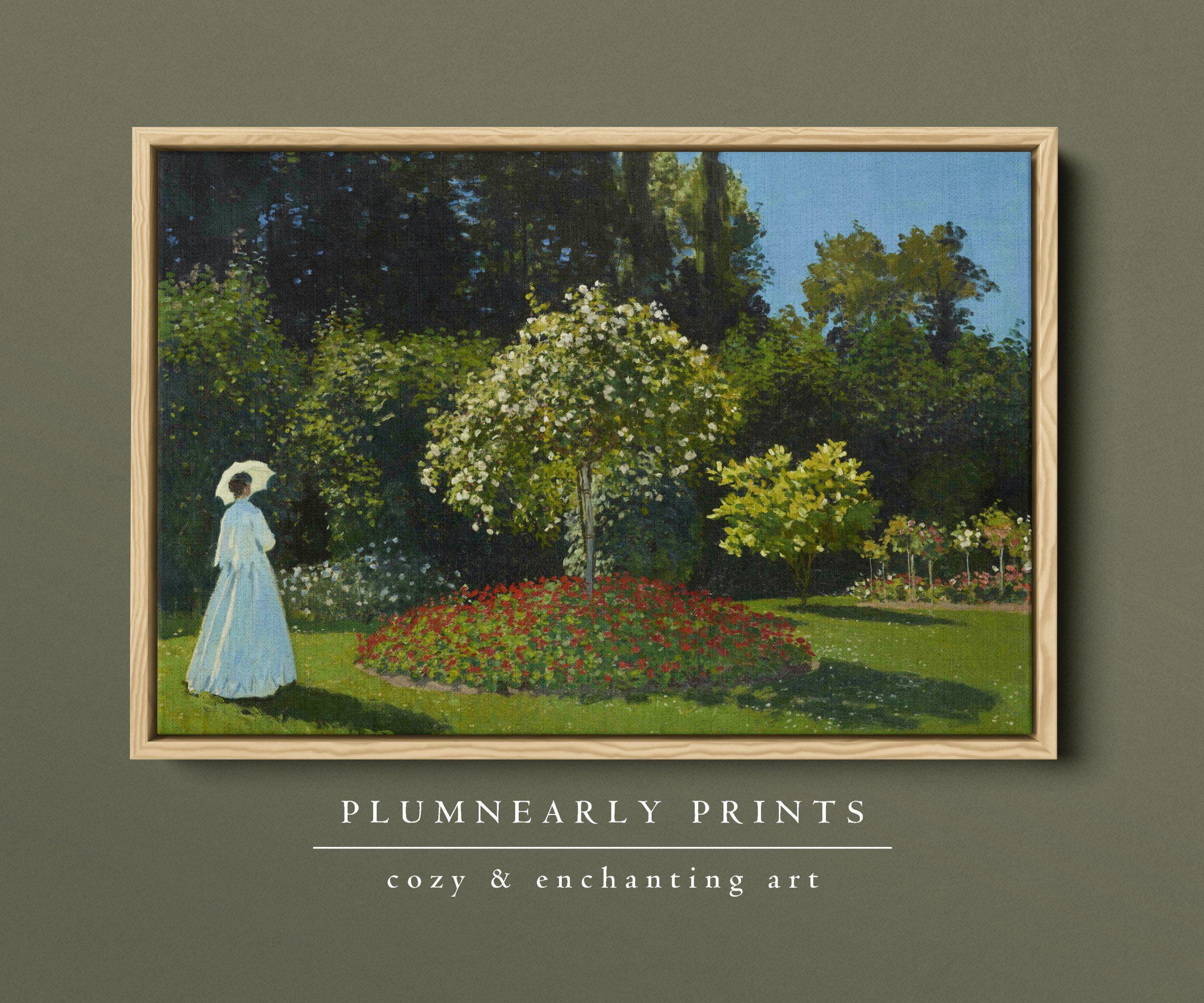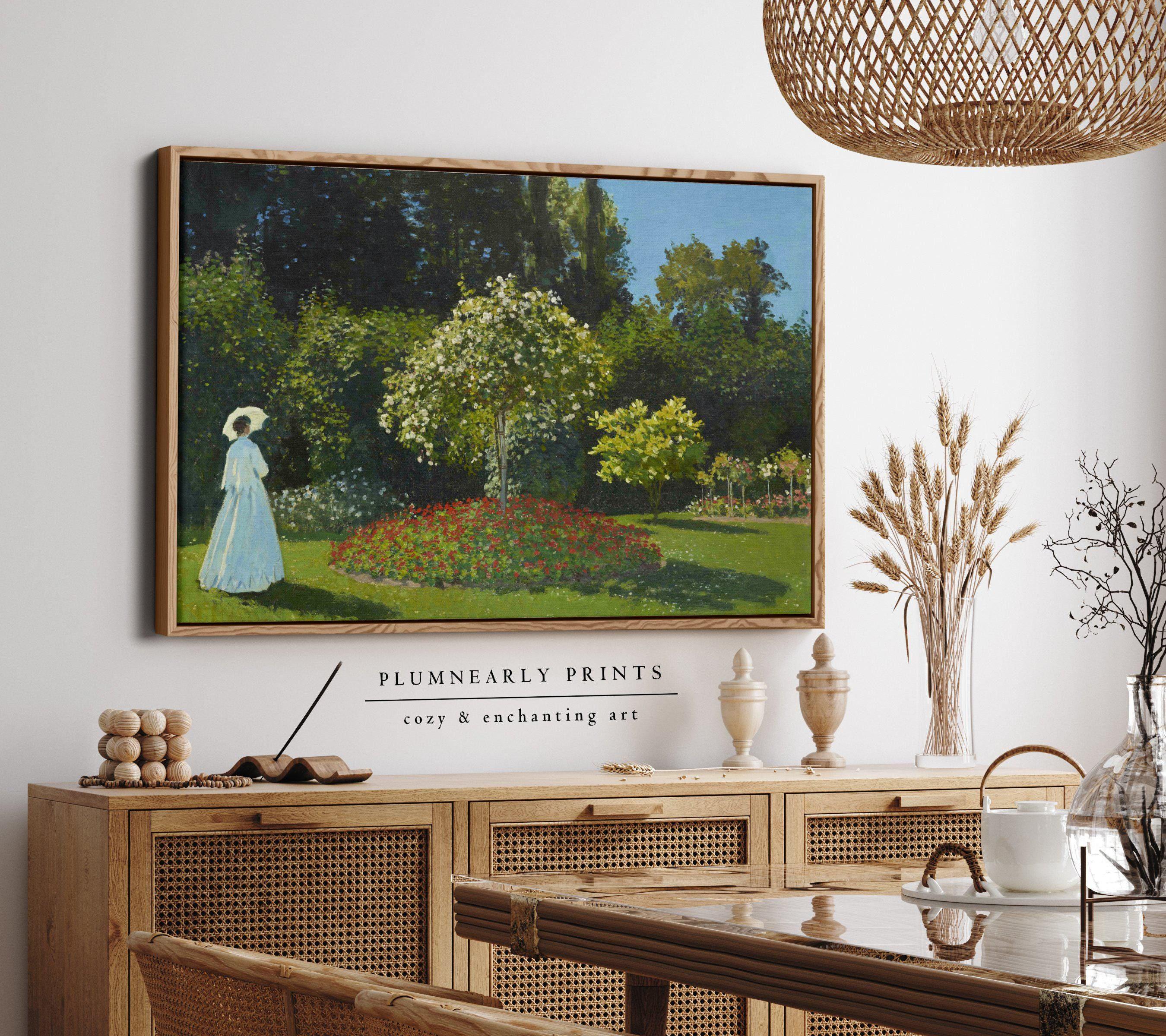 Monet Flower Garden Landscape Oil Painting Framed Canvas, Vintage Impressionist Cottagecore Wall Decor, Romantic Regency Victorian Woman