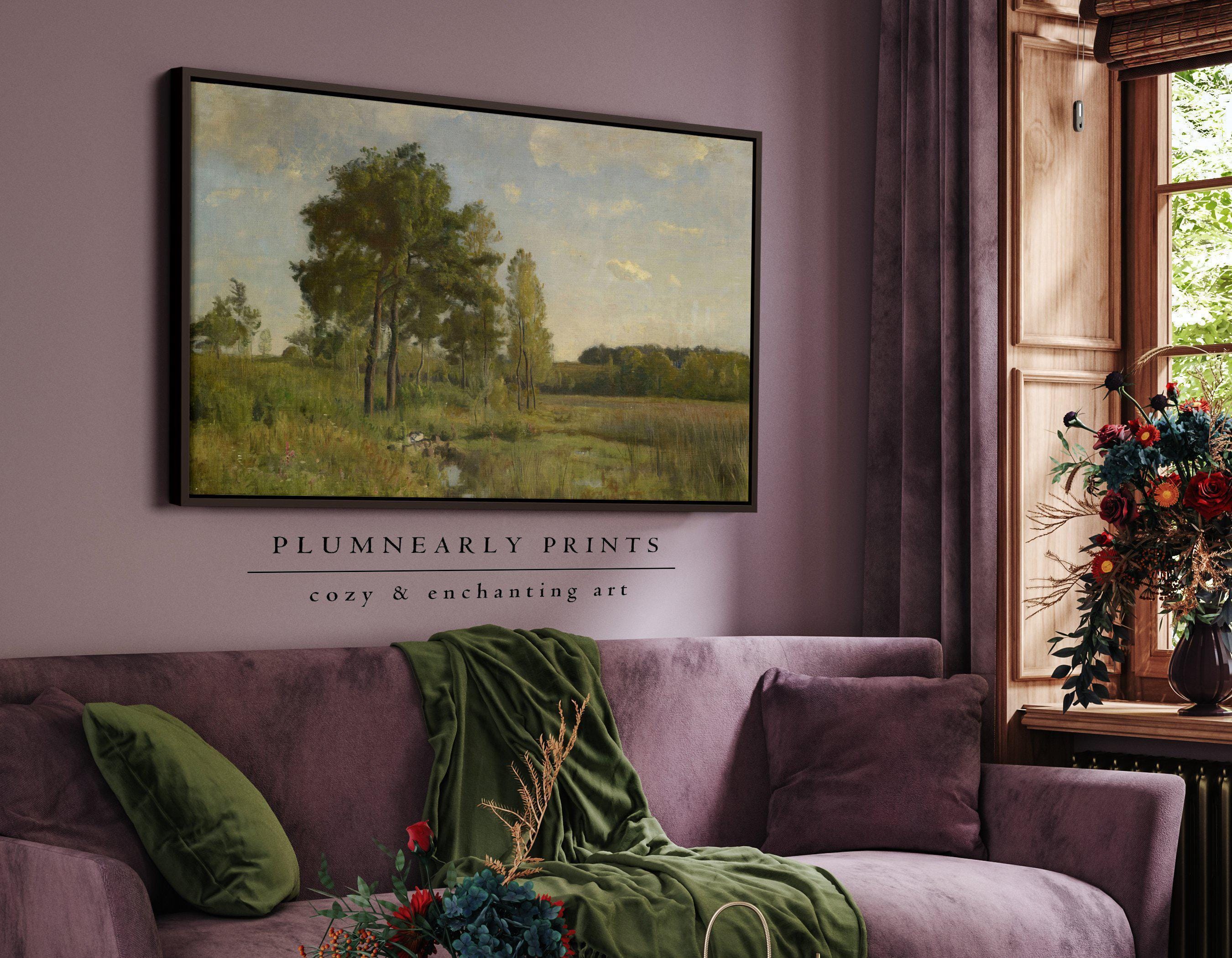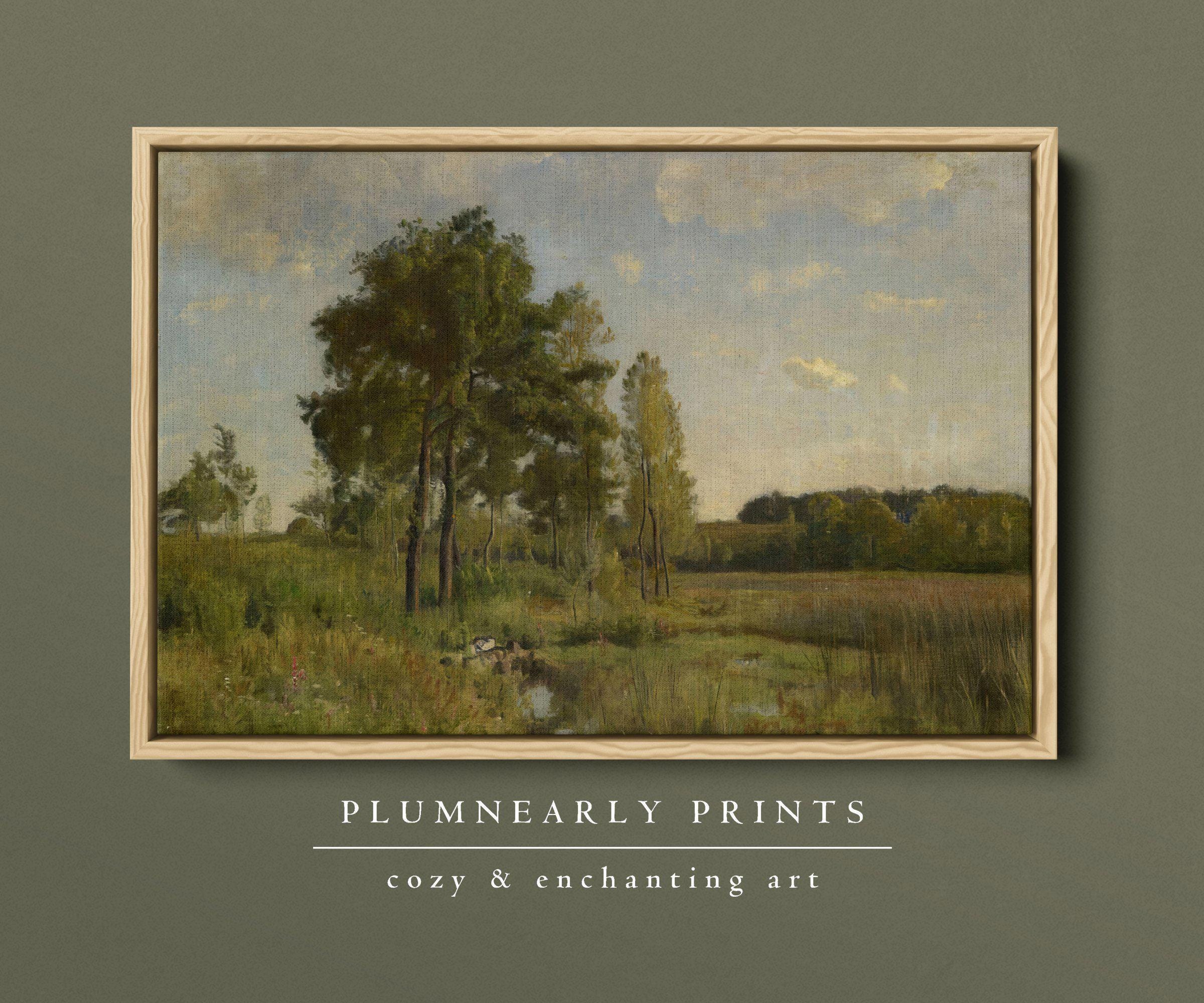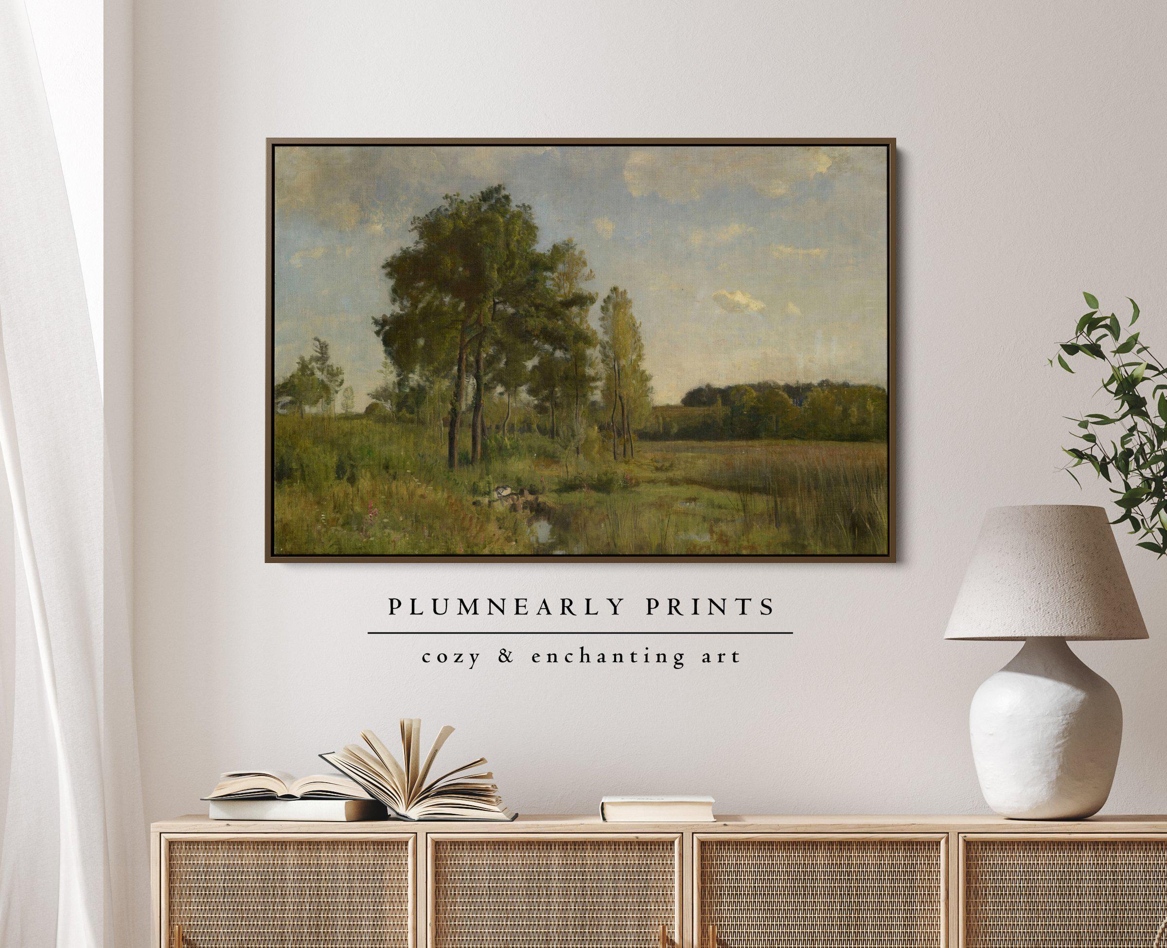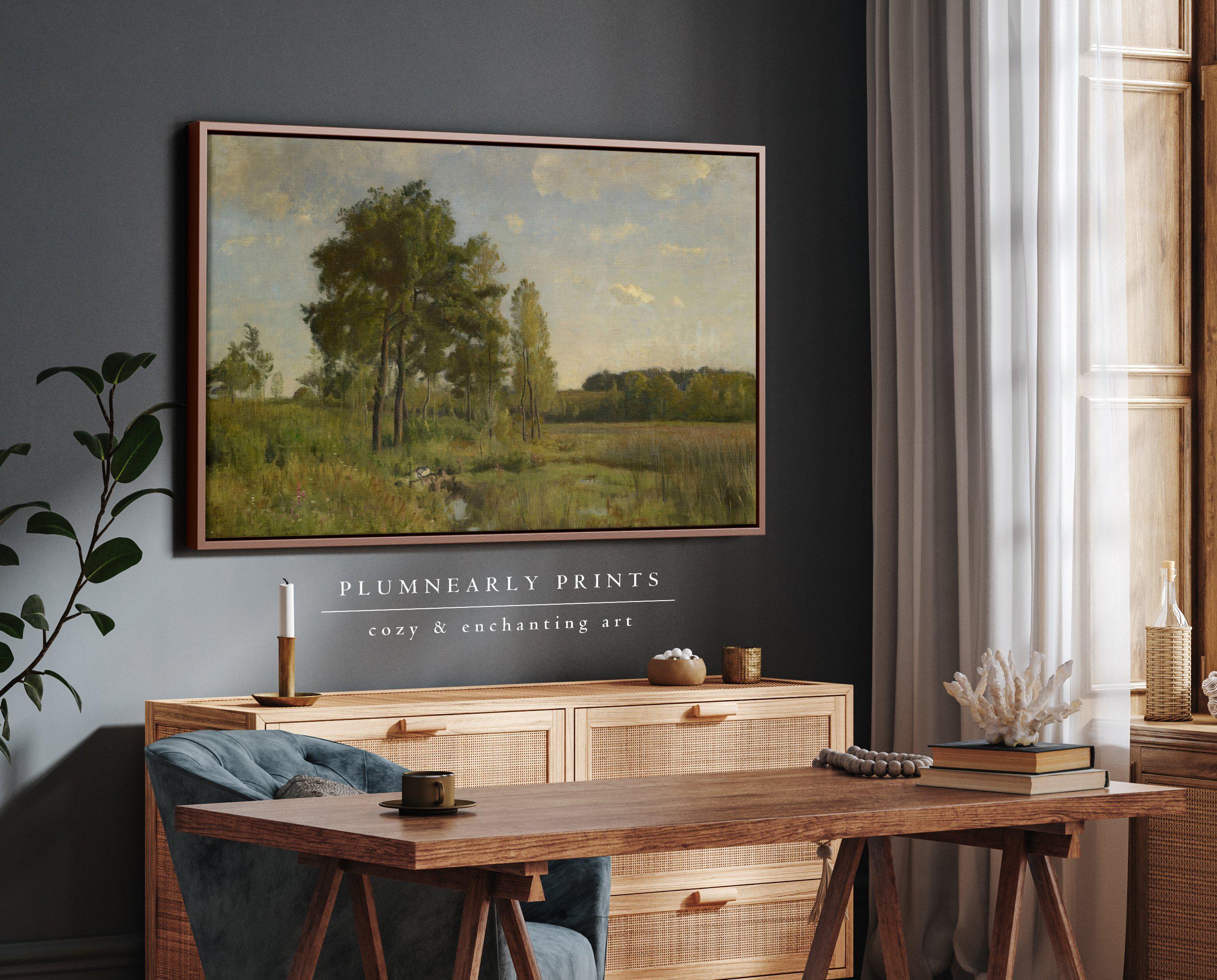 Field Landscape Oil Painting Framed Canvas, Classic Vintage English Country Wall Decor, Neutral Beige Sage Green Cottagecore Countryside
