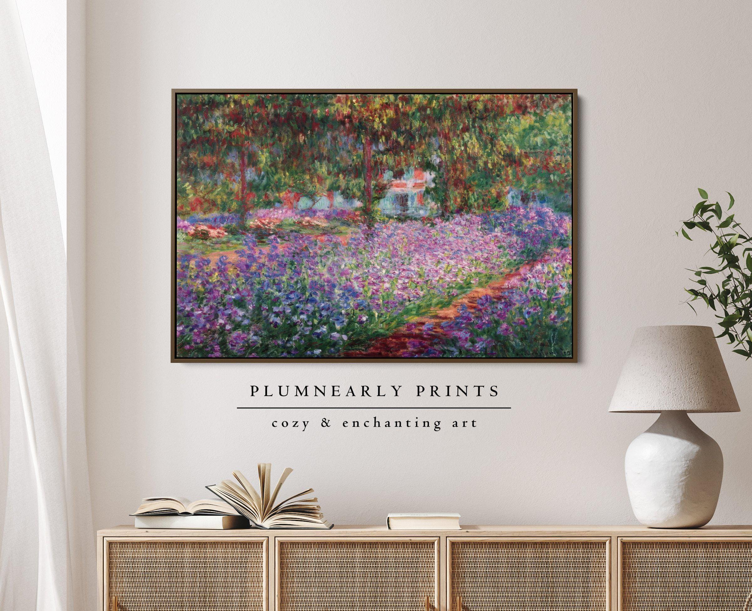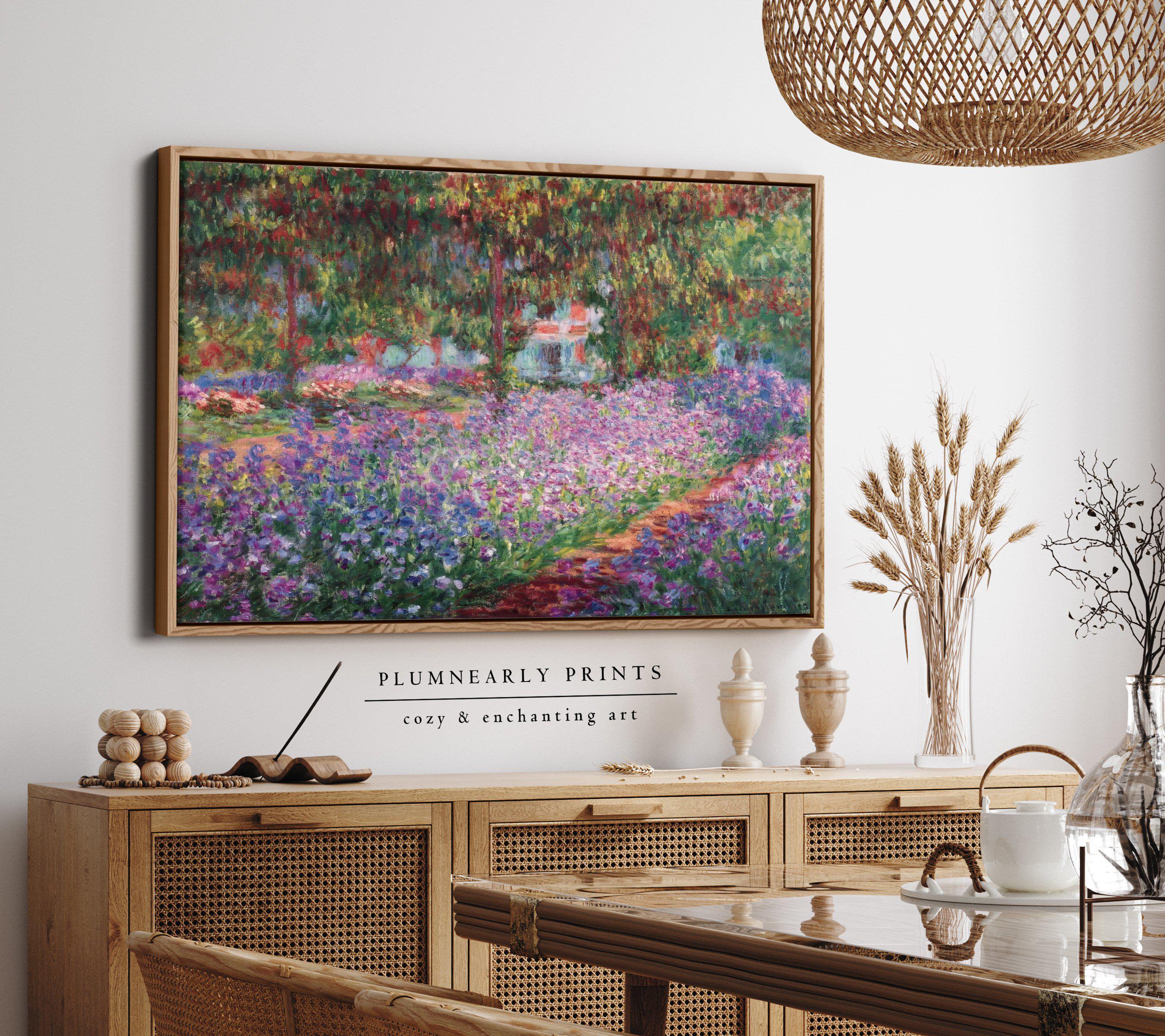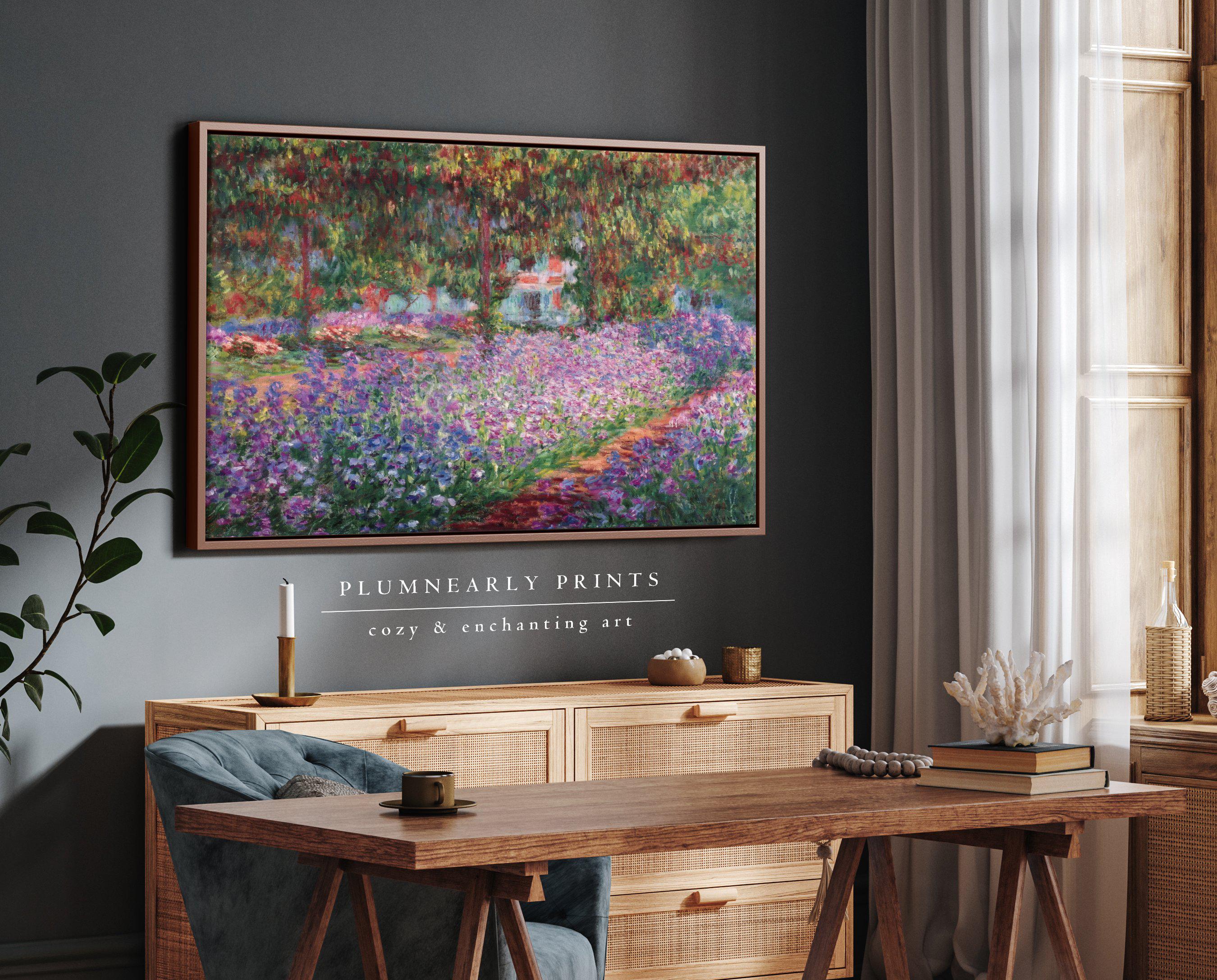 Monet Artist's Garden Landscape Oil Painting Framed Canvas, Colorful Impressionist Flowers, Vibrant Maximalist Purple Floral Home Decor