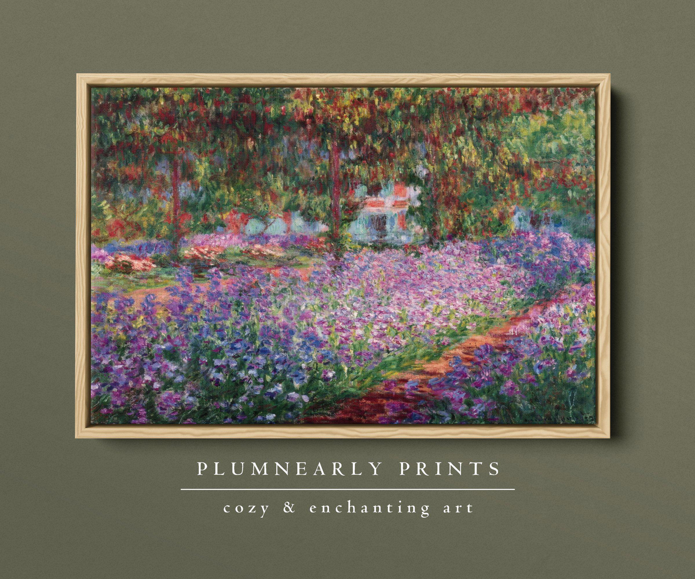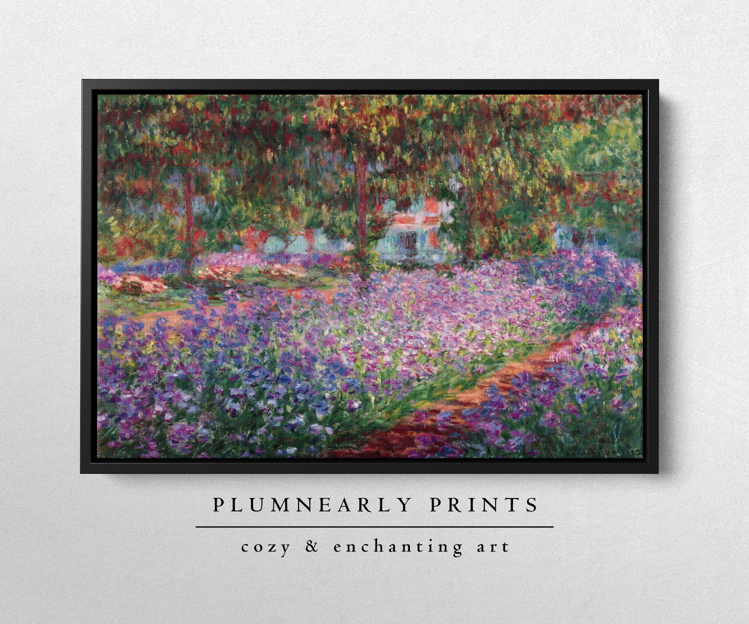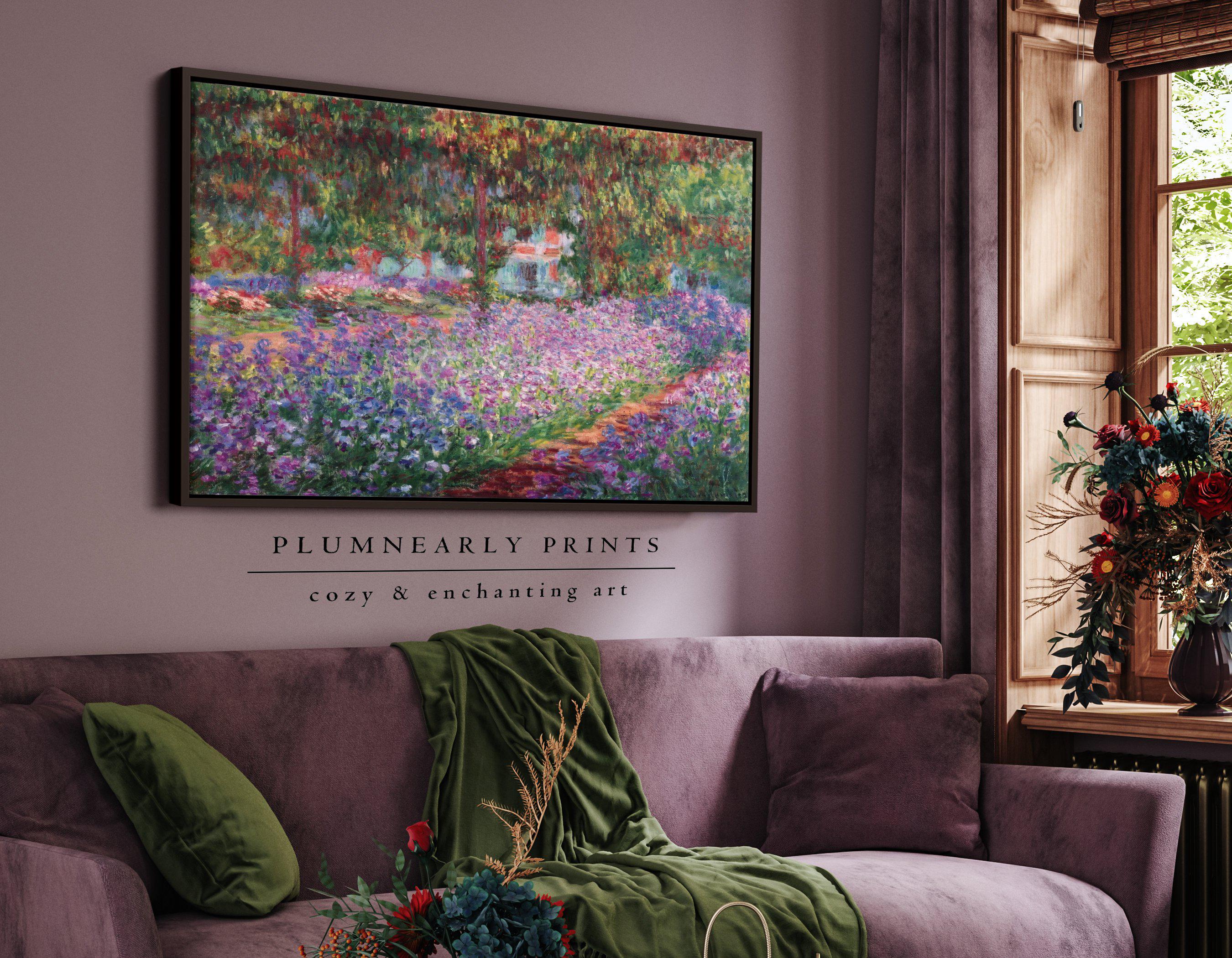 Monet Artist's Garden Landscape Oil Painting Framed Canvas, Colorful Impressionist Flowers, Vibrant Maximalist Purple Floral Home Decor