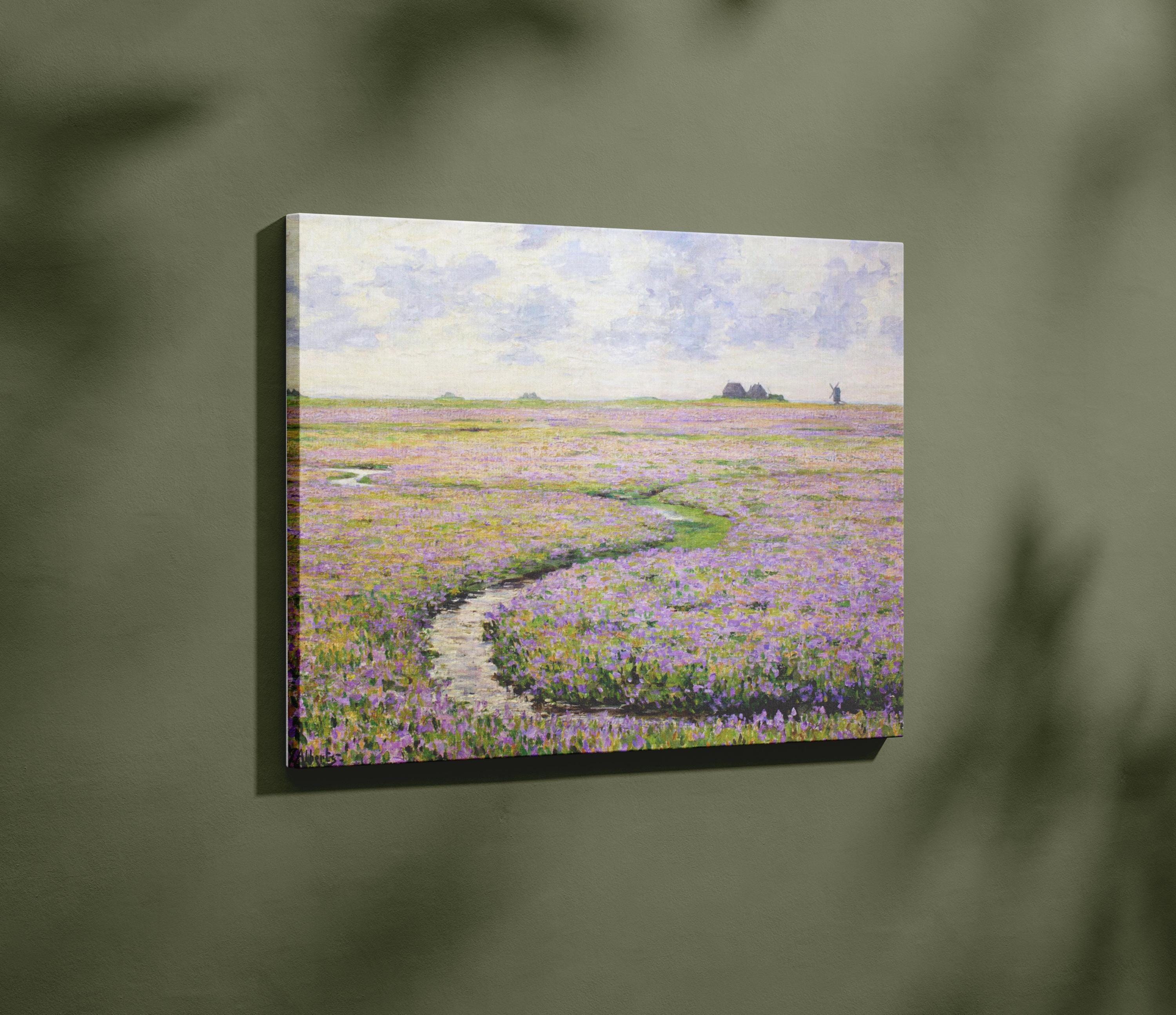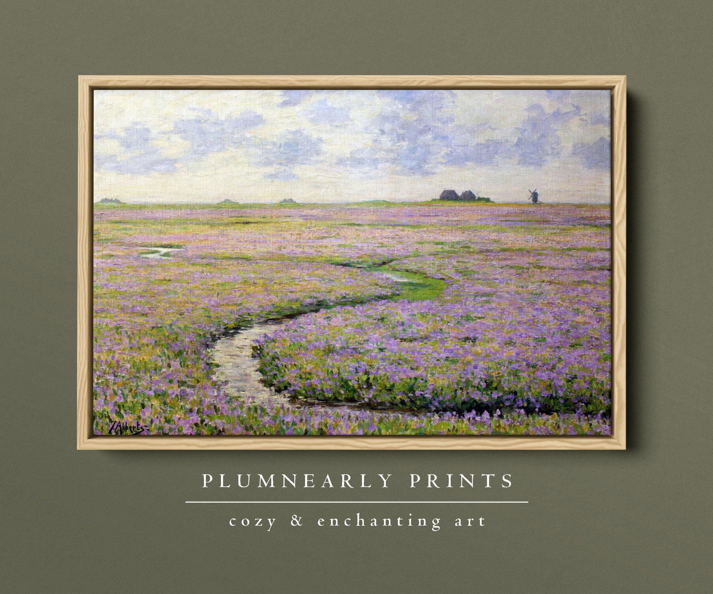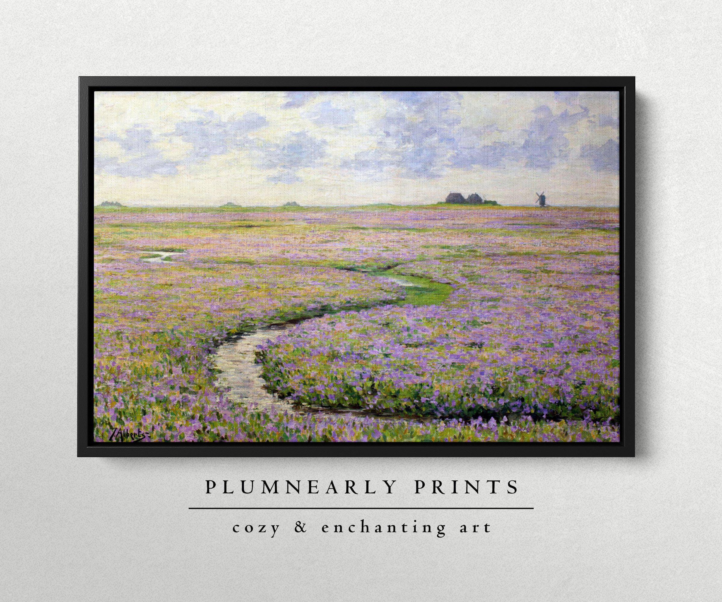 Bring the beauty of nature indoors with this exquisite reproduction of an Impressionist landscape painting, Small Low Island in Flower, 1895, by Jacob Alberts. Featuring a vibrant field of purple flowers and a serene winding path, the artwork evokes a sense of peace and tranquility. Perfect for adding a touch of elegance to any room, this vintage-inspired wall art is a must-have for art lovers and decorators alike. Enjoy the timeless appeal of a masterful oil painting in your own home.