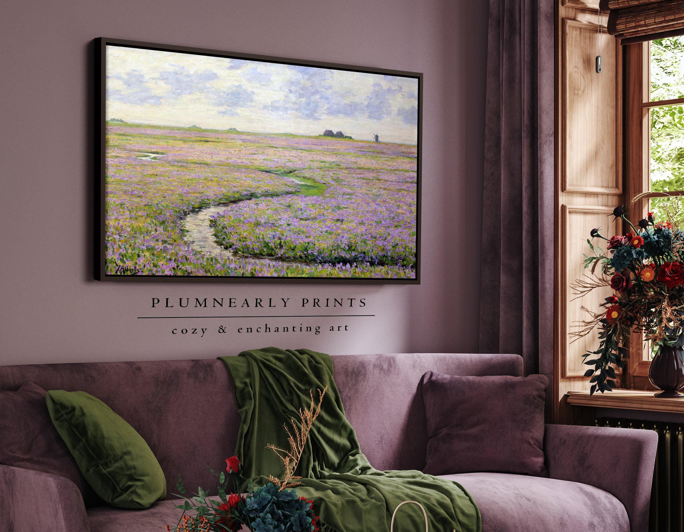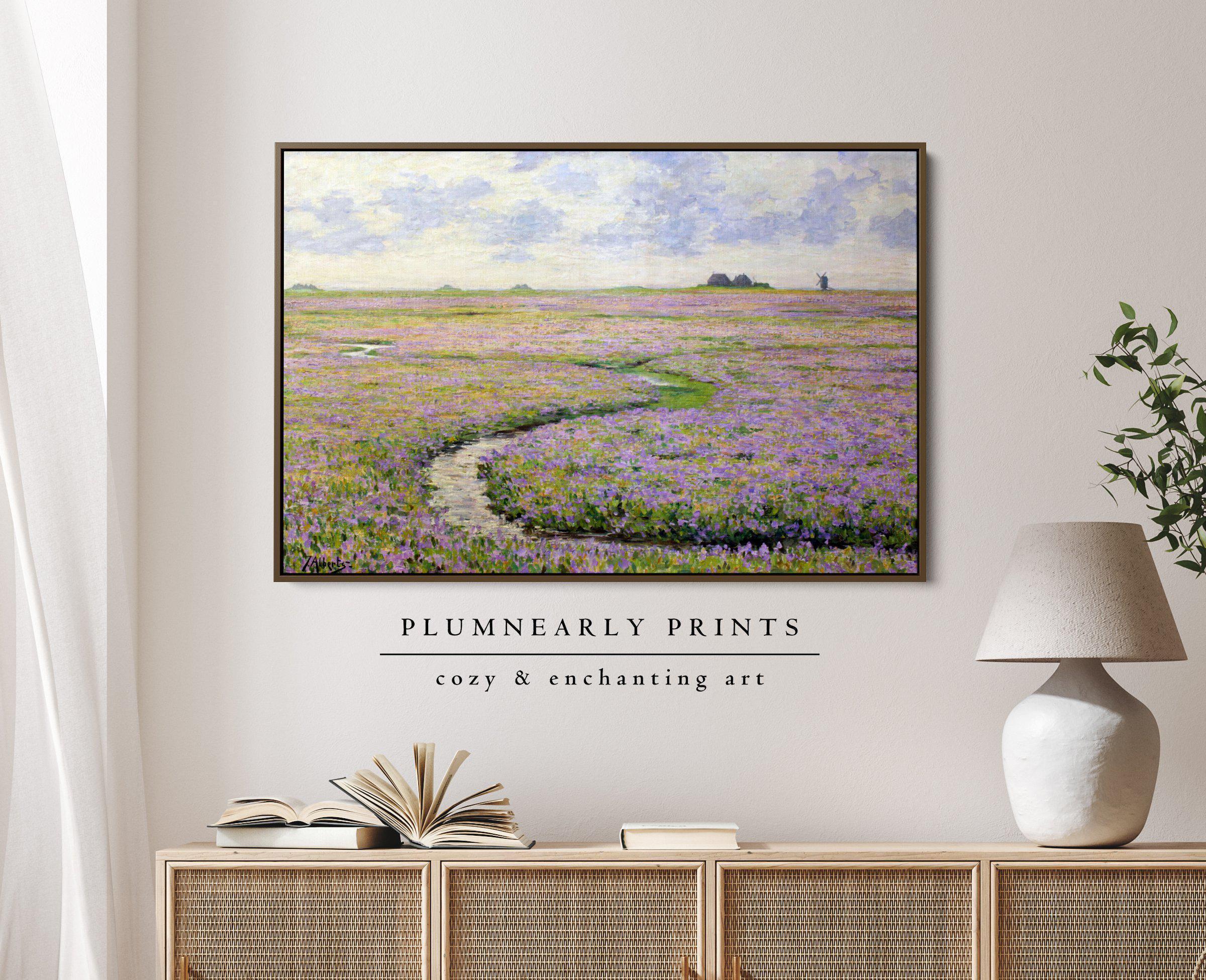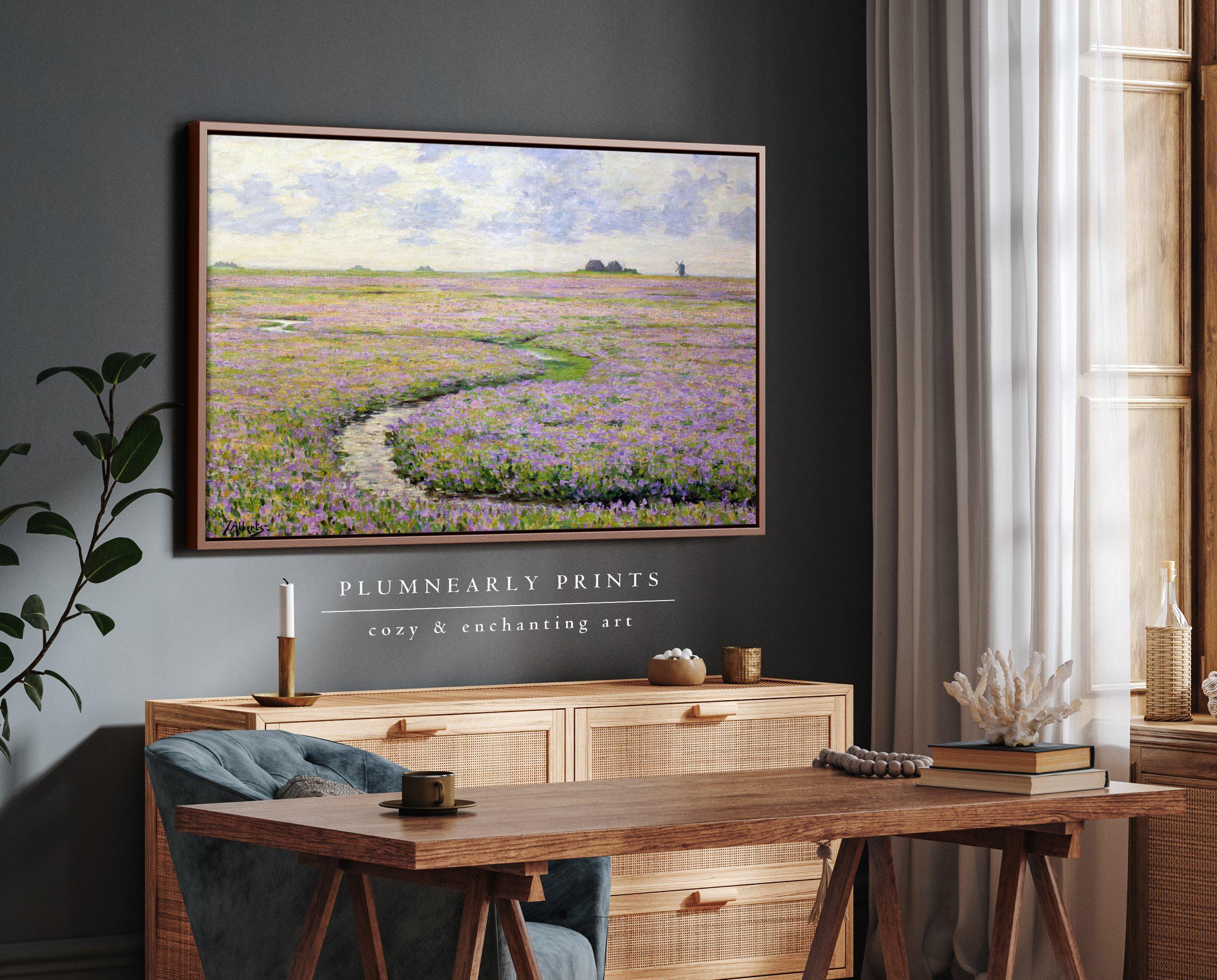 Alberts Wildflower Field Landscape Oil Painting Framed Canvas, Impressionist Lavender Flower Field, Vintage Purple Wildflower Wall Decor