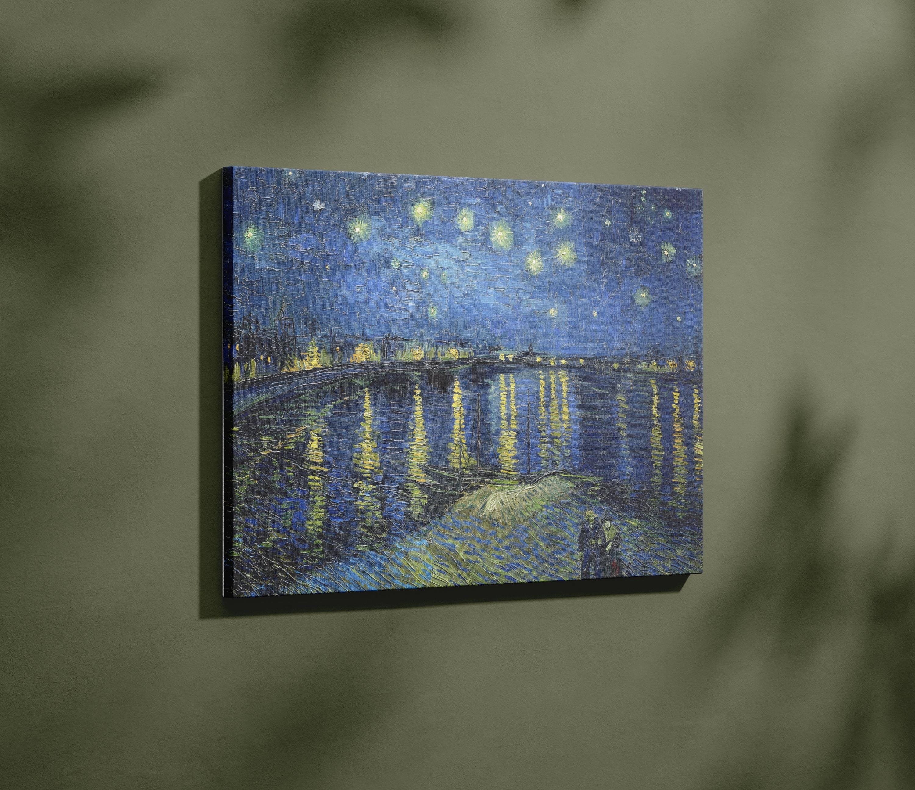 Bring the timeless beauty of Van Gogh's Starry Night over the Rhone into your home or office. This stunning wall art print captures the mesmerizing reflections on the water and shimmering night sky, adding an elegant touch to any space. Perfect for art enthusiasts, this high-quality reproduction showcases the intricate brushwork and vibrant colors of the original masterpiece. Enhance your decor with this iconic piece and enjoy the serene and captivating ambiance it creates.
