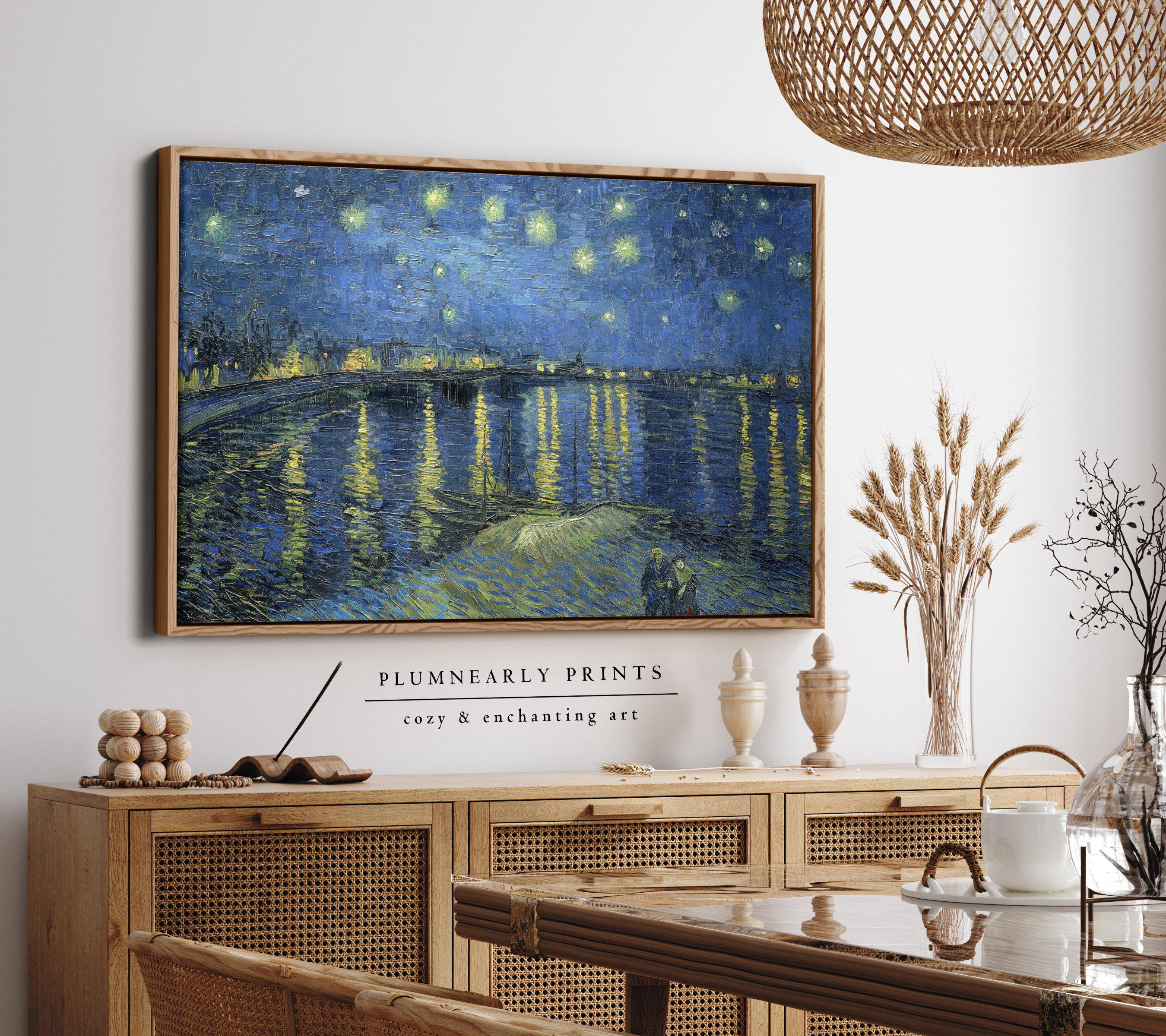Starry Night over the Rhone Wall Framed Canvas, Van Gogh Wall Decor, Indigo Galaxy Blue Mustard Yellow, Impressionist Night Sky Painting
