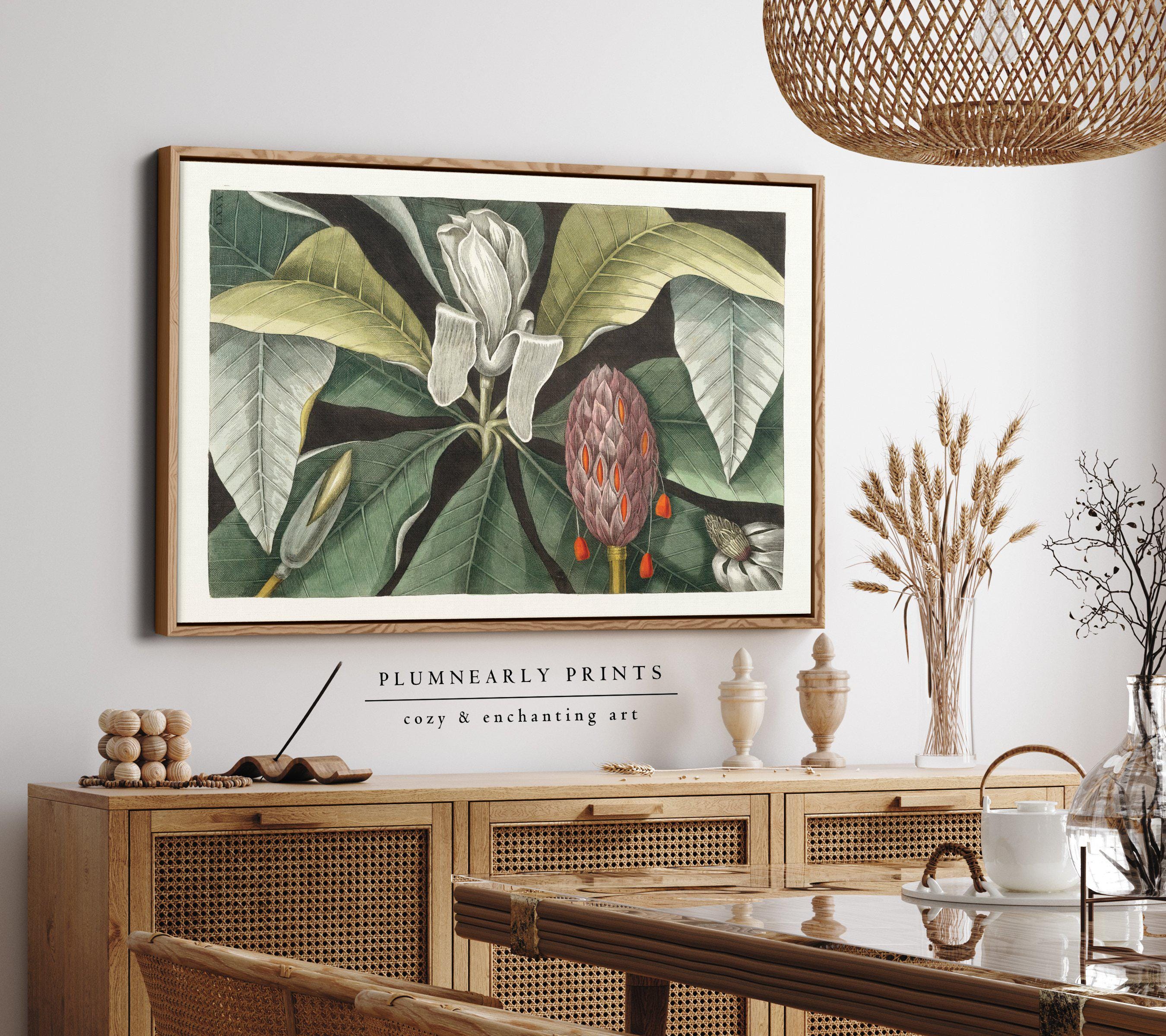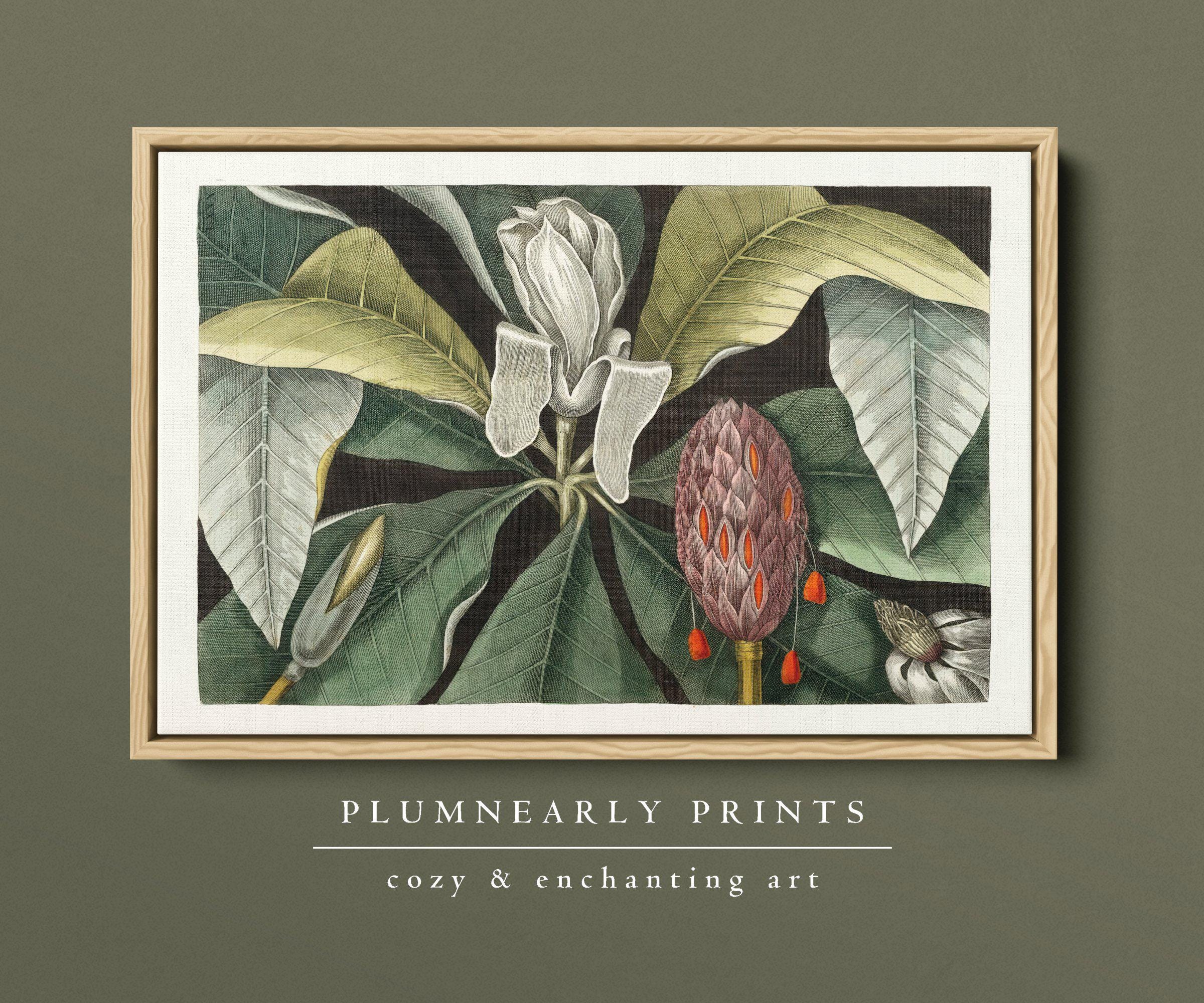 Magnolia Tree Botanical Illustration Framed Canvas, Mark Catesby, Tropical Flower, Neutral White Olive Sage Moss Green Nature Wall Decor