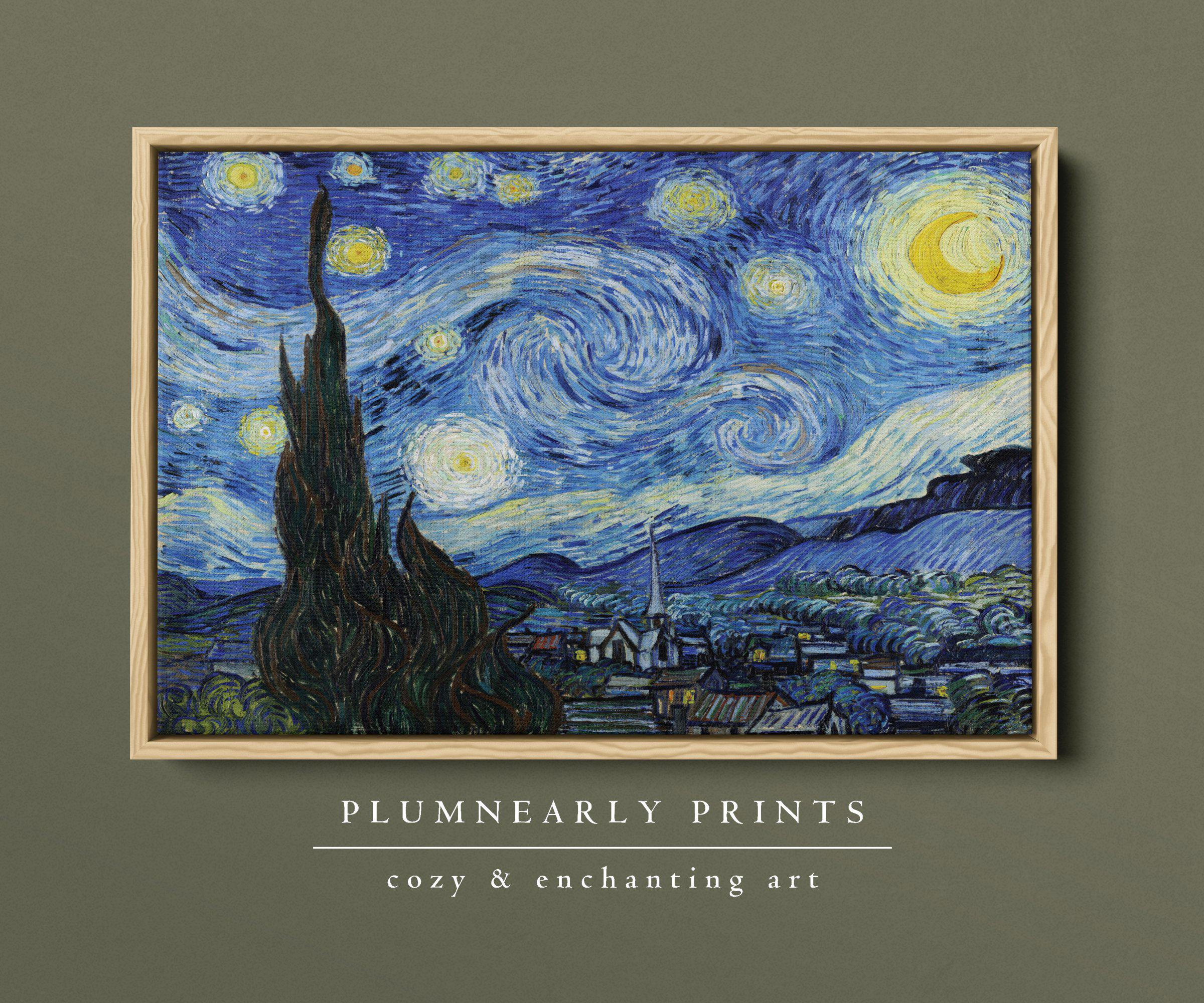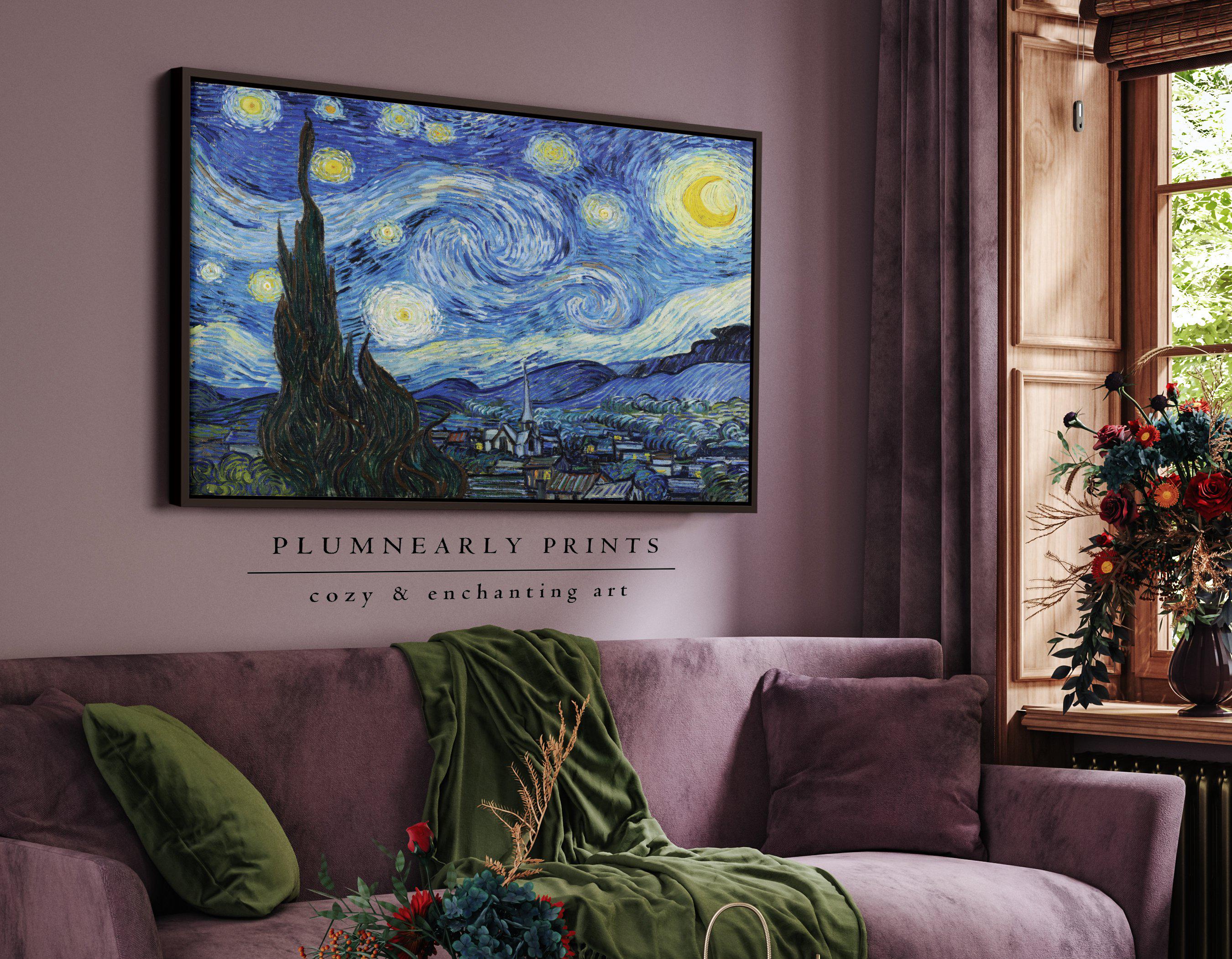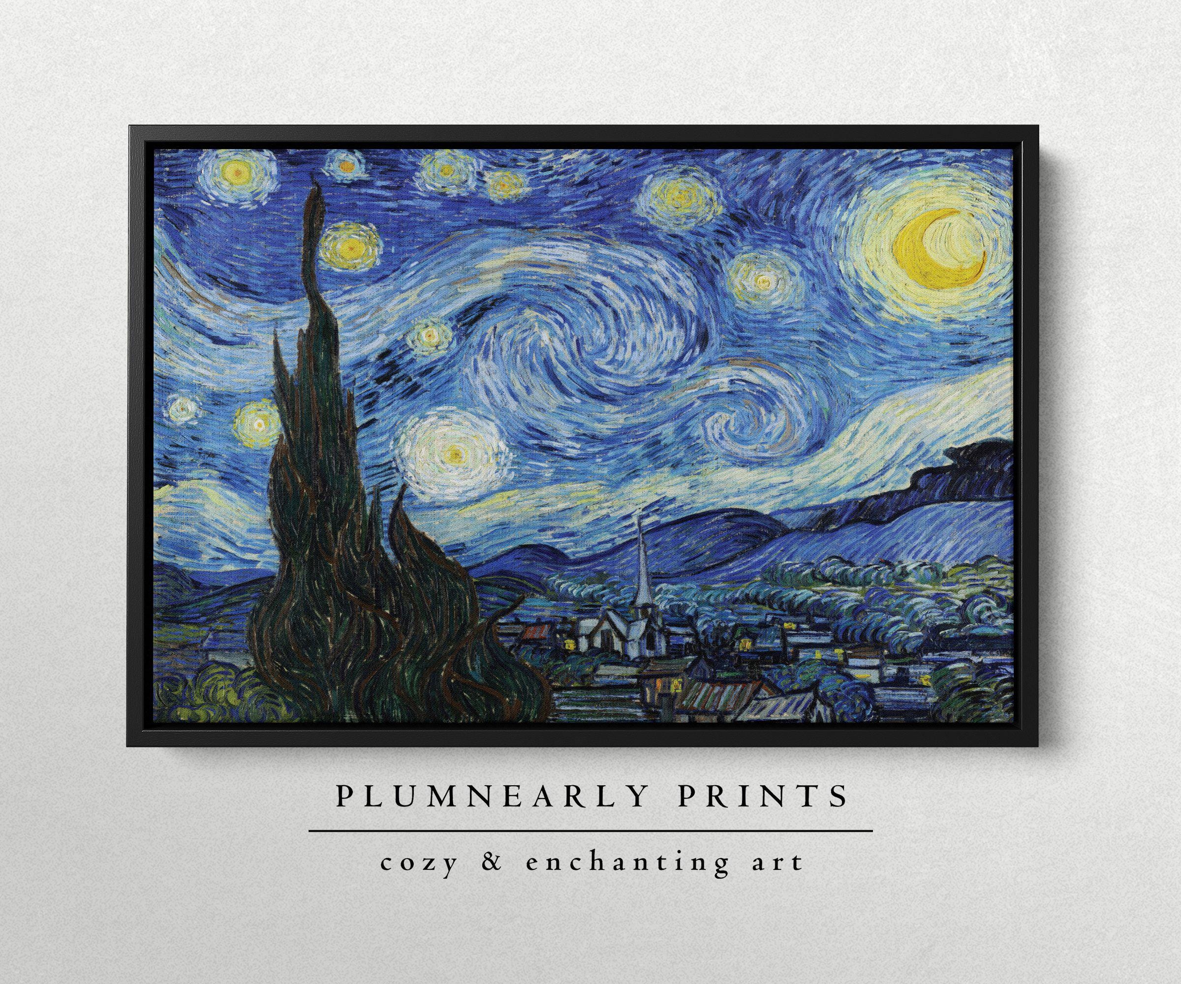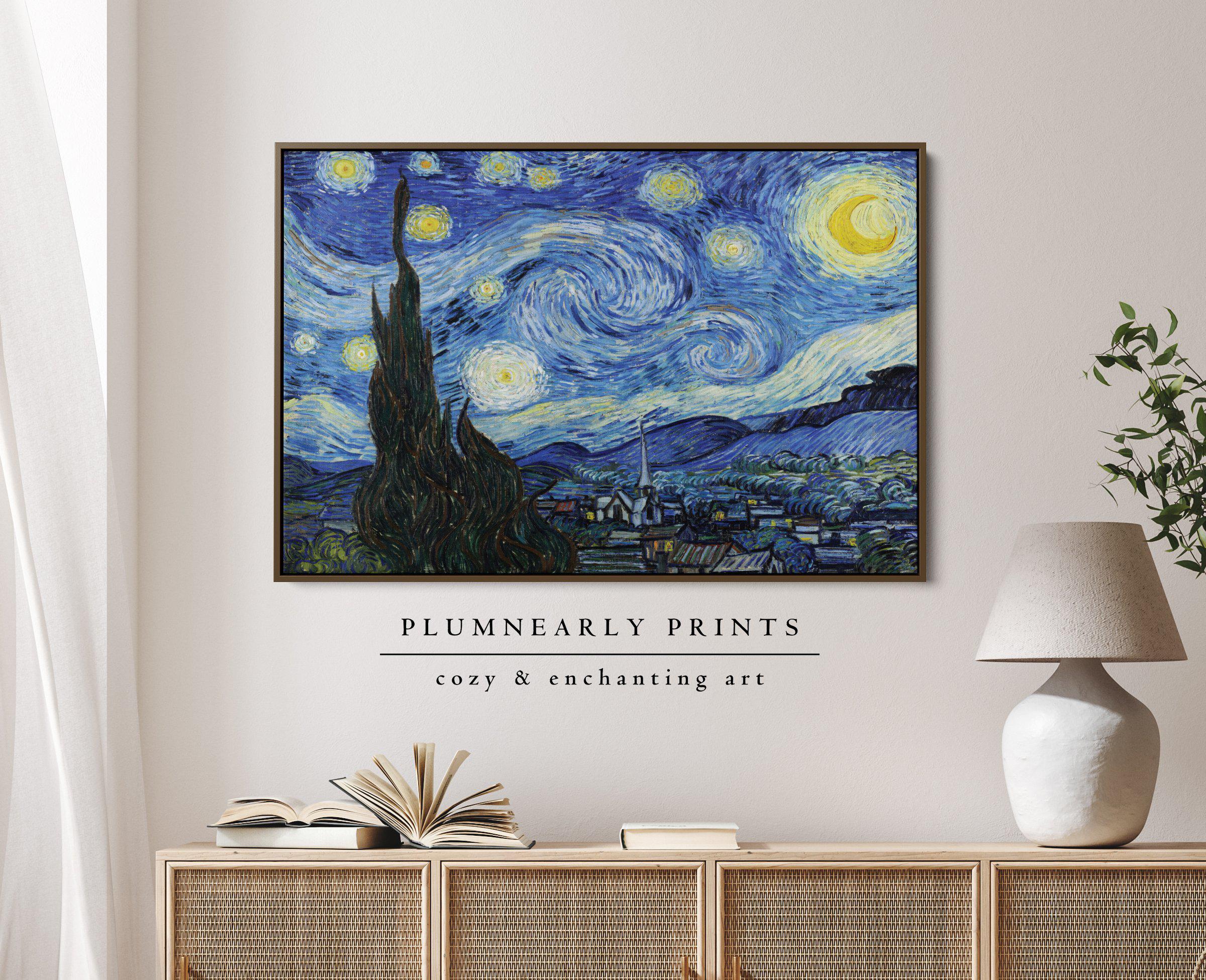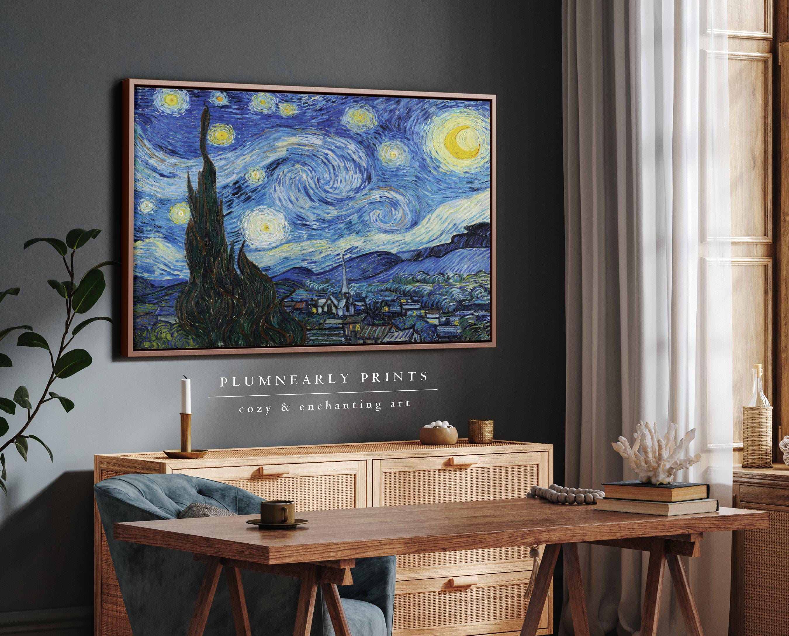 Starry Night Framed Canvas, Vincent Van Gogh Maximalist Sky Art, Impressionist Oil Painting, Indigo Galaxy Blue Mustard Yellow Wall Decor