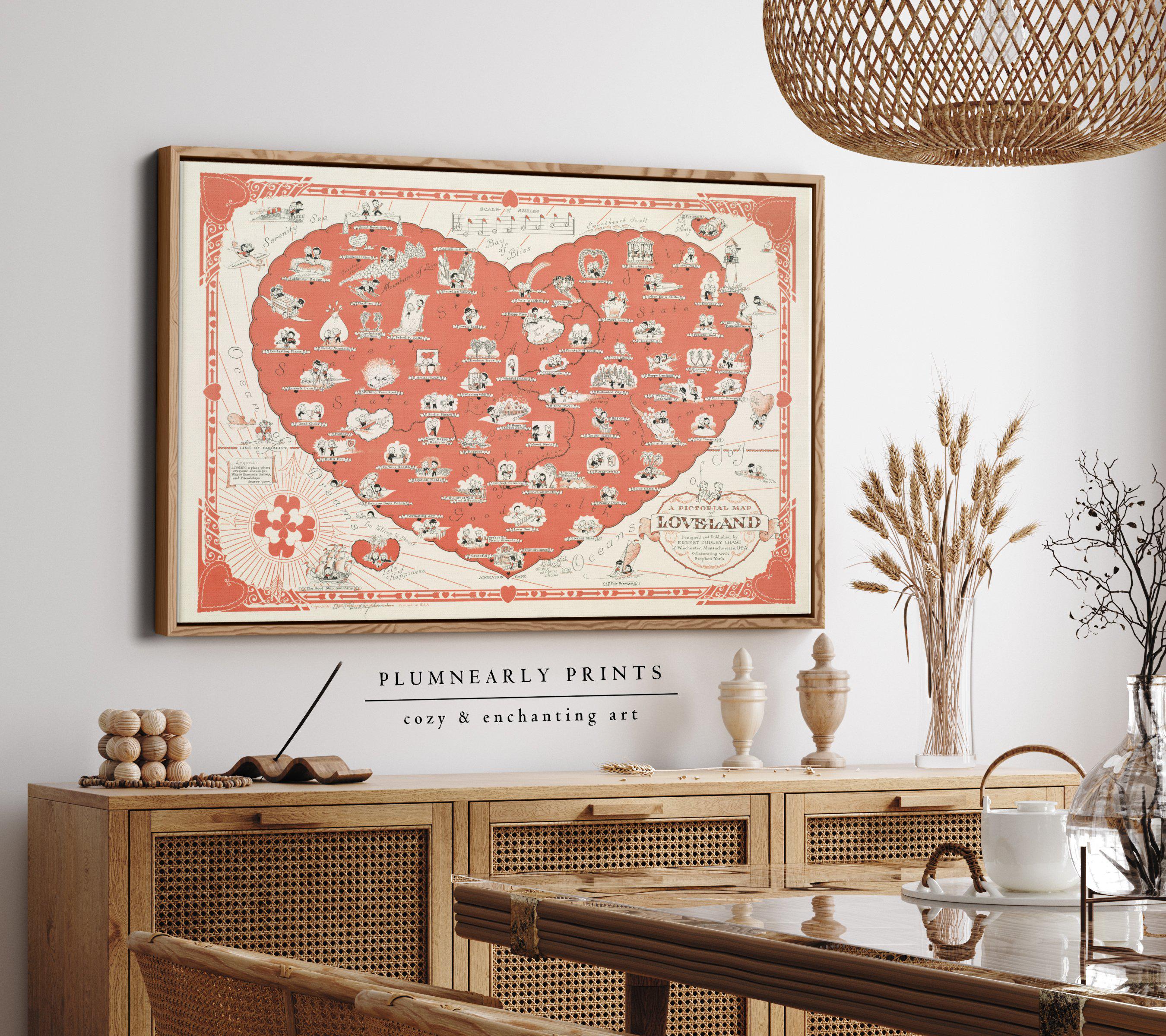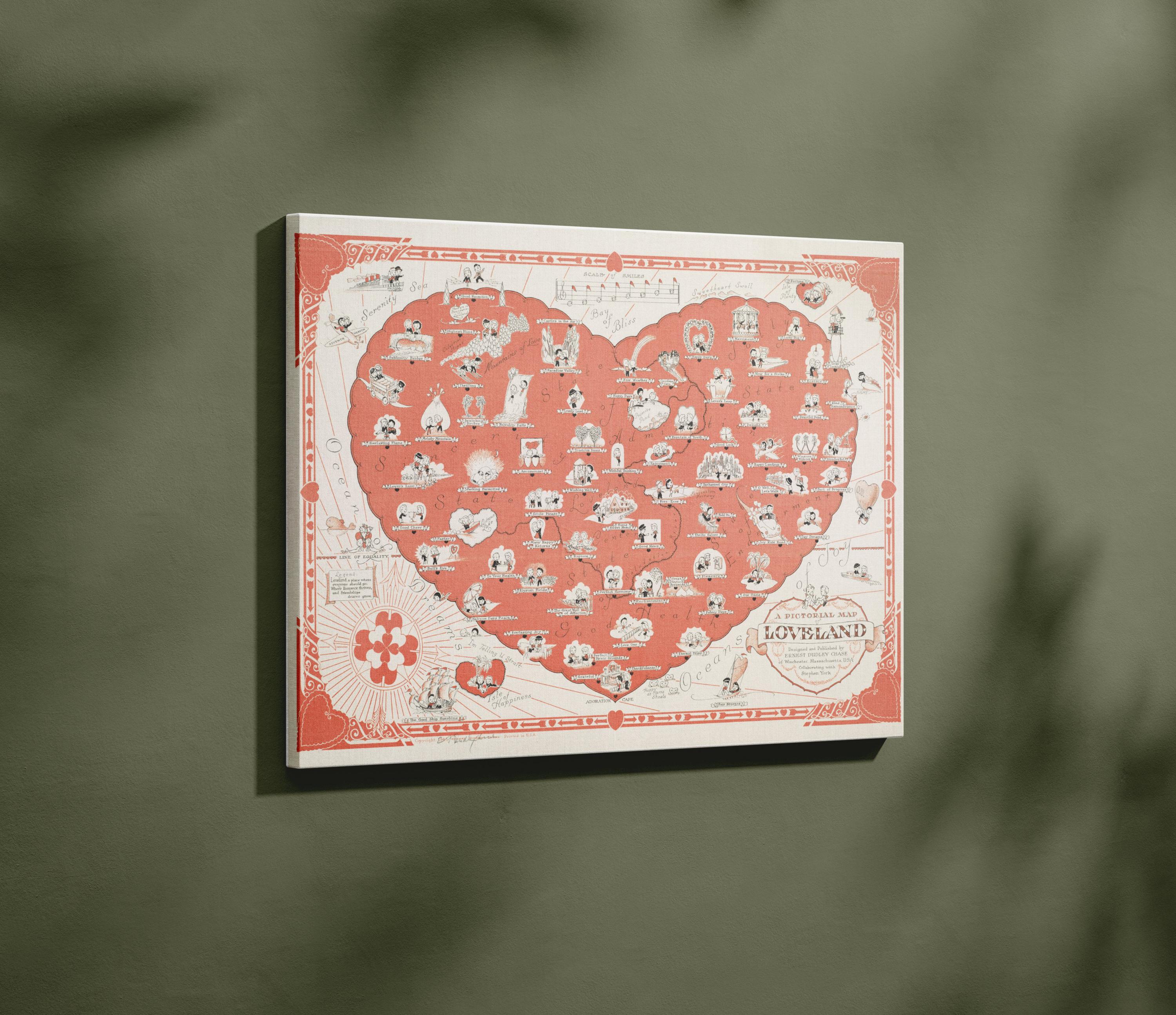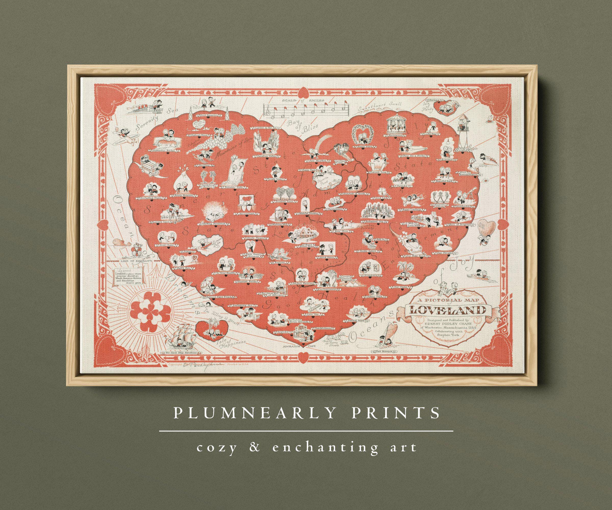 Romantic Love Heart Map Framed Canvas, Antique Loveland Map Wall Art, Vintage Pink Cherry Red Heart Illustration, Valentines Couples Gift