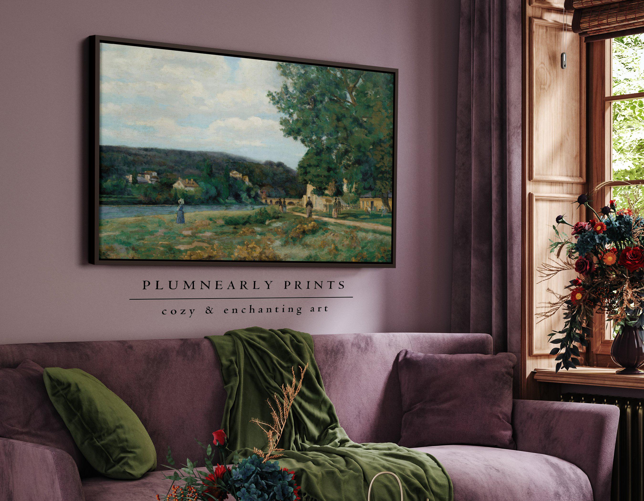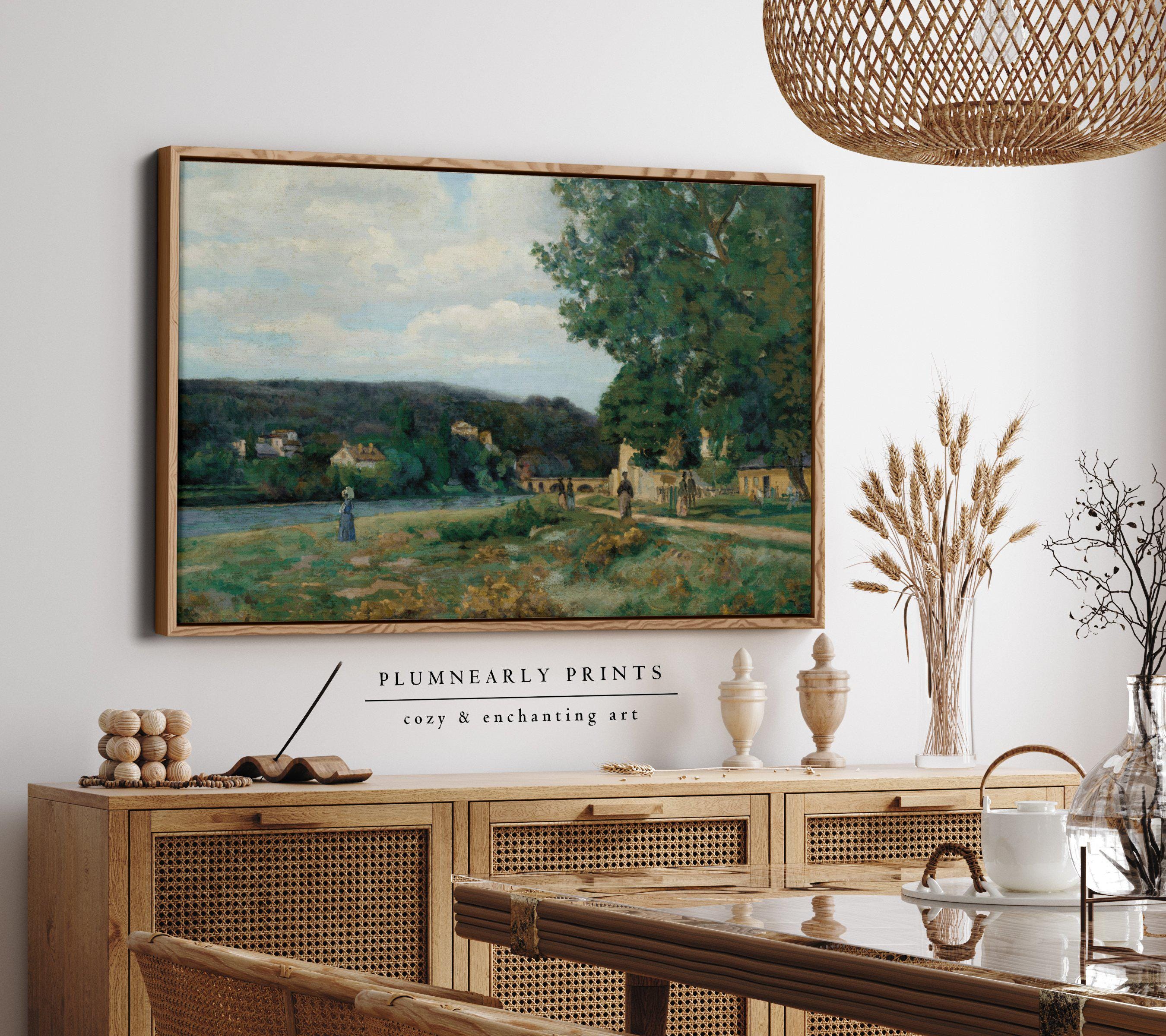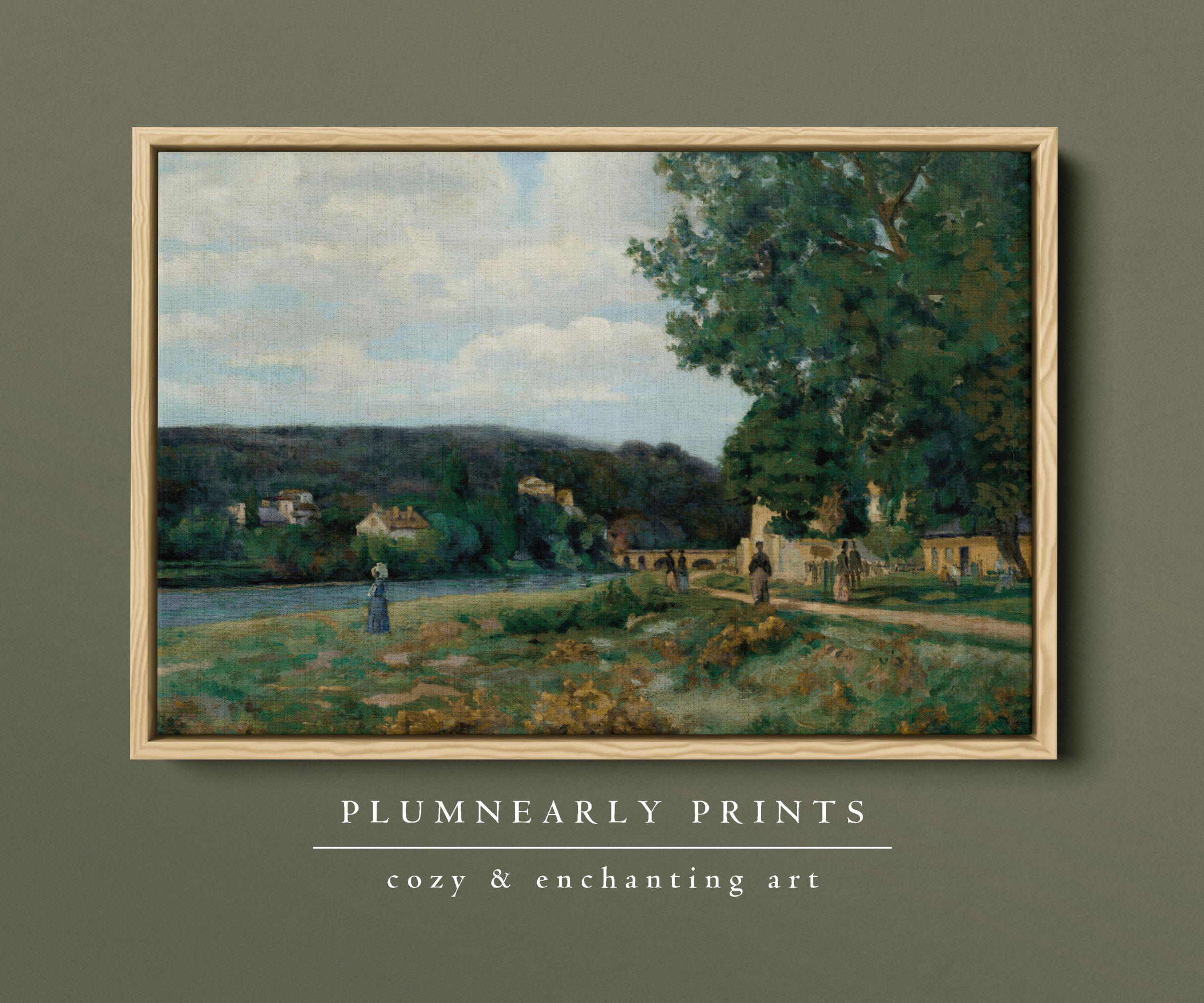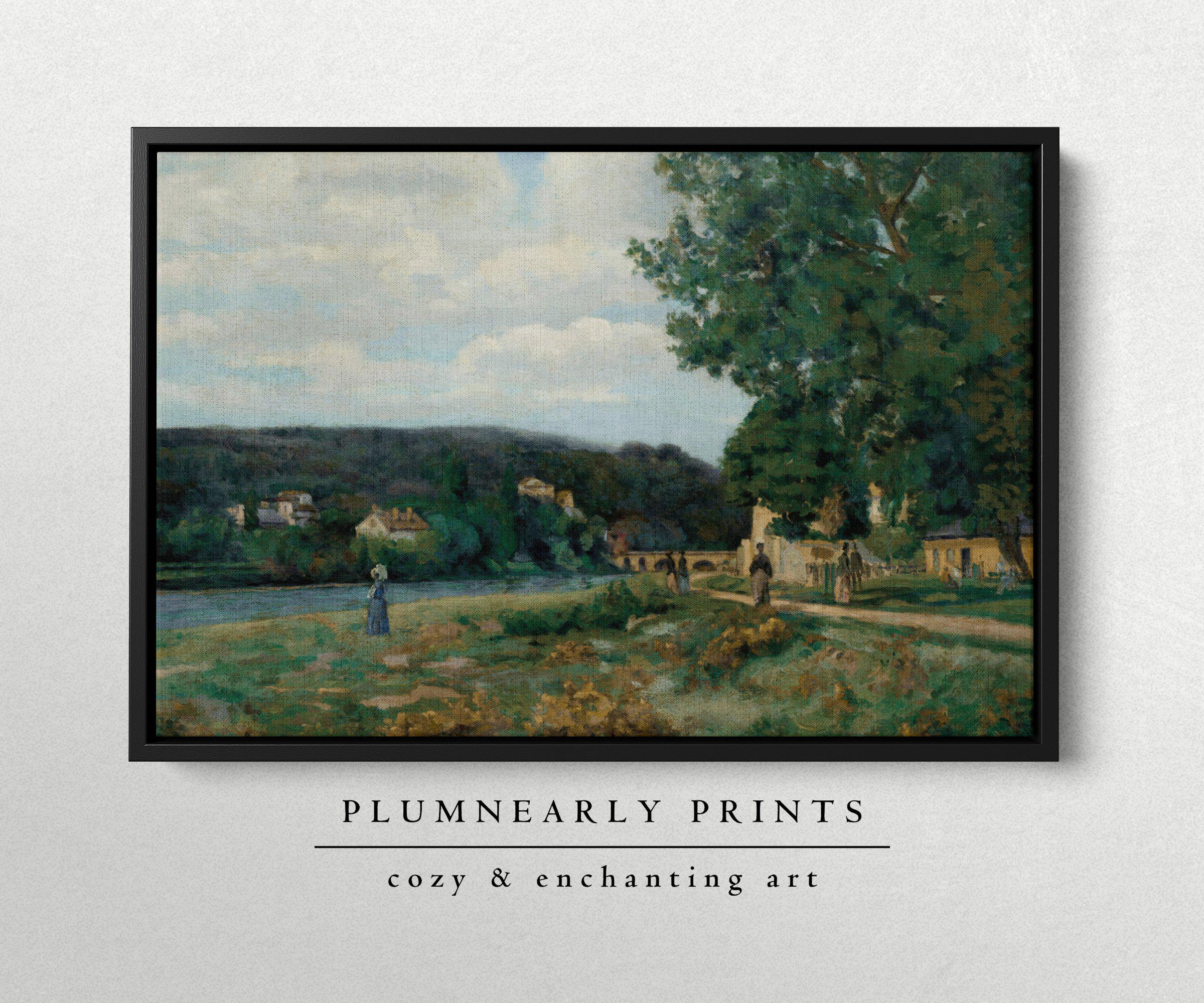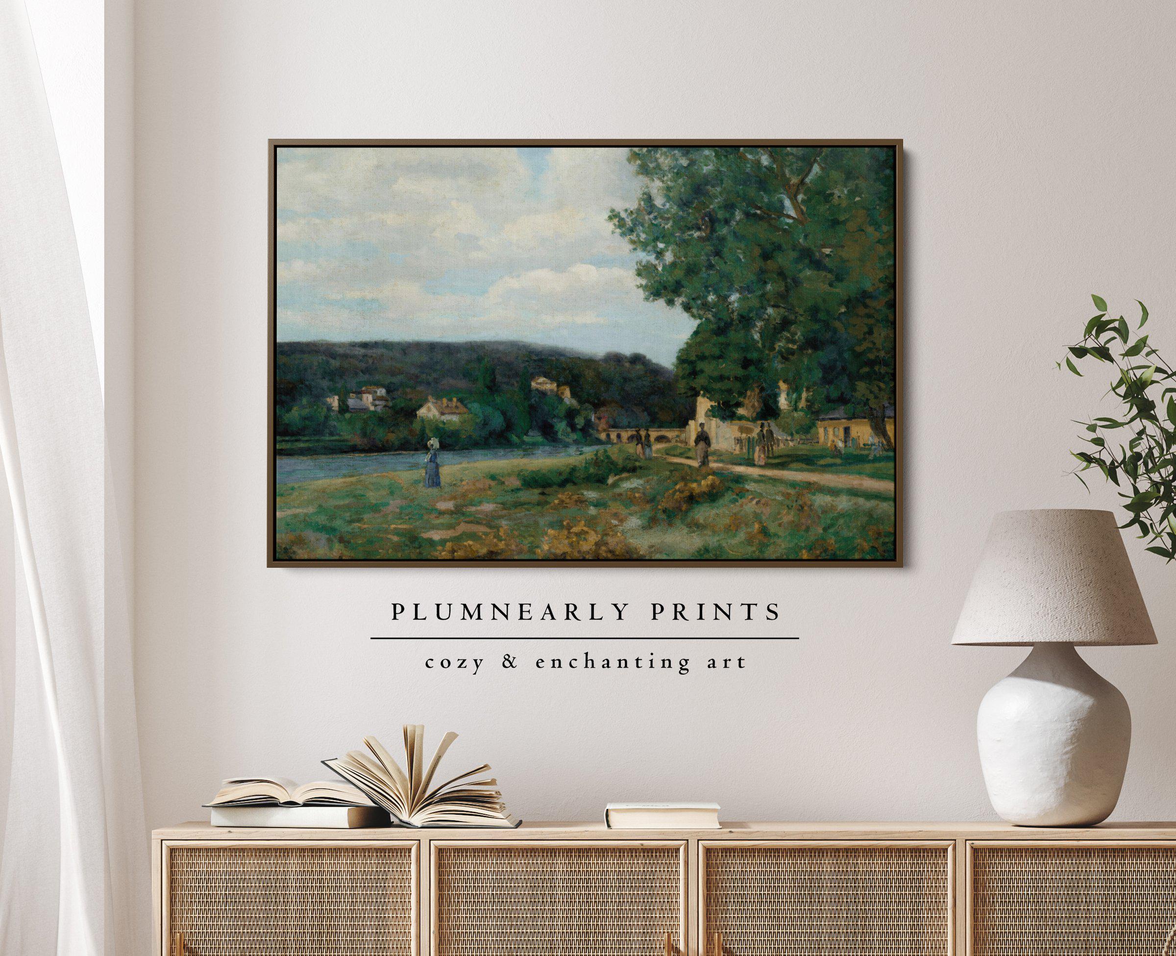Guillaumin Idyllic Riverside Village Framed Canvas, Vintage French Impressionist Landscape, Neutral Sage Green Icy Blue Cottagecore Art