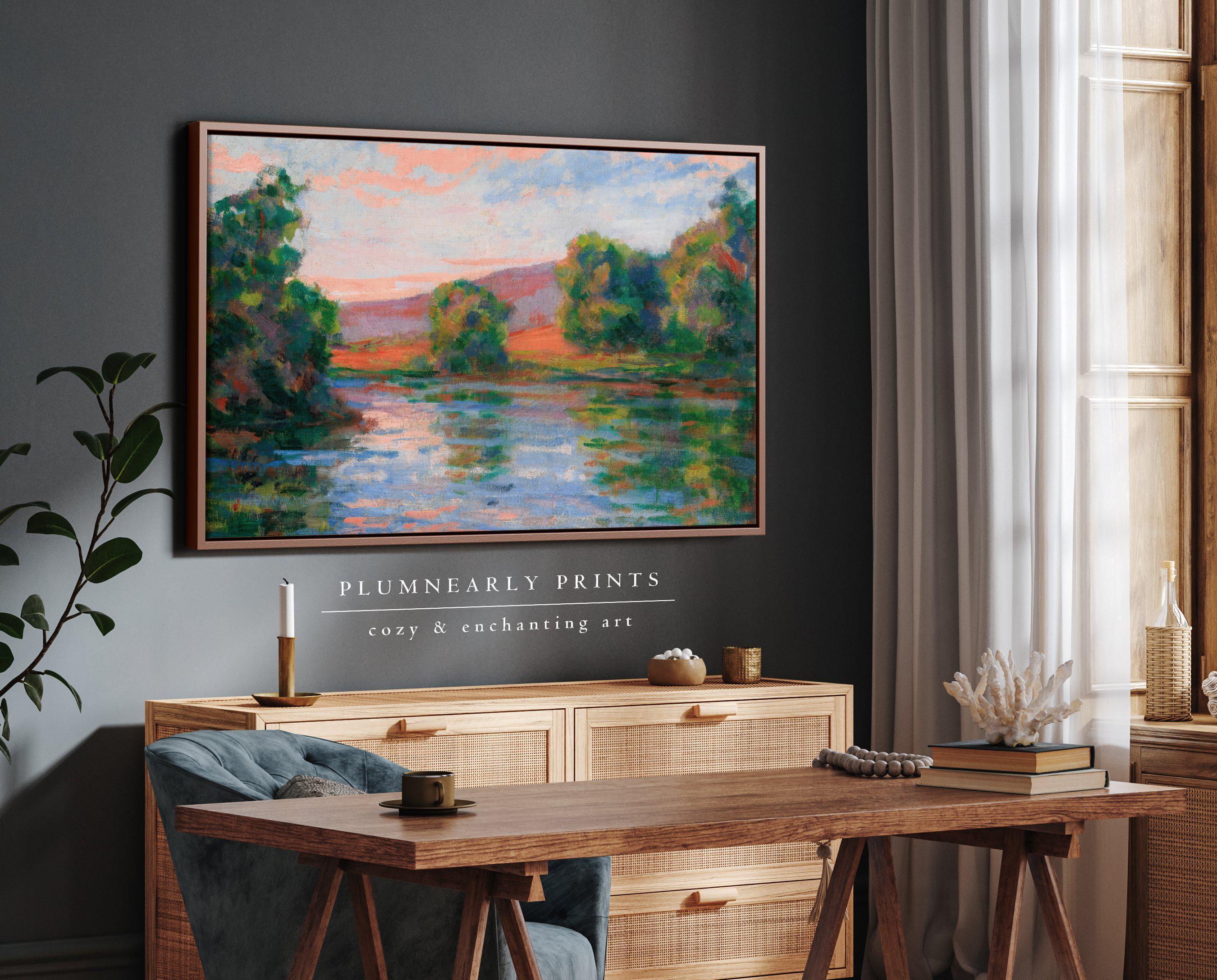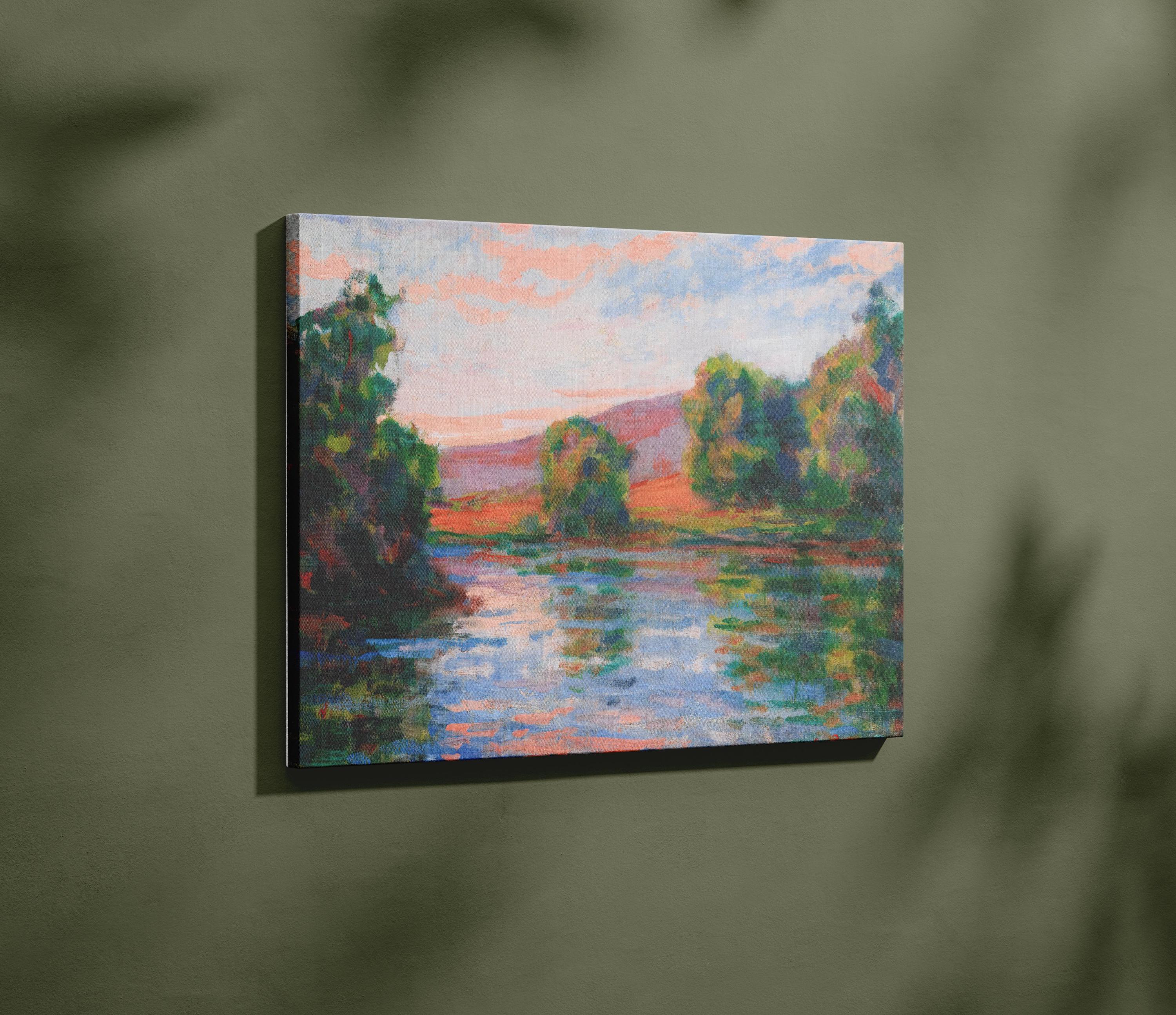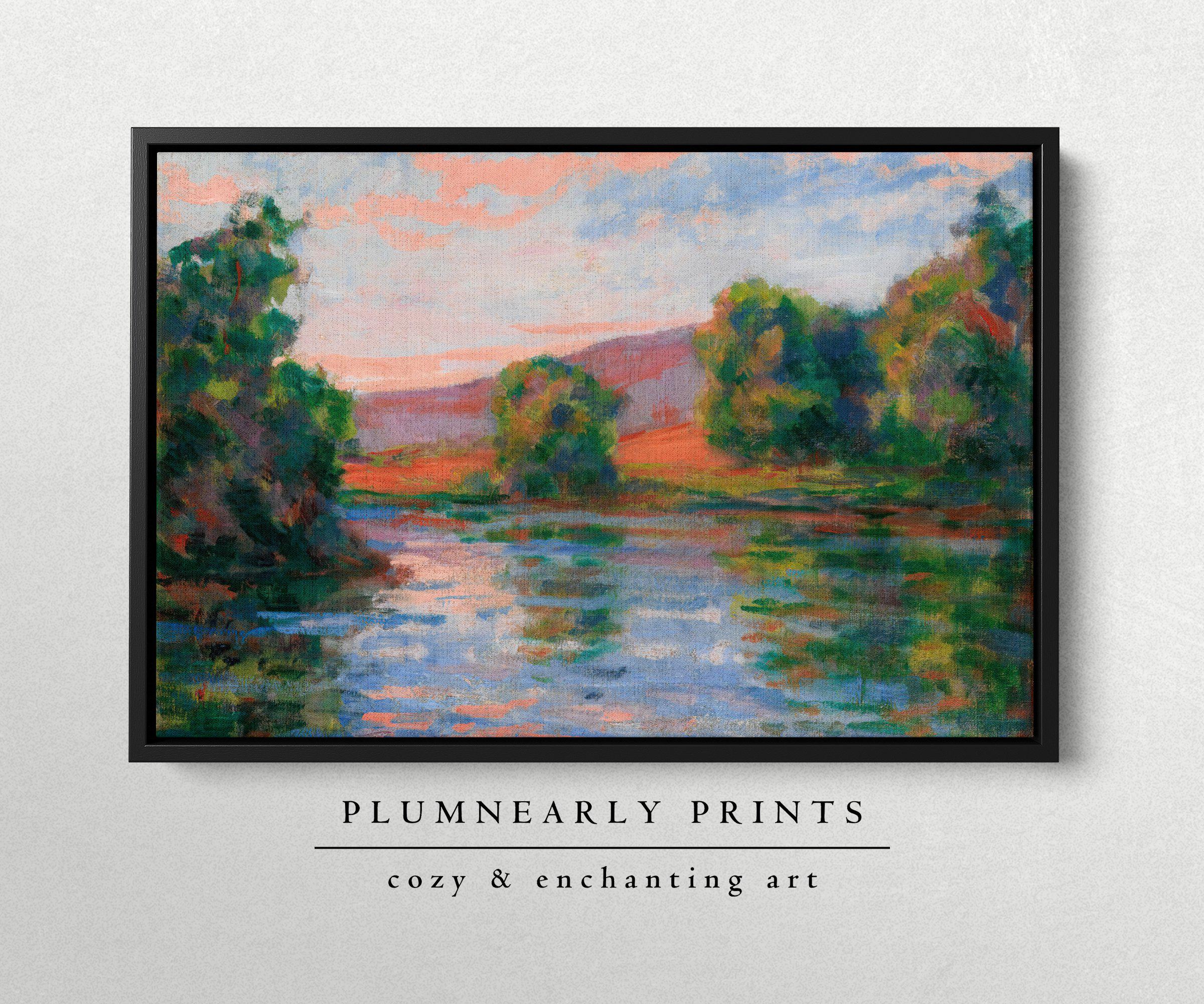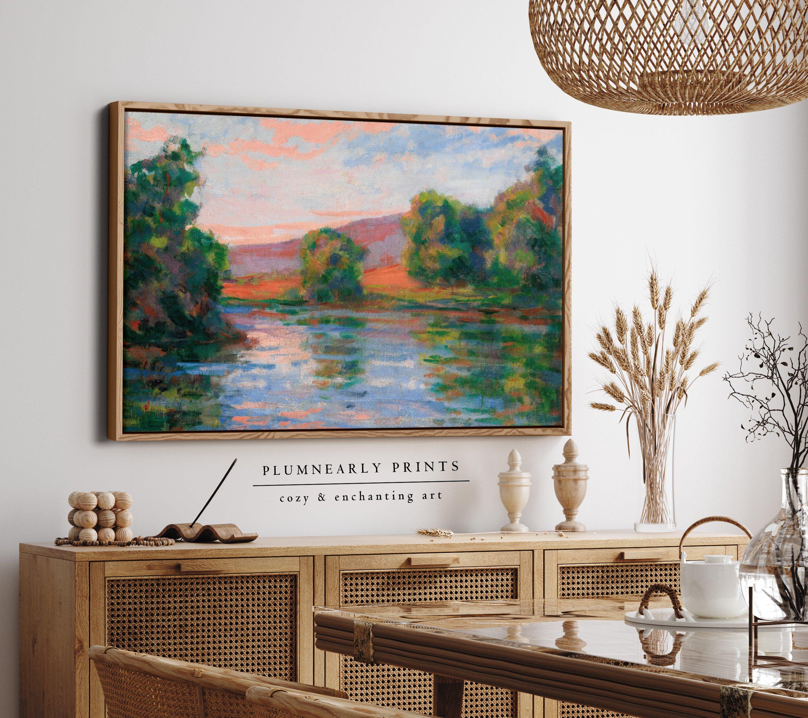 Guillaumin Lake Sunset Oil Painting Framed Canvas, Impressionist Landscape, Bold Aquamarine Icy Blue Tangerine Orange Frog Green Decor