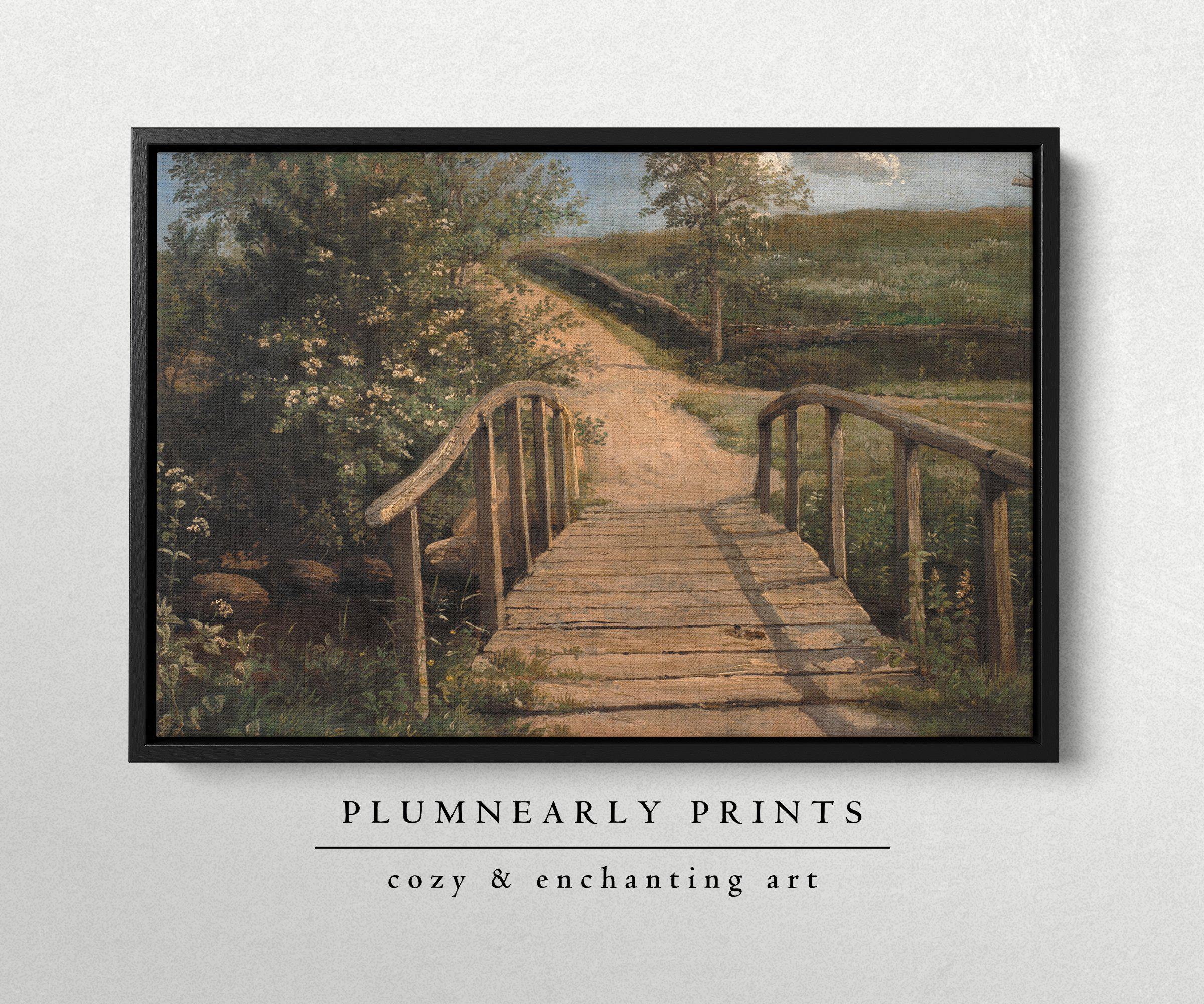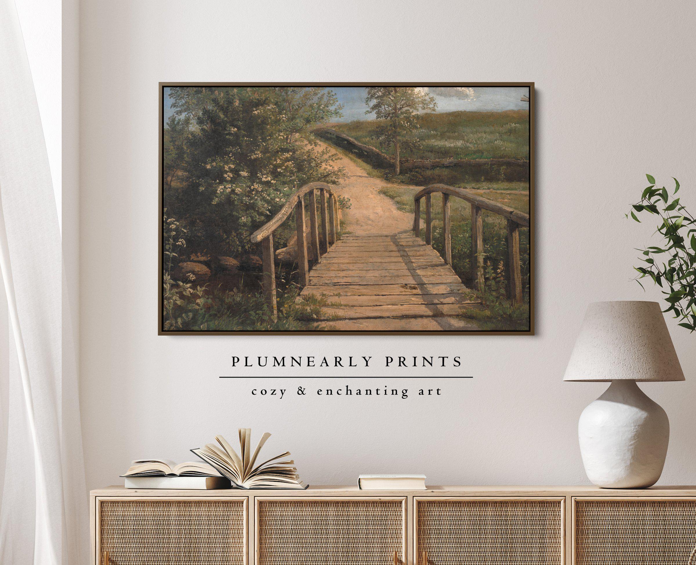 Dreyer Old Country Bridge Landscape Framed Canvas, Vintage Antique Rustic Farmhouse Oil Painting, Neutral Sage Green Taupe Wall Decor