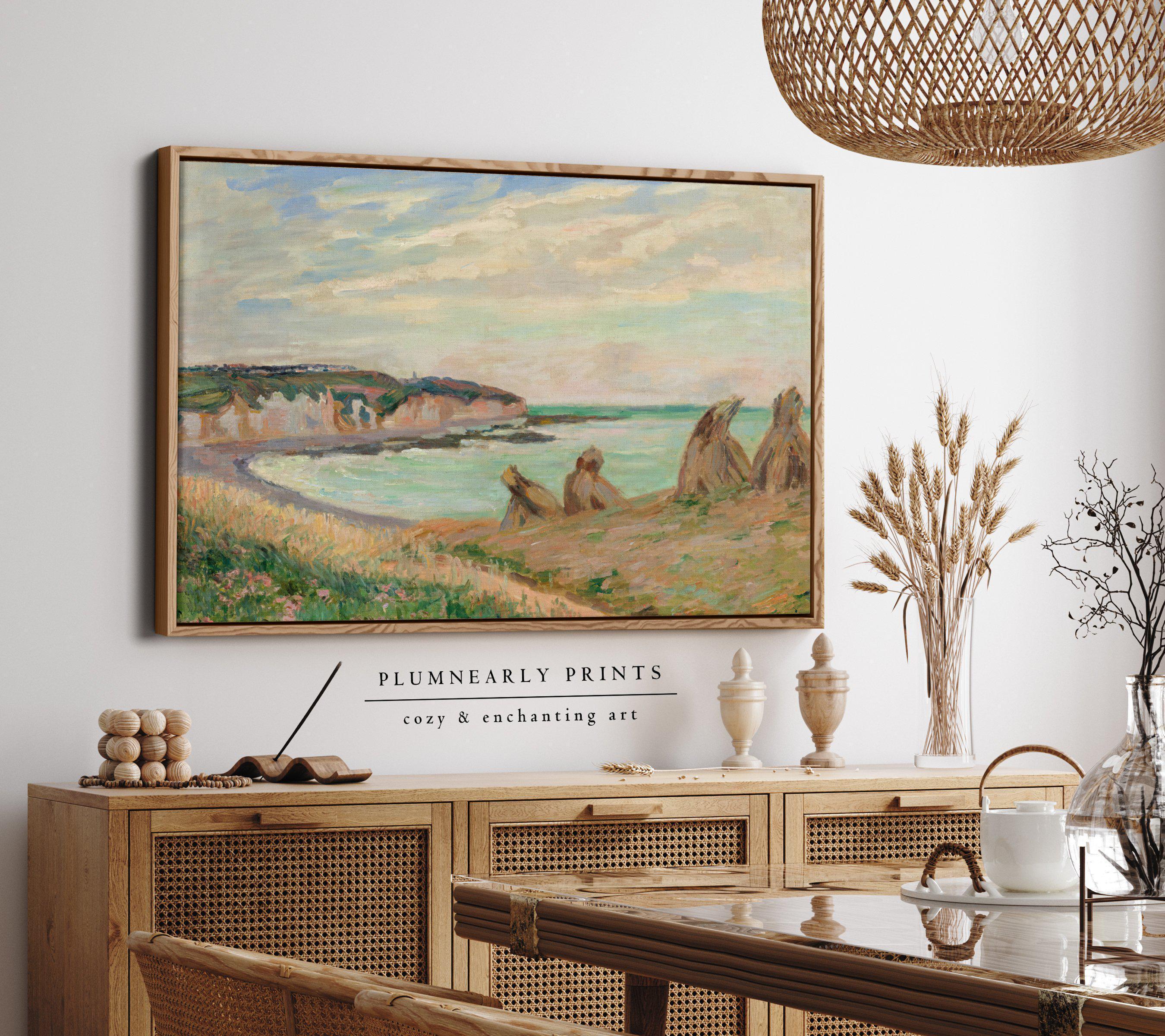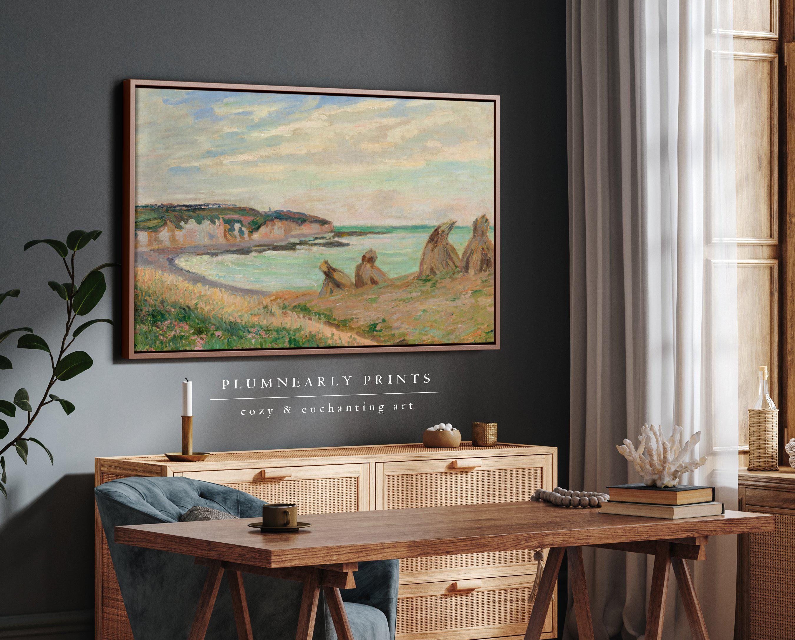 Guillaumin Pastel Coastal Landscape Framed Canvas, Vintage Impressionist Painting, Neutral Aquamarine Sea Blue Seaside Beach House Decor
