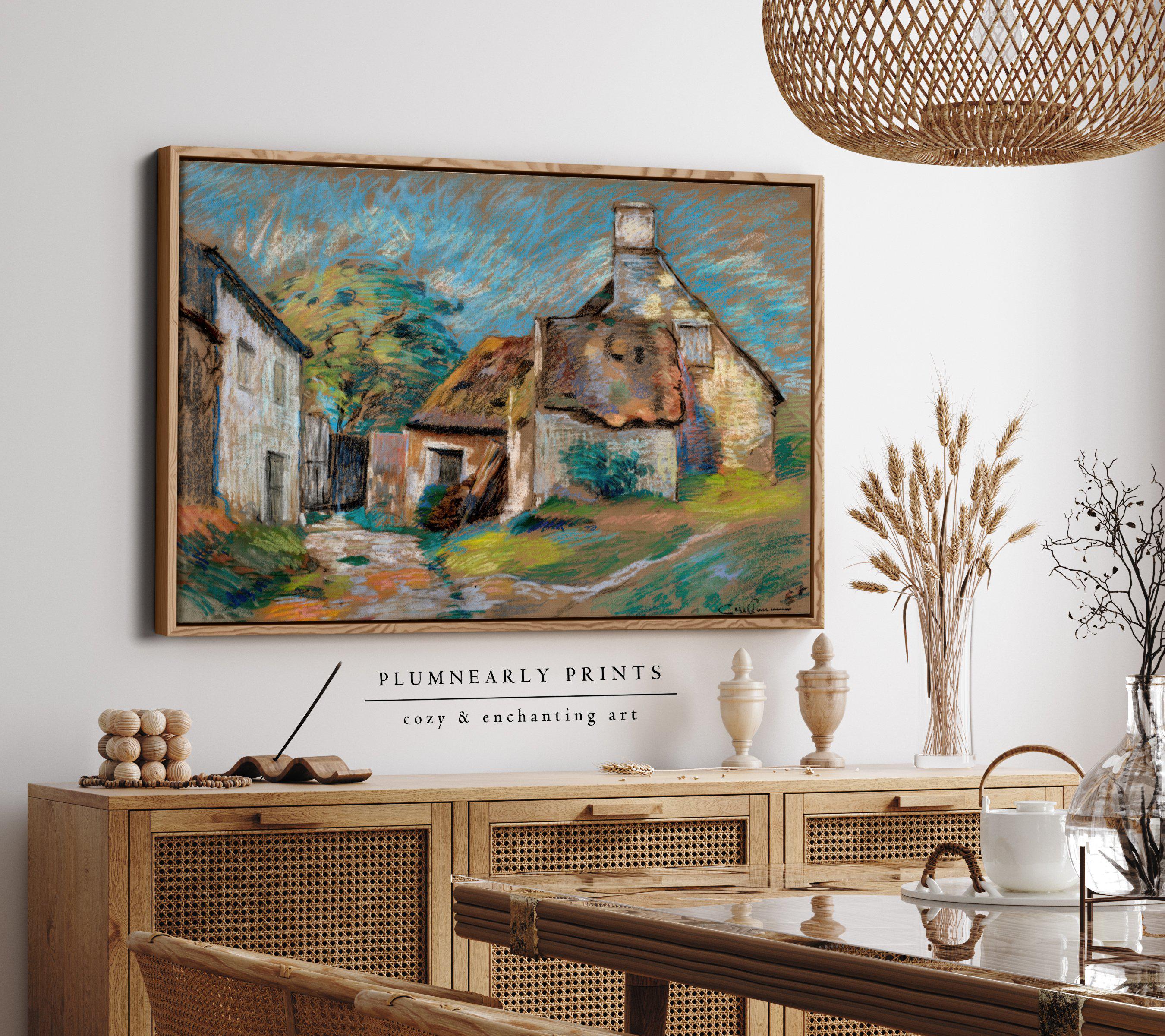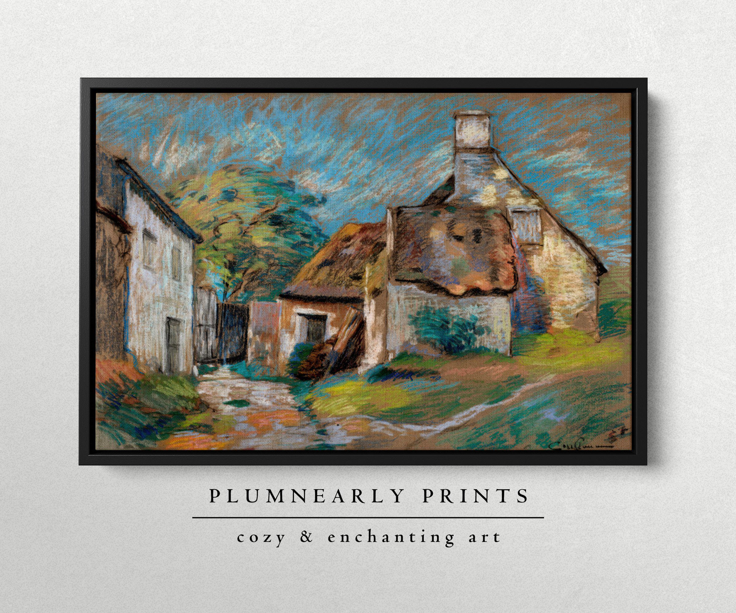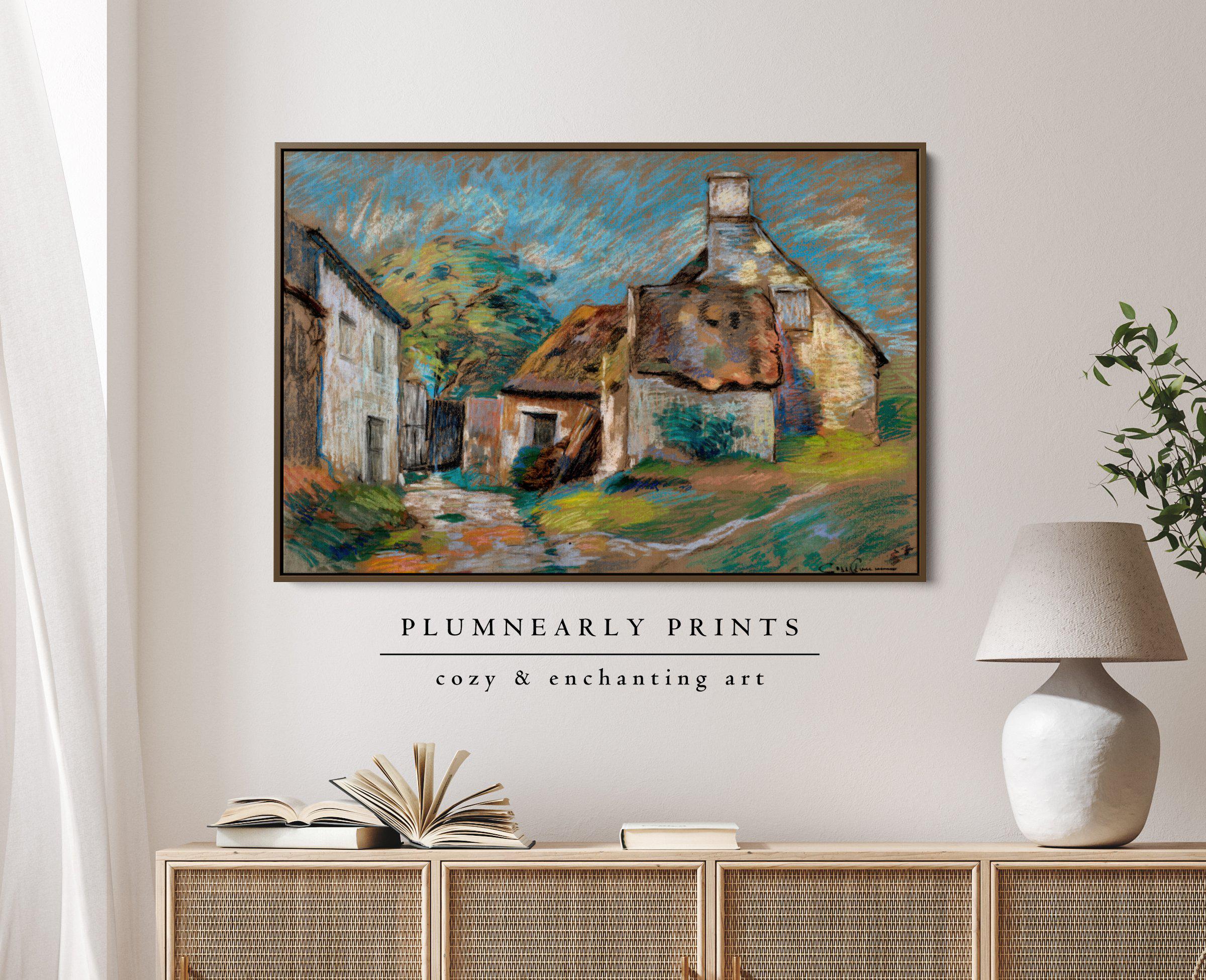 Guillaumin Pastel Village Landscape Framed Canvas, Vintage Impressionist French Country Cottage, Bold Maximalist White Icy Blue Decor