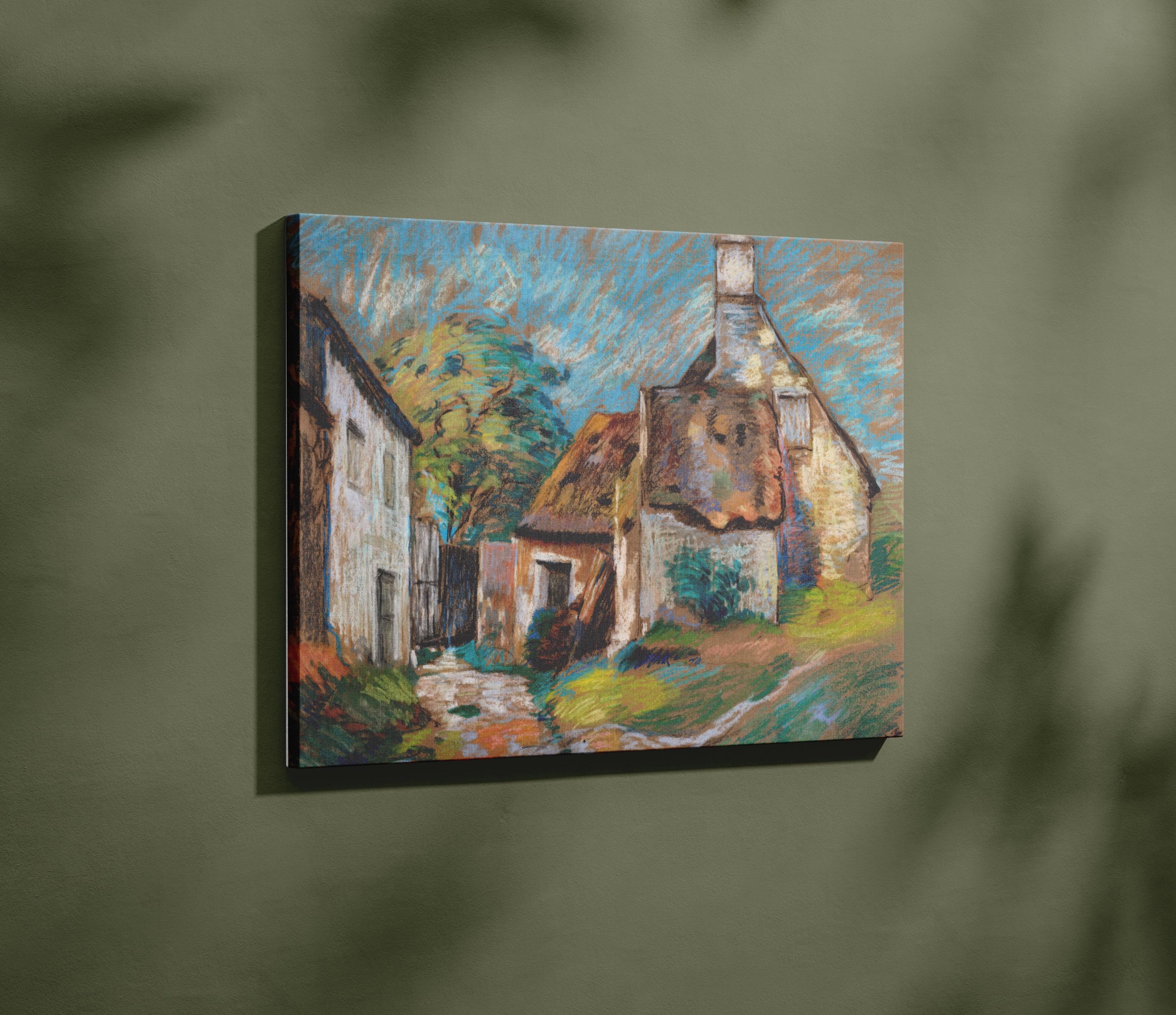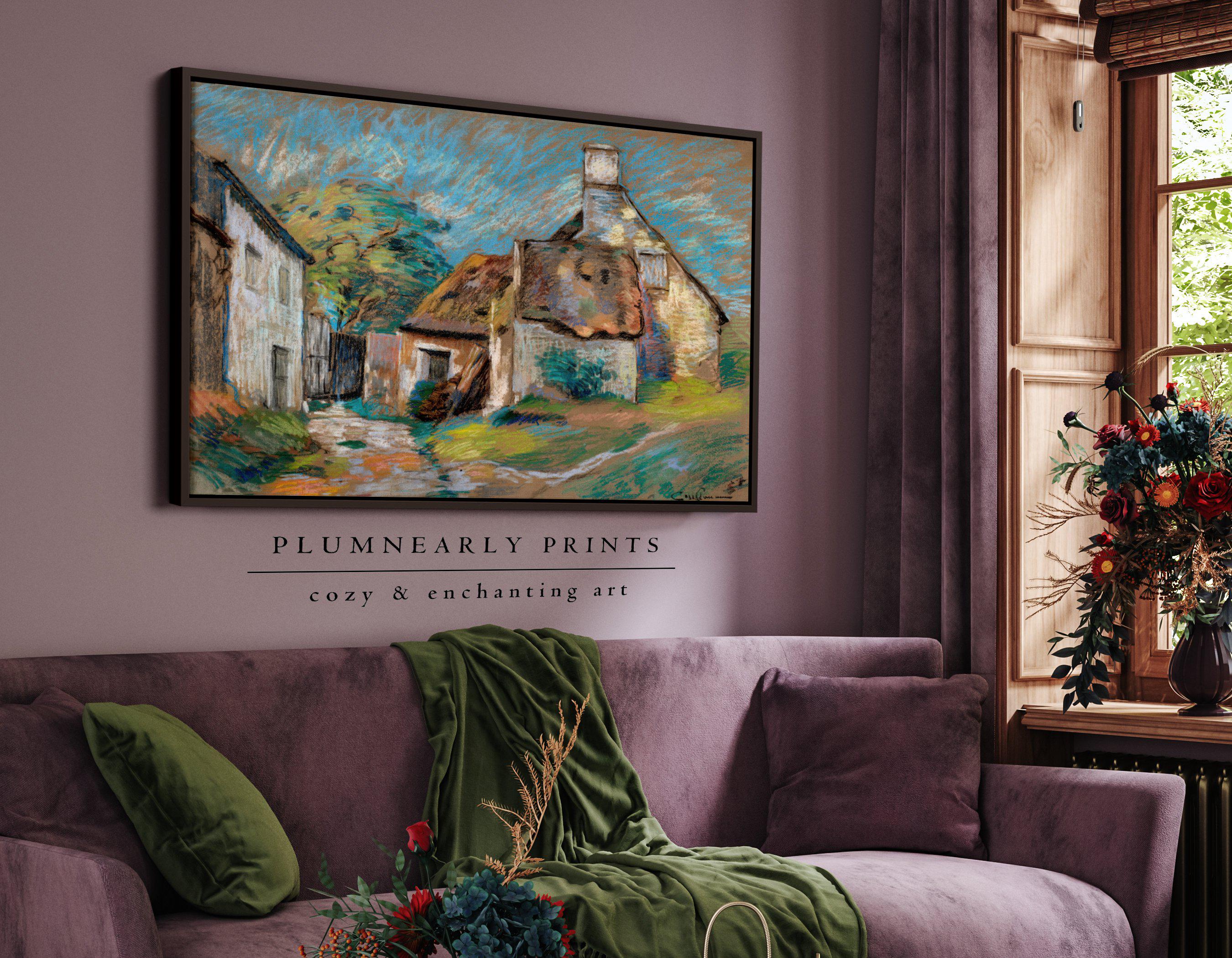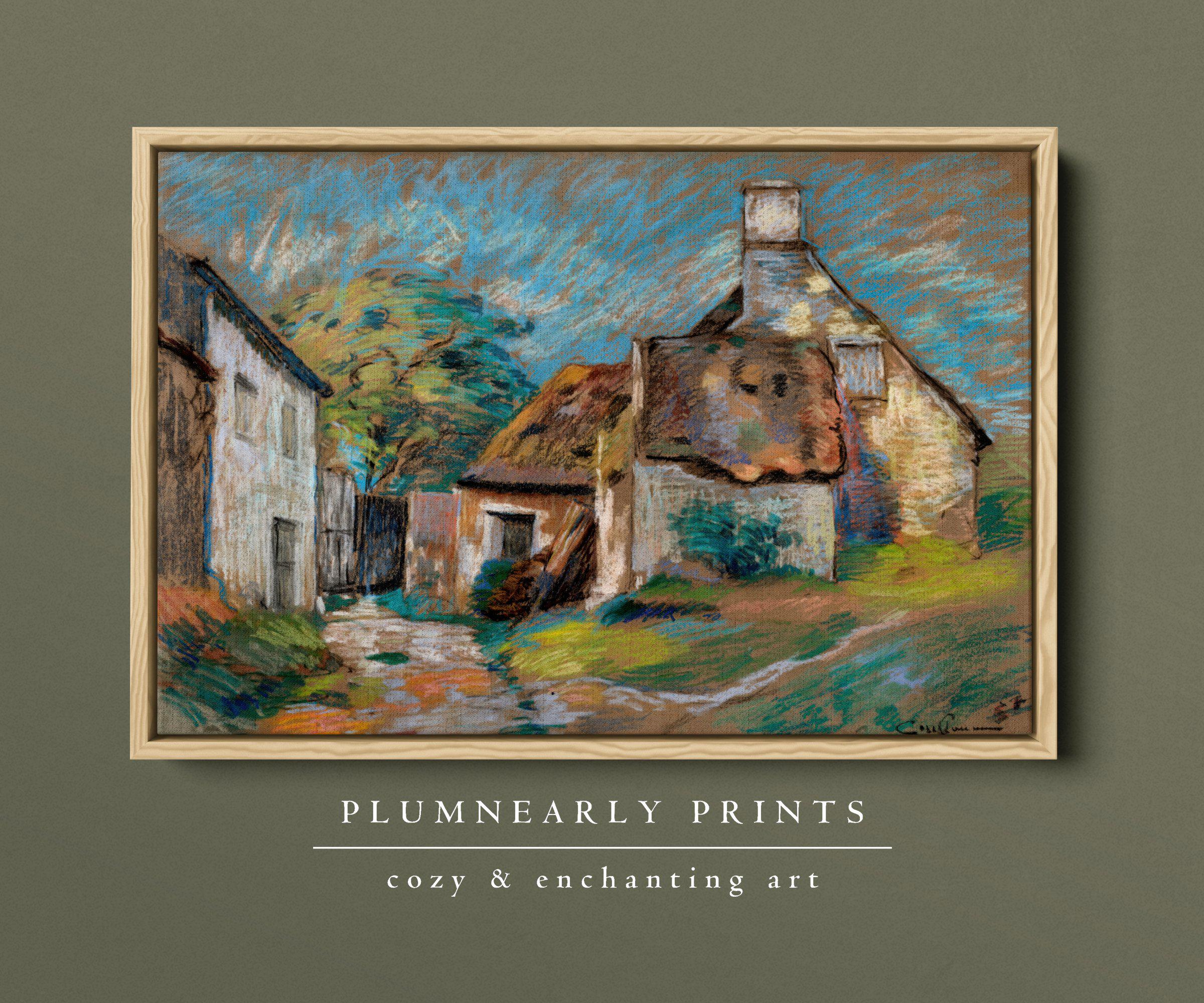 Guillaumin Pastel Village Landscape Framed Canvas, Vintage Impressionist French Country Cottage, Bold Maximalist White Icy Blue Decor