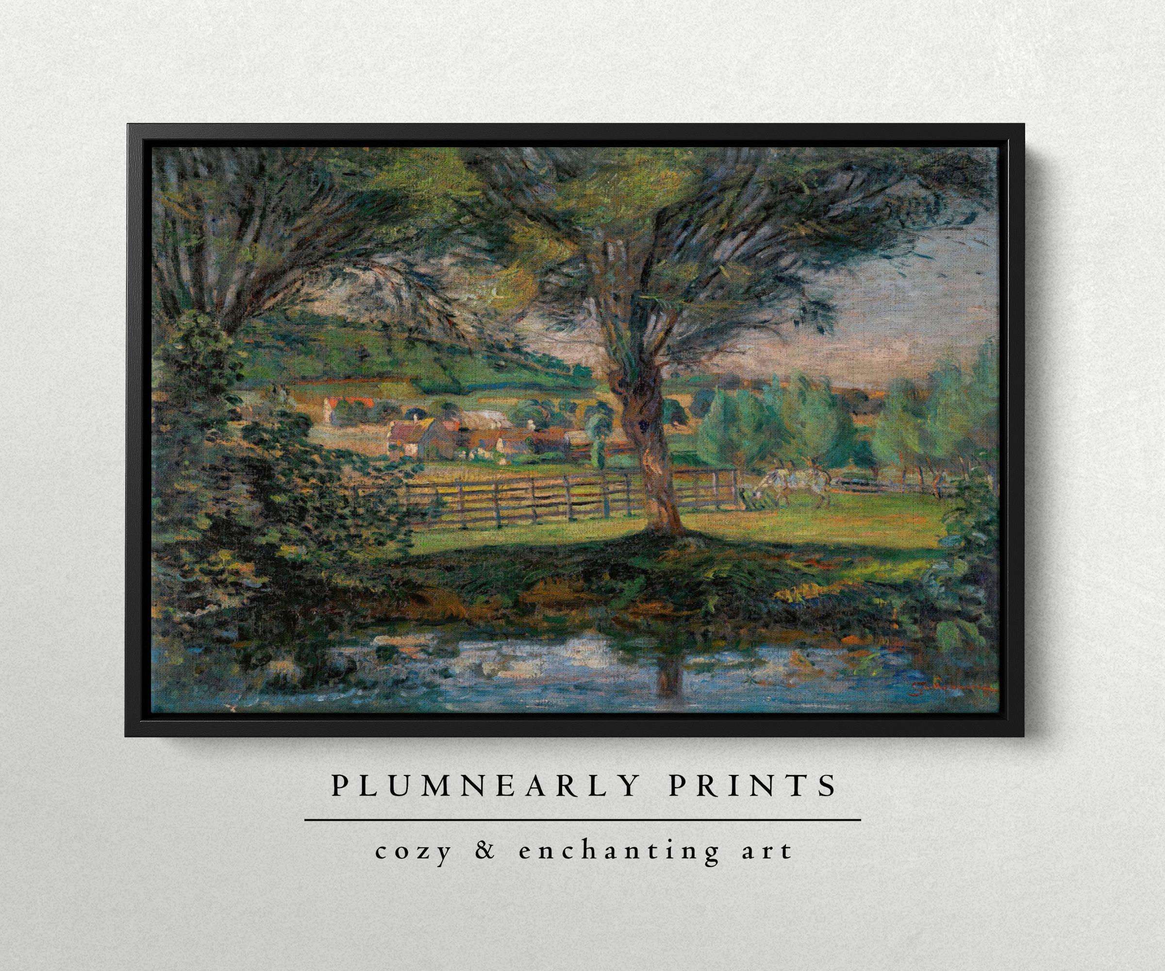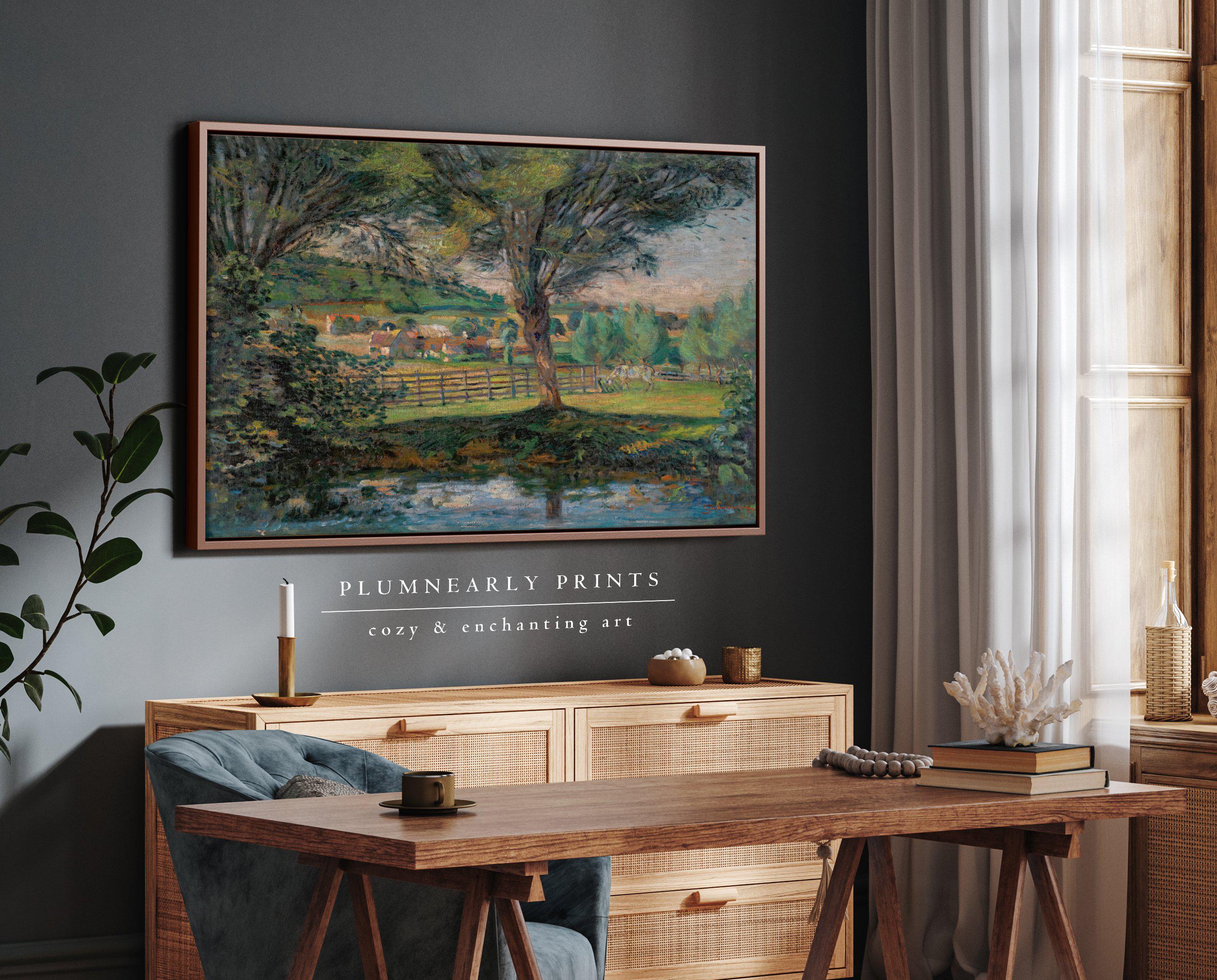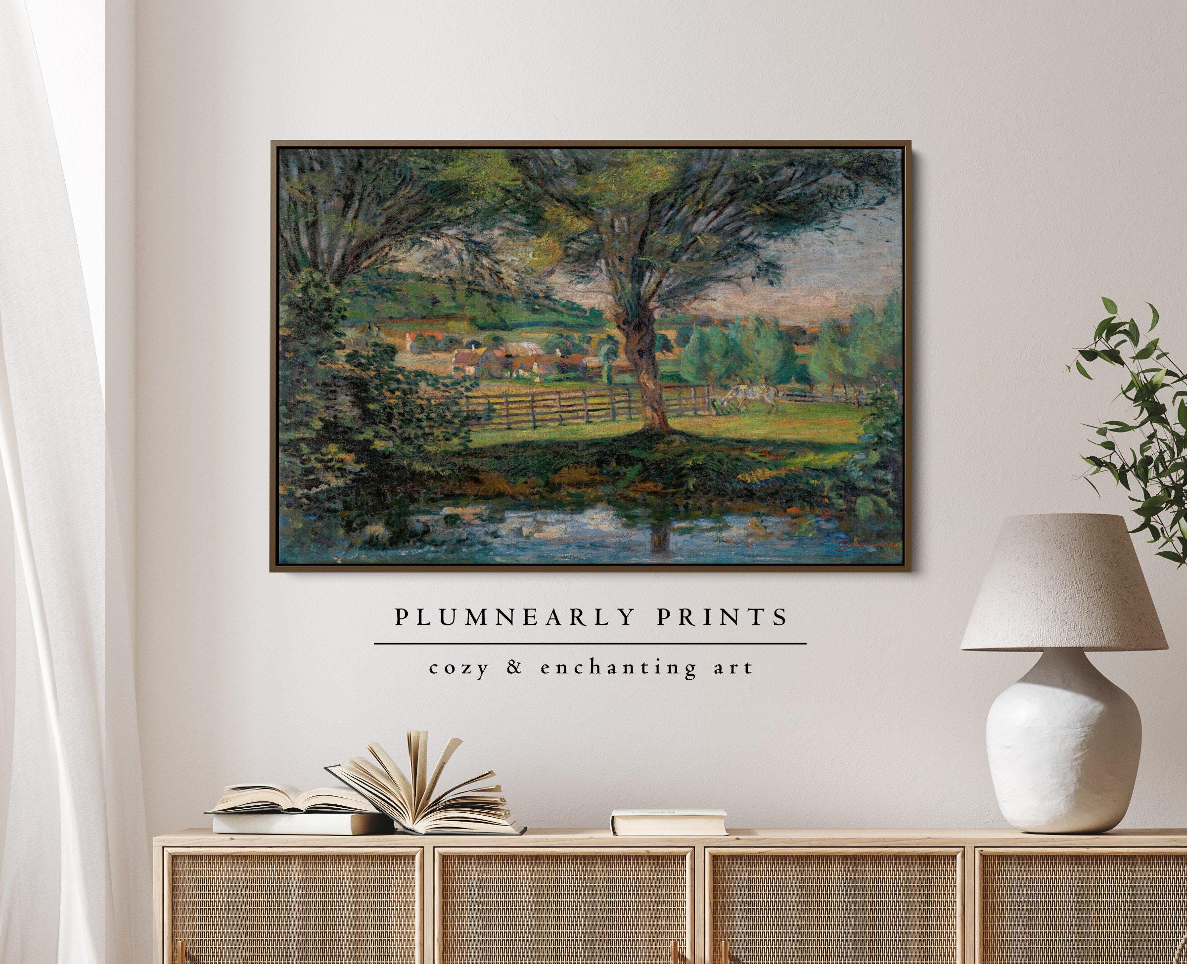 Guillaumin French Countryside Landscape Framed Canvas, Vintage Impressionist Nature Oil Painting, Chartreuse Sage Frog Green Wall Decor
