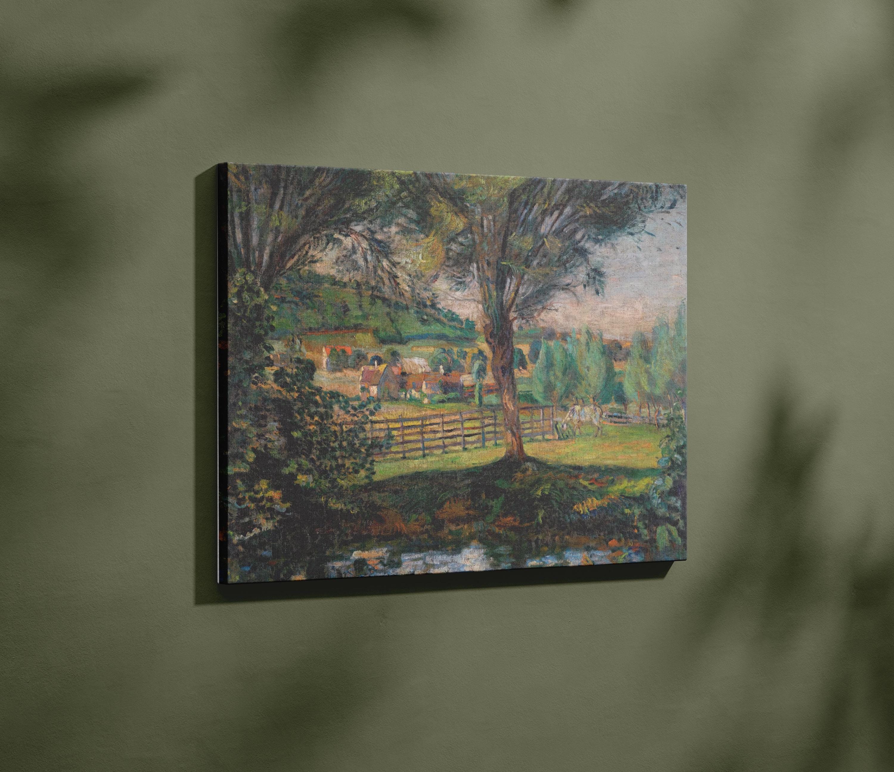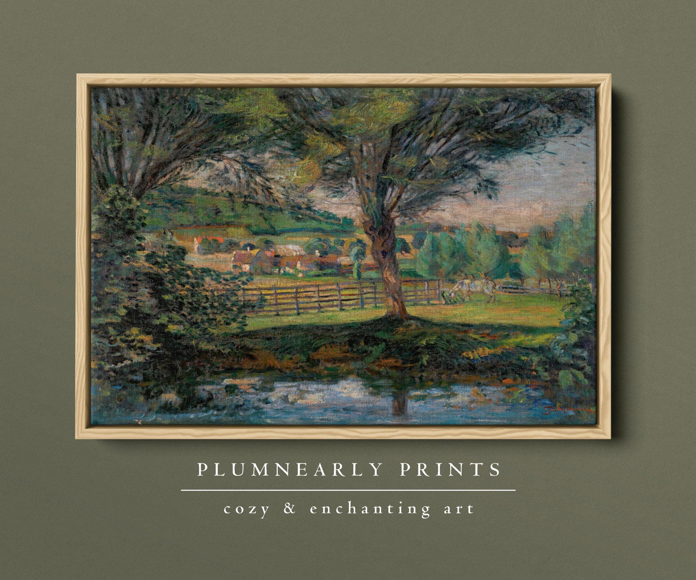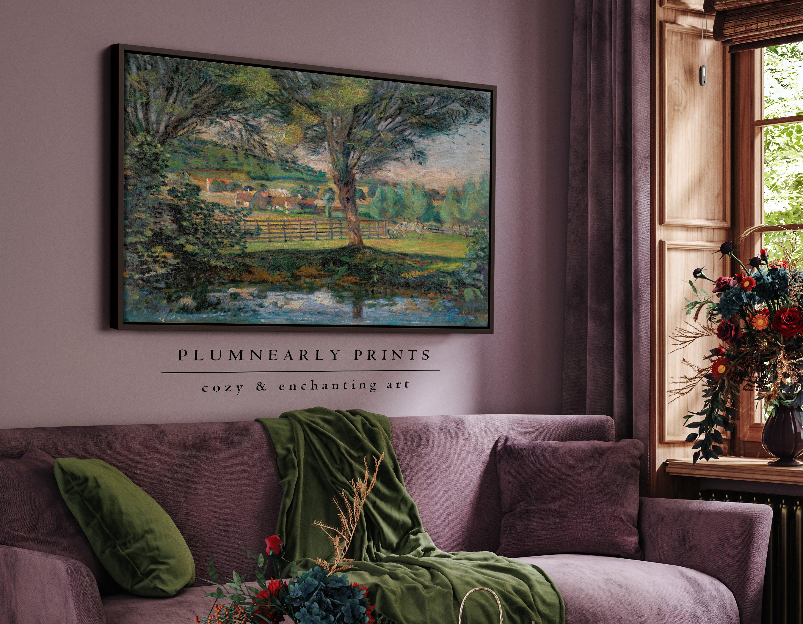 Guillaumin French Countryside Landscape Framed Canvas, Vintage Impressionist Nature Oil Painting, Chartreuse Sage Frog Green Wall Decor