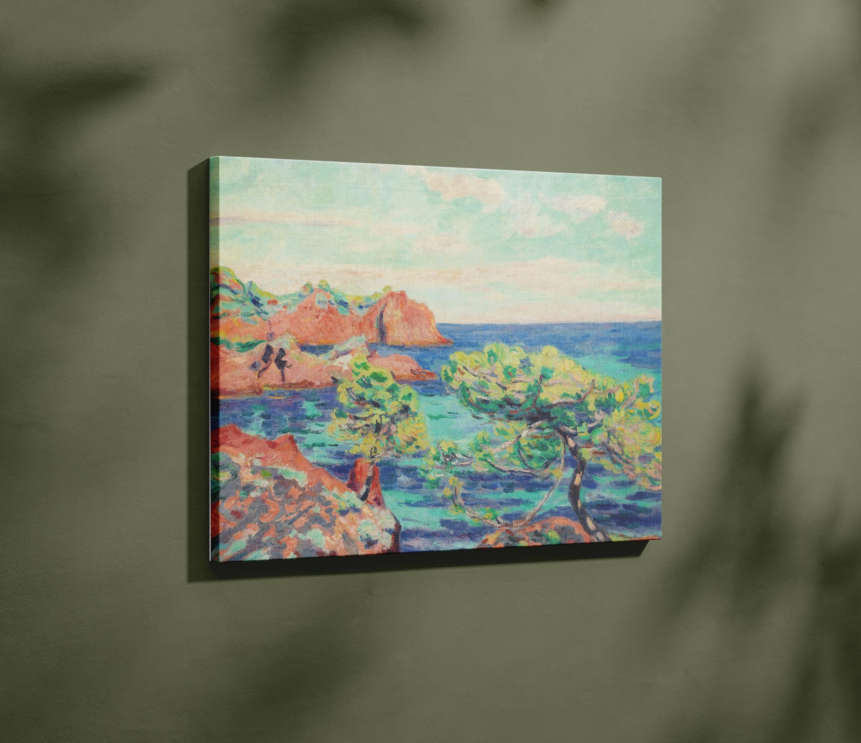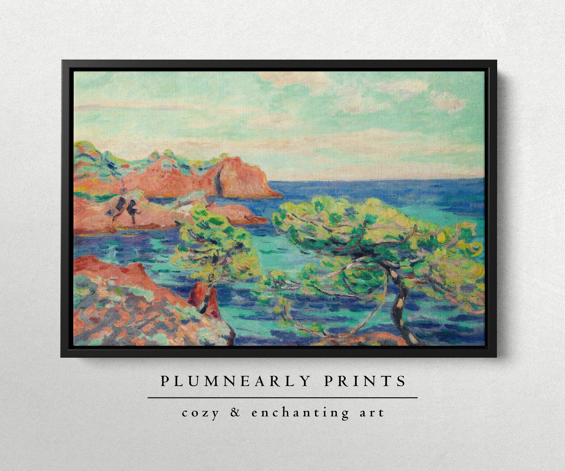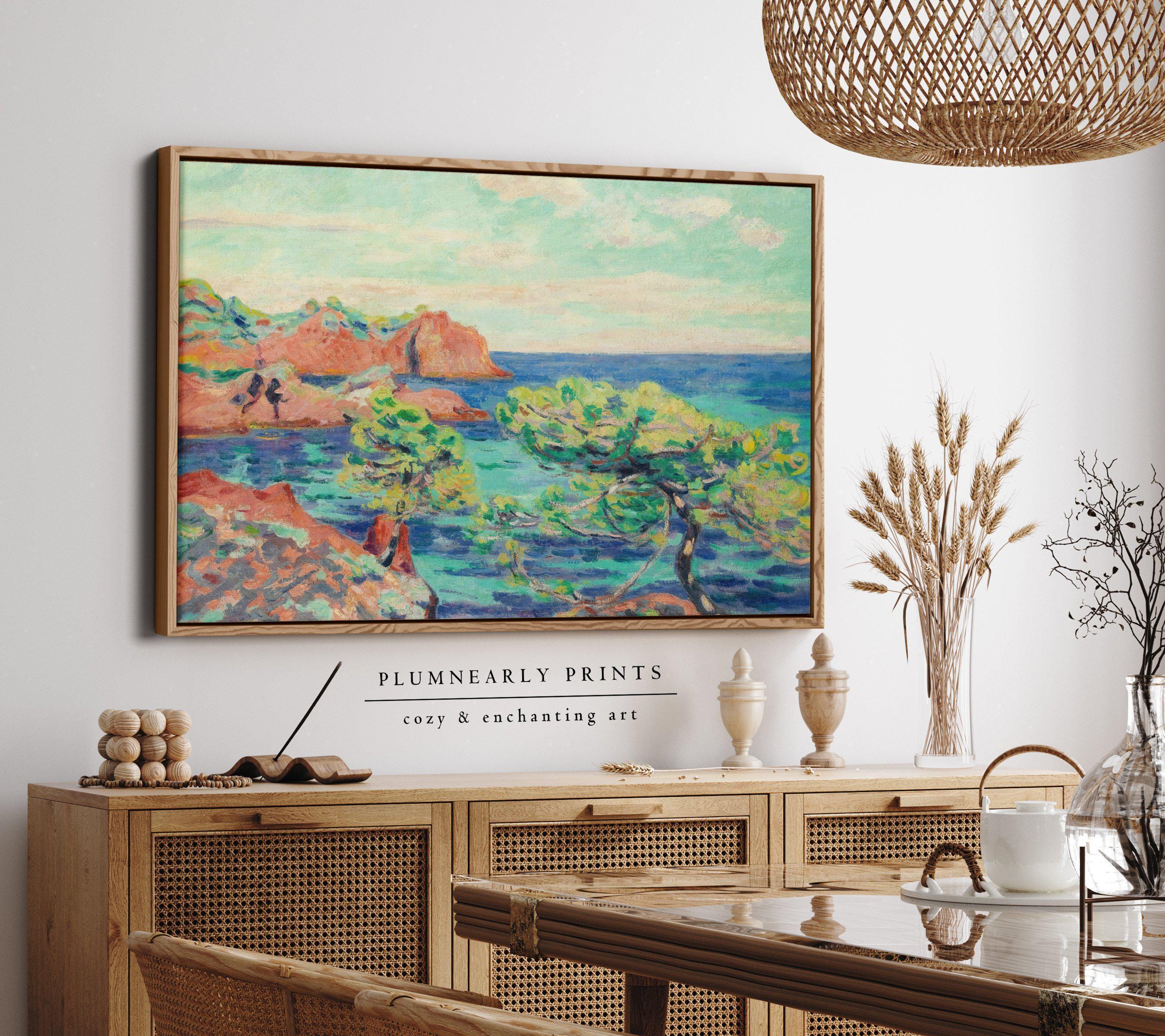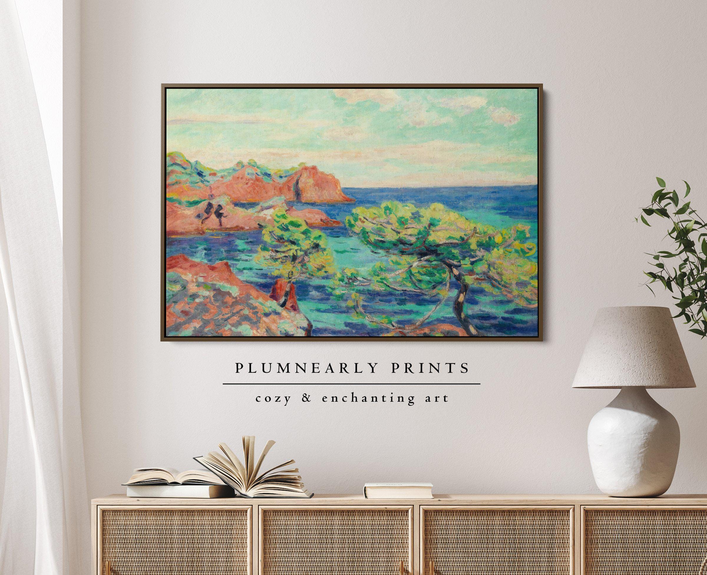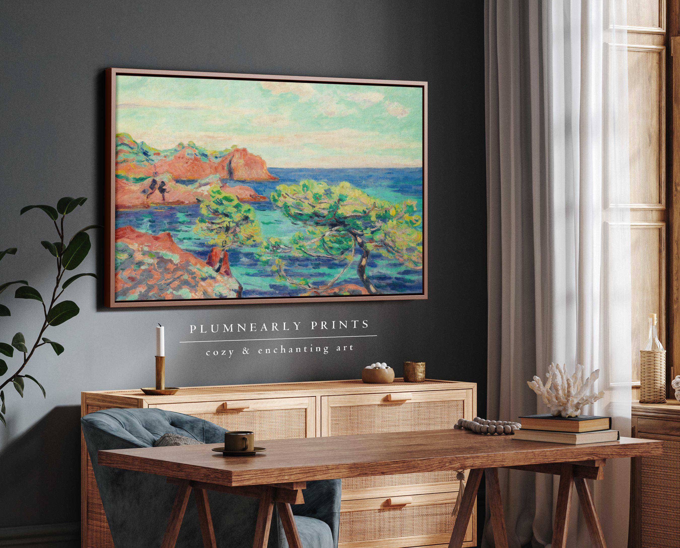 Guillaumin Coastal Cliffs Oil Painting Framed Canvas, Maximalist Aquamarine Ocean Sea Blue Tangerine Orange Chartreuse Green Wall Decor