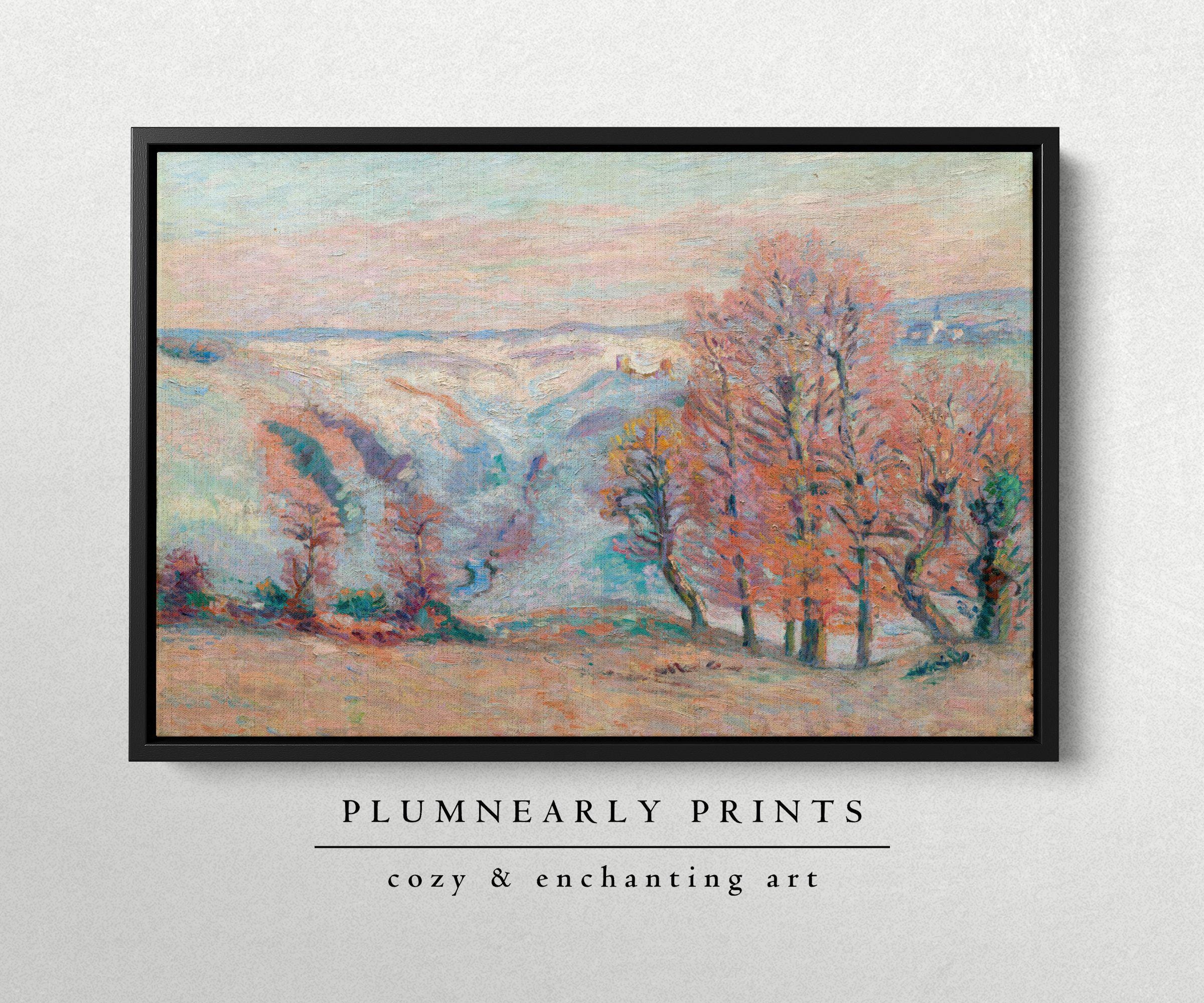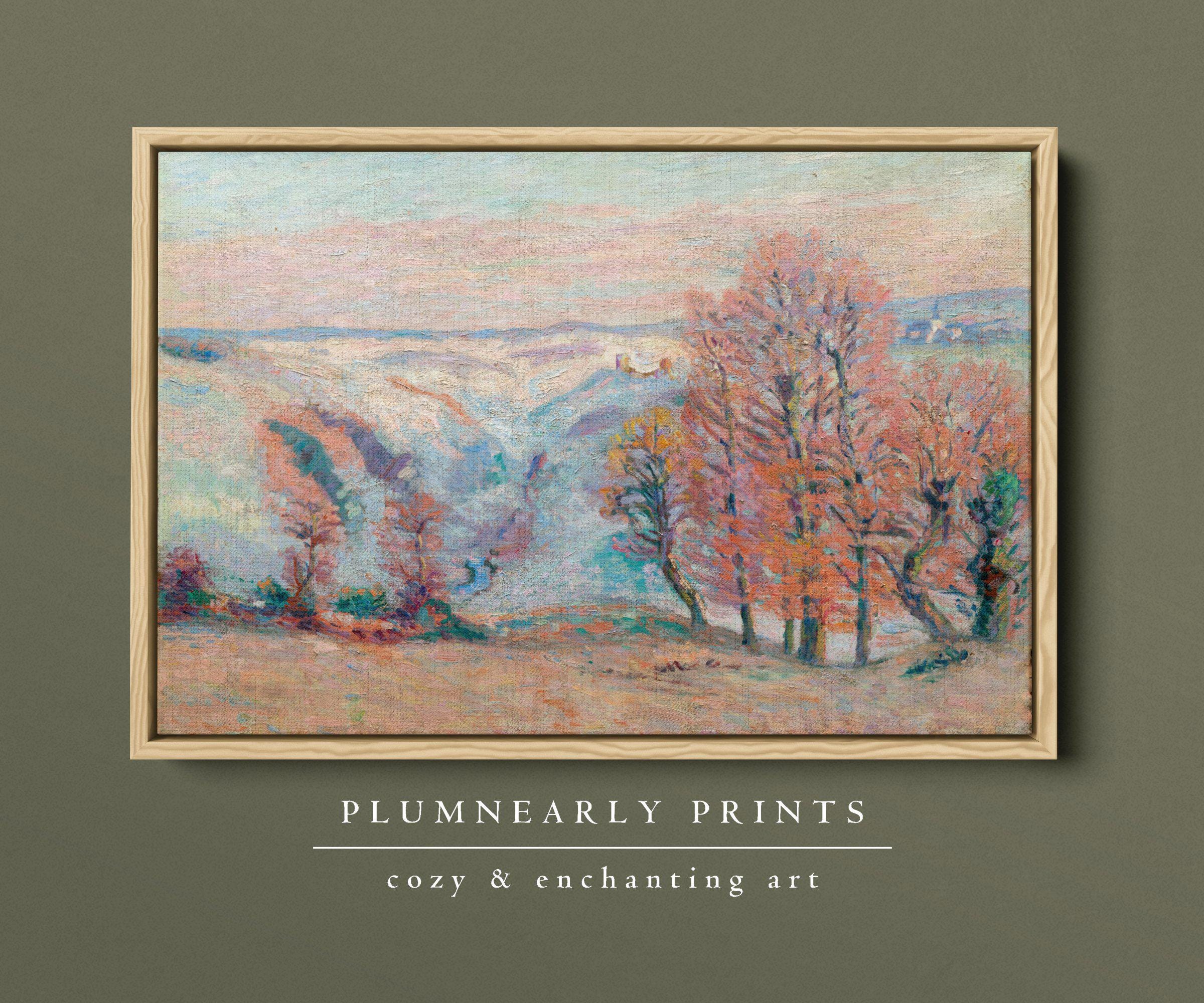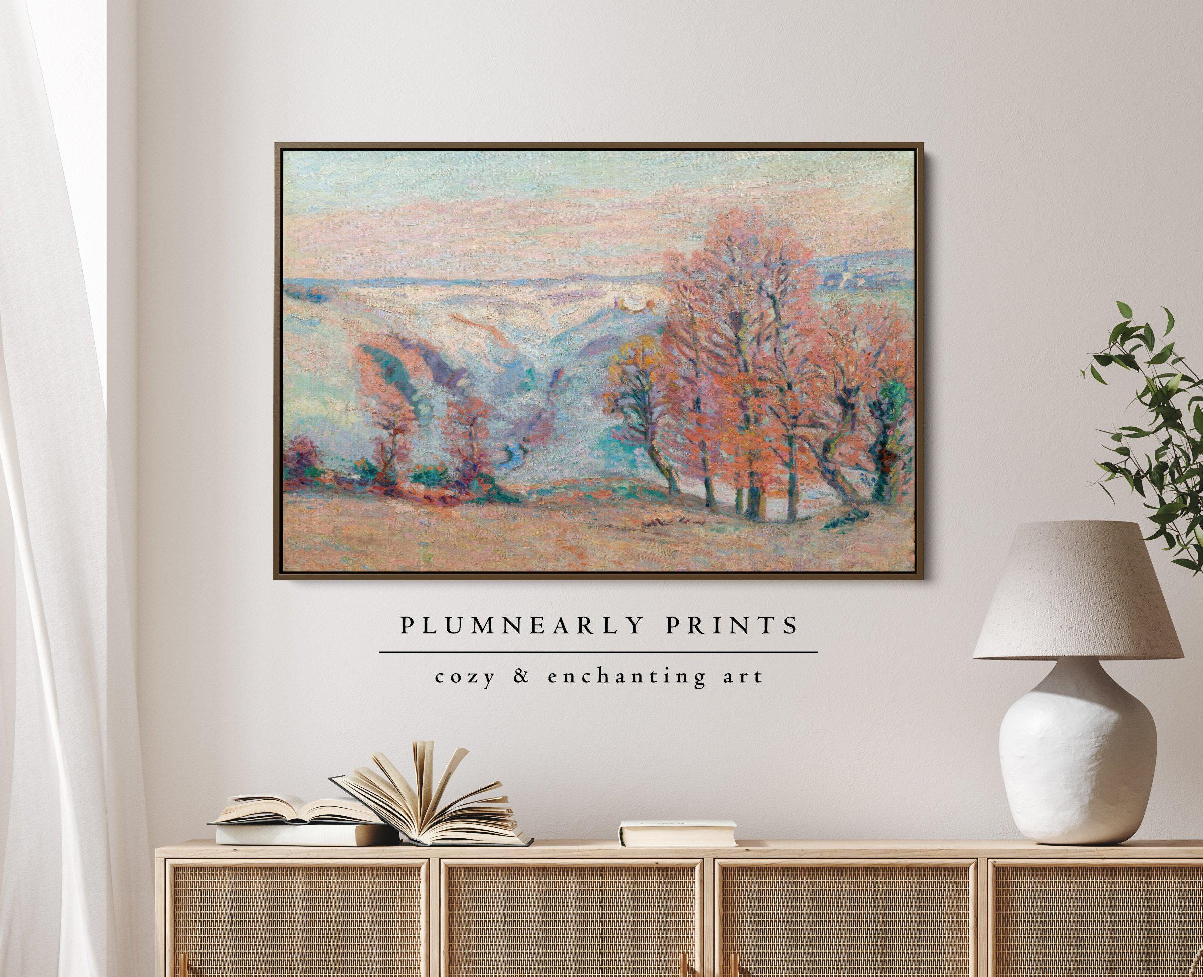 Guillaumin Ethereal Pastel Spring Landscape Framed Canvas, Aquamarine Icy Blue Bubblegum Powder Pink Tangerine Orange Oil Painting Décor