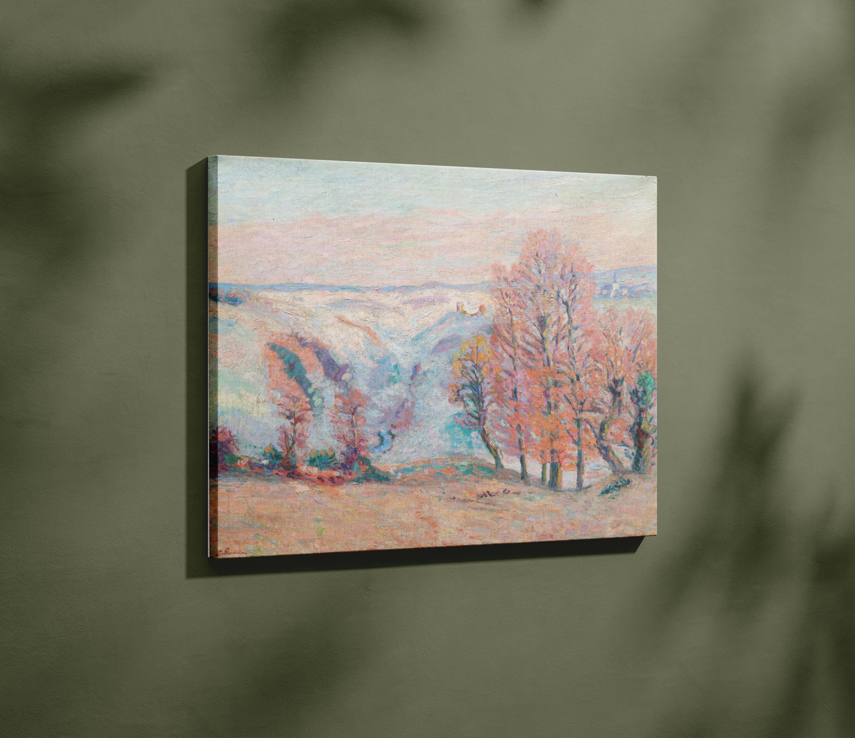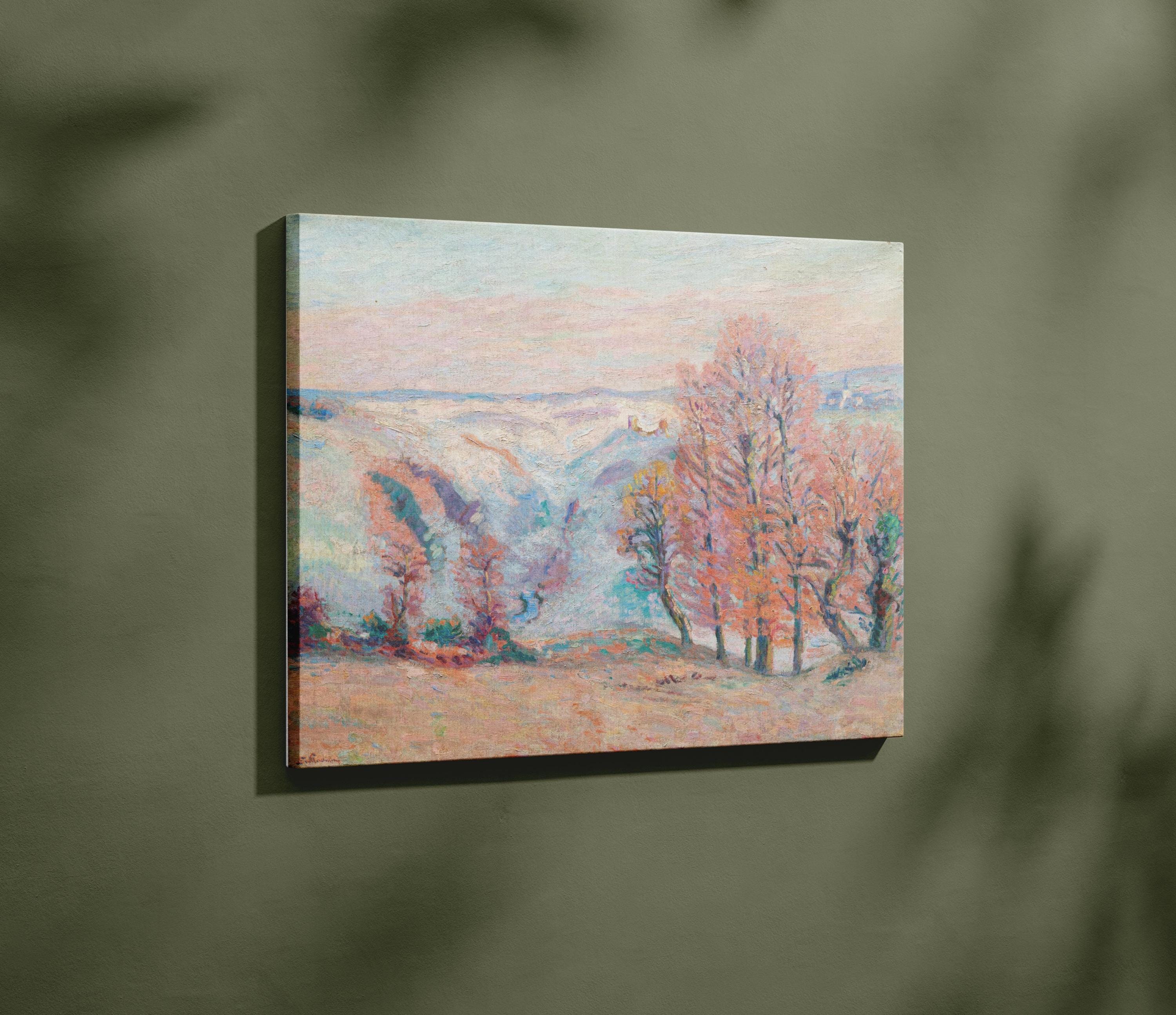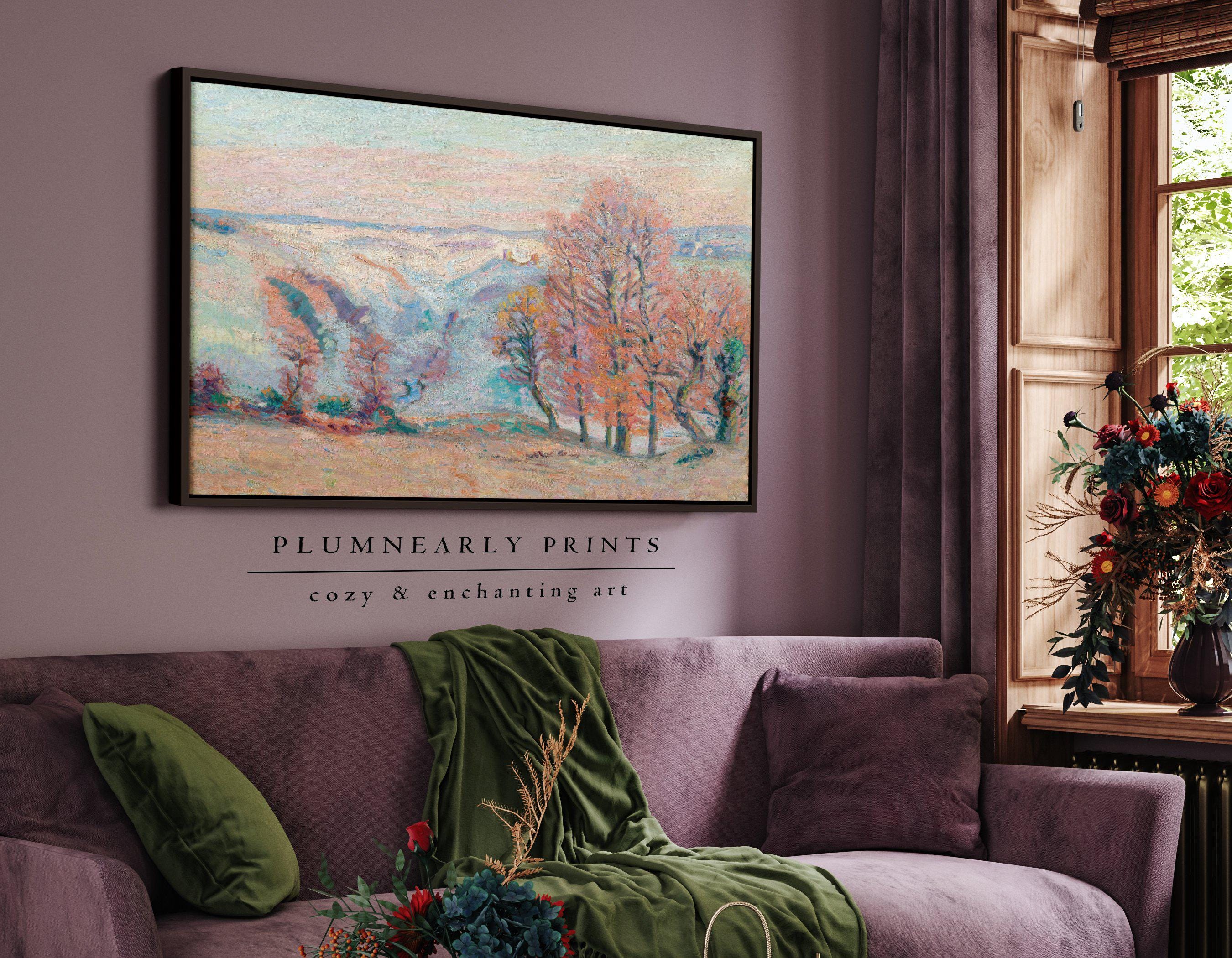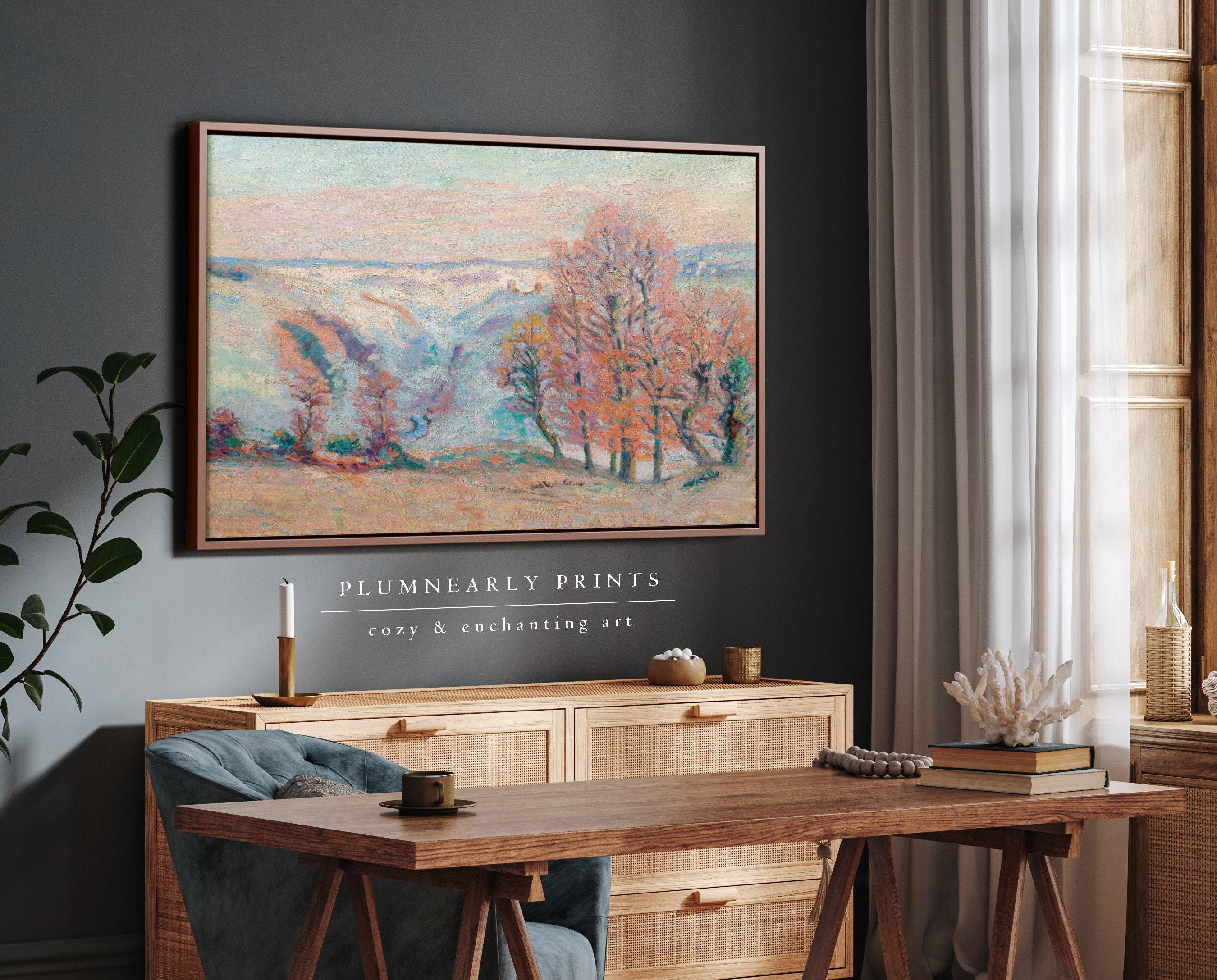 Guillaumin Ethereal Pastel Spring Landscape Framed Canvas, Aquamarine Icy Blue Bubblegum Powder Pink Tangerine Orange Oil Painting Décor