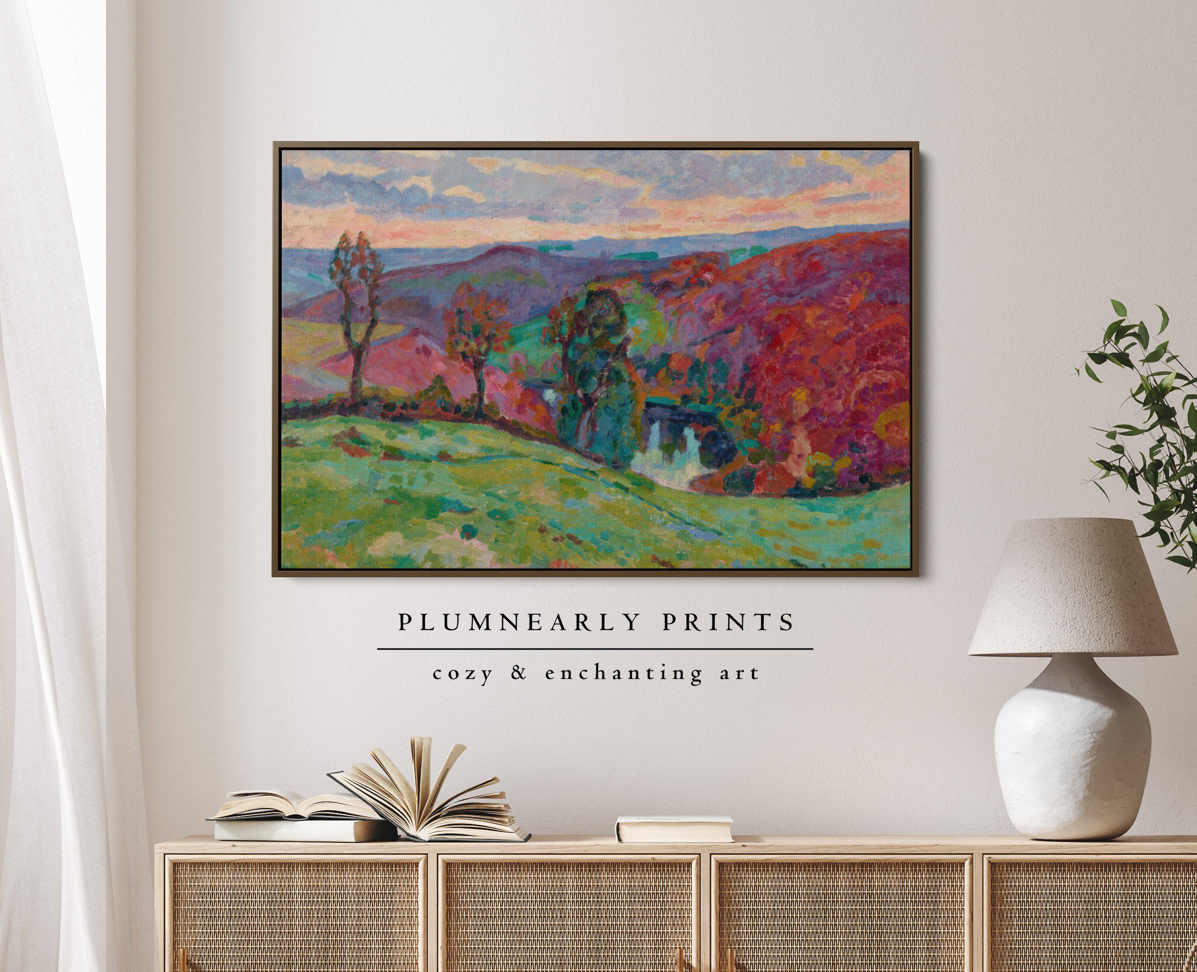 Guillaumin Vibrant Autumn Hill Landscape Framed Canvas, Bold Chartreuse Green Cherry Red Periwinkle Mauve Fig Purple Painting Wall Decor