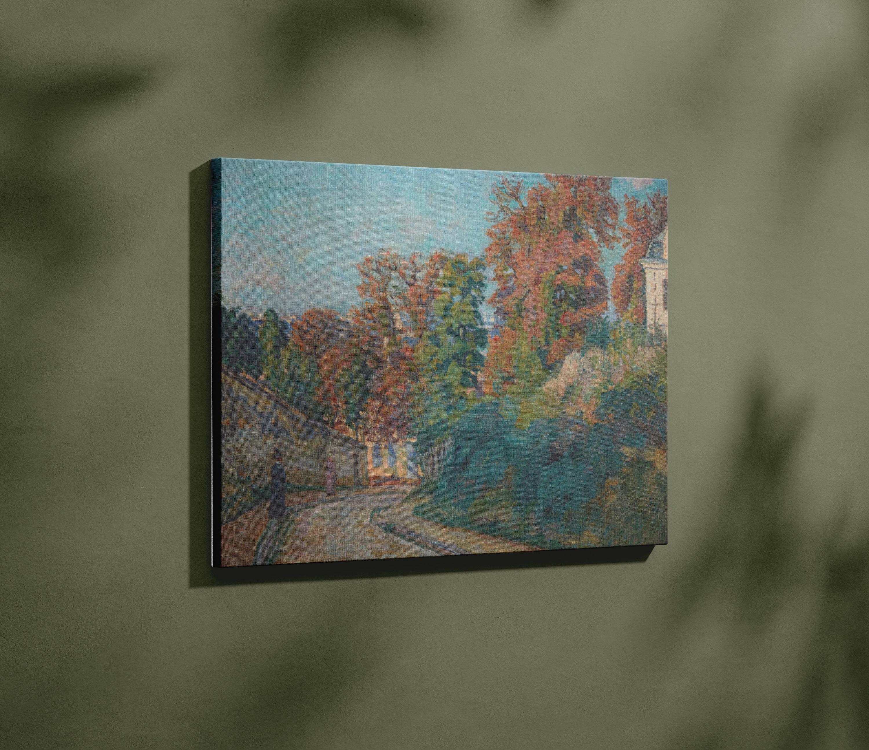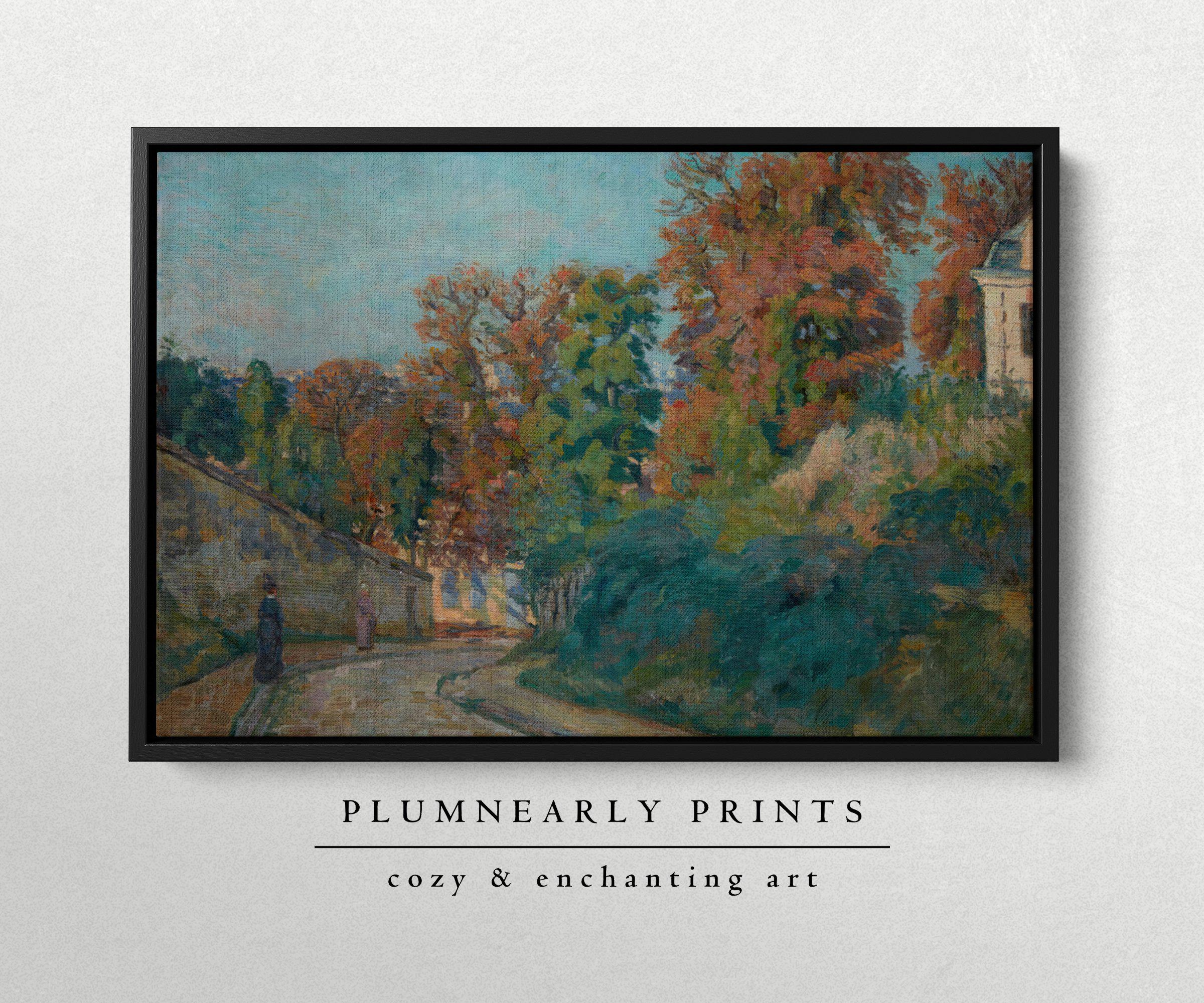 Guillaumin Autumn Road Framed Canvas, Vintage Fall Tree Landscape, Warm Cinnamon Sage Green Decor, Romantic French Country Neutral Art